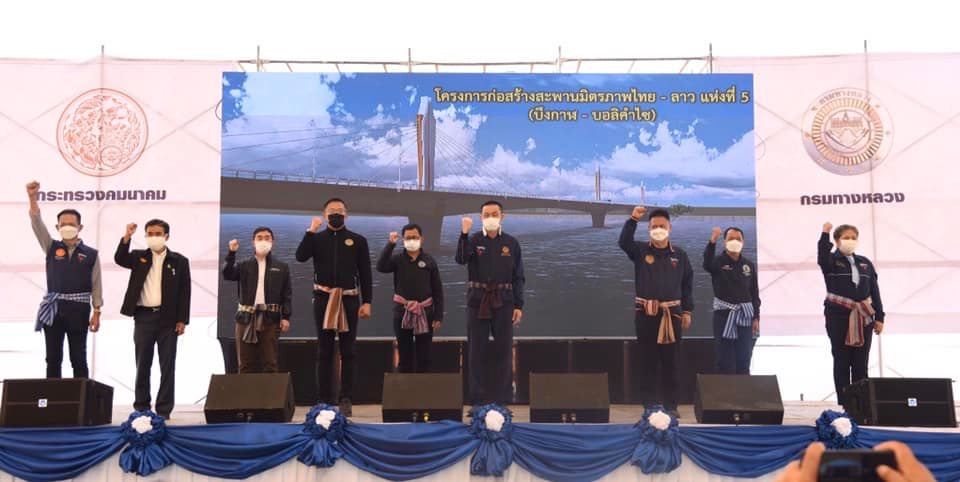 1. โครงการก่อสร้างสะพานมิตรภาพไทย - ลาว แห่งที่ 5 (บึงกาฬ - บอลิคำไซ) พร้อมโครงข่าย เป็นการพัฒนาโครงข่ายทางหลวงเชื่อมโยงกับประเทศเพื่อนบ้าน ภายใต้กรอบความร่วมมือทางเศรษฐกิจในอนุภูมิภาคลุ่มแม่น้ำโขง (Greater Mekong Subregion: GMS) ซึ่งดำเนินการโดย สำนักบริหารโครงการทางหลวงระหว่างประเทศ ทล. รวมระยะทาง 16.18 กิโลเมตร แบ่งเป็นถนนฝั่งไทย ระยะทาง 13 กิโลเมตร และถนนฝั่ง สปป.ลาว ระยะทาง 3.18 กิโลเมตร การออกแบบโครงสร้างได้นำเสาหลักของสะพาน (Pylon) มาประยุกต์ระหว่างโครงสร้างกับ “แคน” ซึ่งเป็นเครื่องดนตรีท้องถิ่น เพื่อแสดงถึงวัฒนธรรมของชุมชนในภูมิภาคลุ่มแม่น้ำโขง โดยรูปแบบการก่อสร้างเป็นสะพานคานขึงคอนกรีตอัดแรงรูปกล่อง ขนาด 2 ช่องจราจร มีไหล่ทางพร้อมทางเท้า ช่วงข้ามแม่น้ำโขง ระยะทาง 810 เมตร และงานทางลาดลงจากตัวสะพาน ความยาวถนนฝั่งไทย 410 เมตร ฝั่ง สปป.ลาว ความยาว 130 เมตร รวมความยาวสะพานทั้งหมด 1,350 เมตร มีด่านควบคุมทั้ง 2 ฝั่งประเทศ และมีจุดสลับทิศทางจราจรอยู่ในฝั่ง สปป.ลาว วงเงินก่อสร้าง 3,930 ล้านบาท ผลงานในภาพรวมของโครงการ ณ วันที่ 28 กุมภาพันธ์ 2565 มีความคืบหน้ารวม 36.704% เร็วกว่าแผน 0.643% คาดว่าจะเชื่อมต่อพื้นที่สะพานได้ประมาณกลางปี 2566 เปิดให้บริการได้ประมาณต้นปี 2567 โดยโครงการนี้ได้แบ่งออกเป็น 3 ส่วน ดังนี้