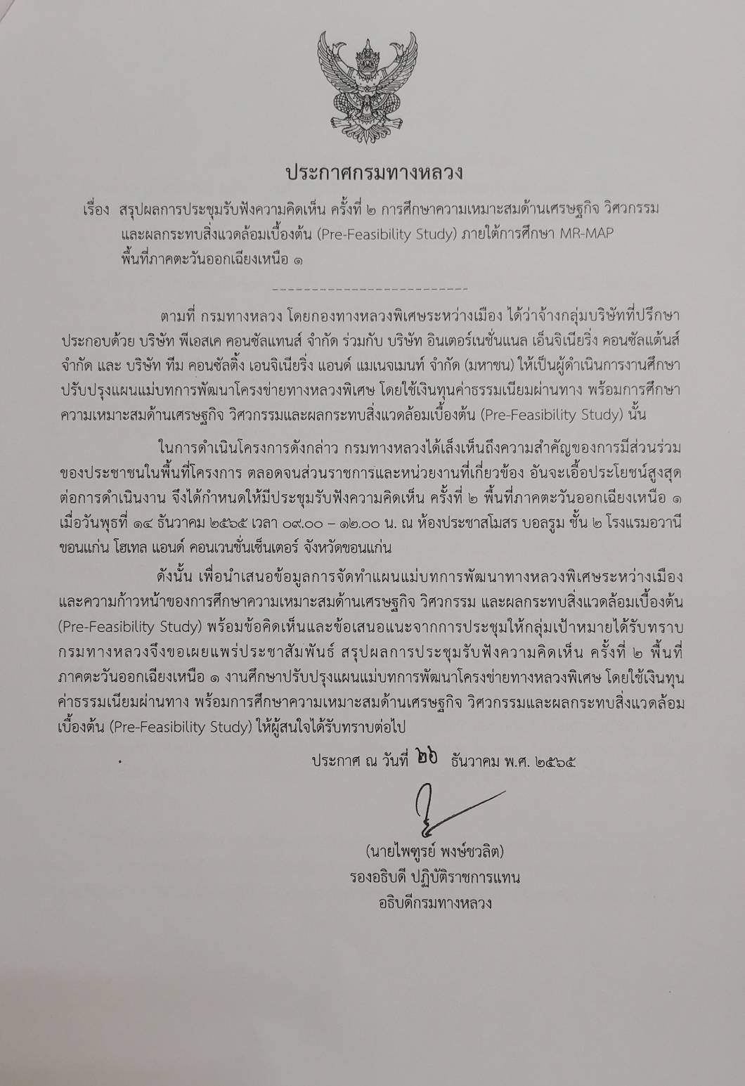 ประกาศ สรุปผลการประชุมรับฟังความคิดเห็น ครั้งที่ 2 "การศึกษาความเหมาะสมด้านเศรษฐกิจ วิศวกรรมและผลกระทบสิ่งแวดล้อมเบื้องต้น " ภายใต้การศึกษา MR-MAP พื้นที่ภาคตะวันออกเฉียงเหนือ ๑