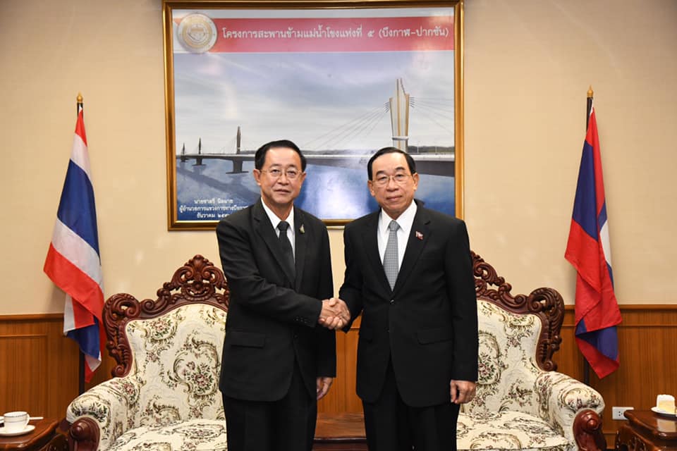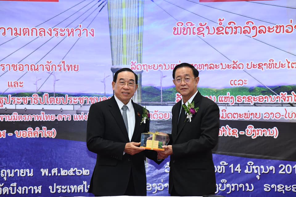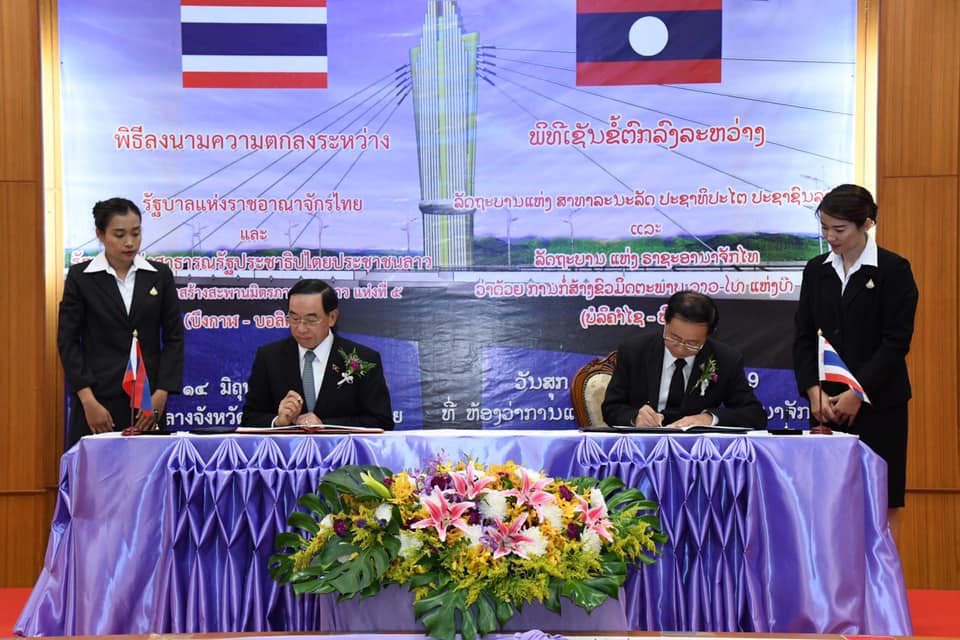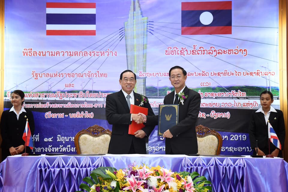 นายอาคม เติมพิทยาไพสิฐ รัฐมนตรีว่าการกระทรวงคมนาคม และ นายบุนจัน สินทะวง รัฐมนตรีว่าการกระทรวงโยธาธิการและขนส่ง แห่งสาธารณรัฐประชาธิปไตยประชาชนลาว (สปป.ลาว) เป็นประธานพิธีลงนามความตกลงระหว่างรัฐบาลแห่งราชอาณาจักรไทย กับรัฐบาล สปป.ลาว ว่าด้วยการก่อสร้างสะพานมิตรภาพไทย - ลาว แห่งที่ 5 (บึงกาฬ - บอลิคำไซ) โดยมี นายพิศักดิ์ จิตวิริยะวศิน รองปลัดกระทรวงคมนาคม นายอานนท์ เหลืองบริบูรณ์ อธิบดีกรมทางหลวง นายนิรัตน์ พงษ์สิทธิถาวร ผู้ว่าราชการจังหวัดบึงกาฬ คณะผู้บริหารกรมทางหลวง หัวหน้าหน่วยงาน เจ้าหน้าที่สังกัดกระทรวงฯ ในพื้นที่ นายแพง ดวงเงิน อธิบดีกรมขัวทาง สปป.ลาว และคณะ ร่วมพิธี ในวันที่ 14 มิถุนายน 2562 เวลา 11.00 น. ณ ศาลากลางจังหวัดบึงกาฬ จังหวัดบึงกาฬ