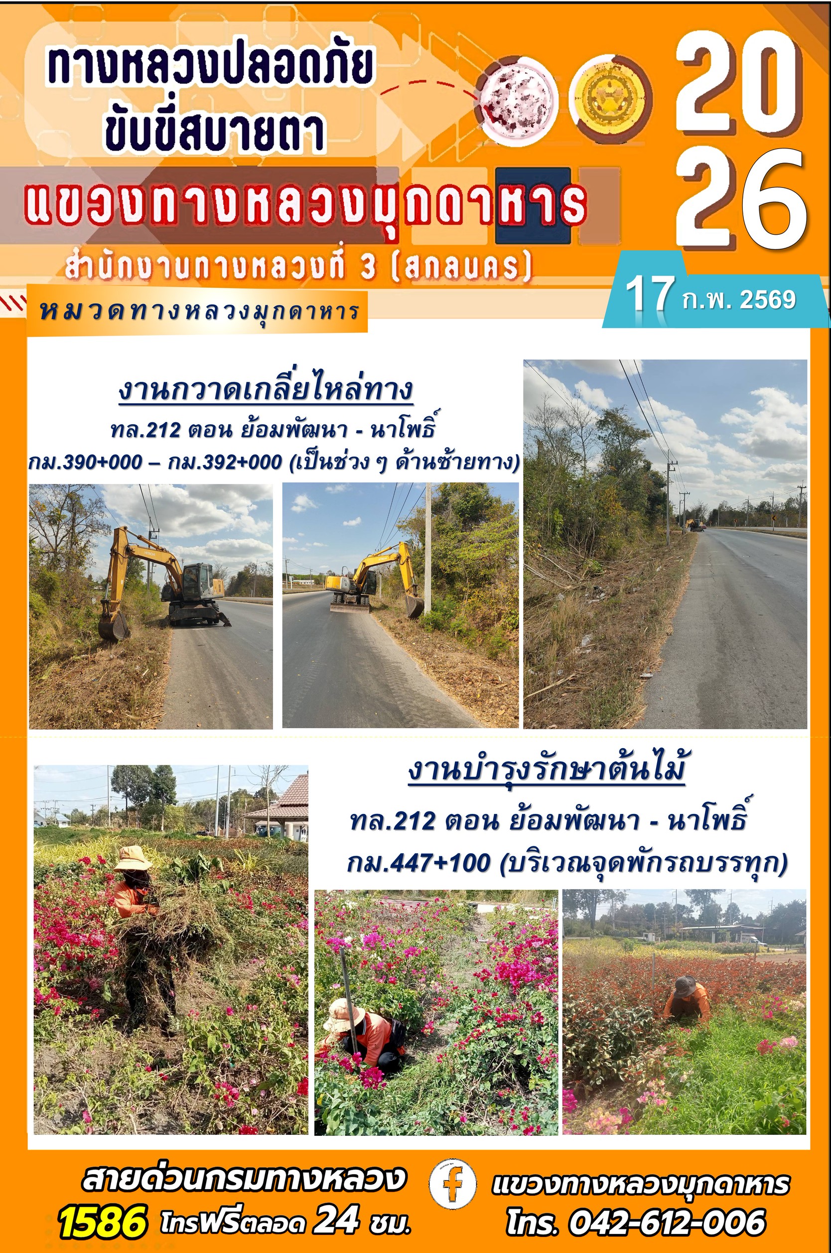 ประจำวันที่ 17 กุมภาพันธ์ 2569 โครงการทางหลวงปลอดภัย ขับขี่สบายตา หน่วยงานในสังกัดแขวงทางหลวง