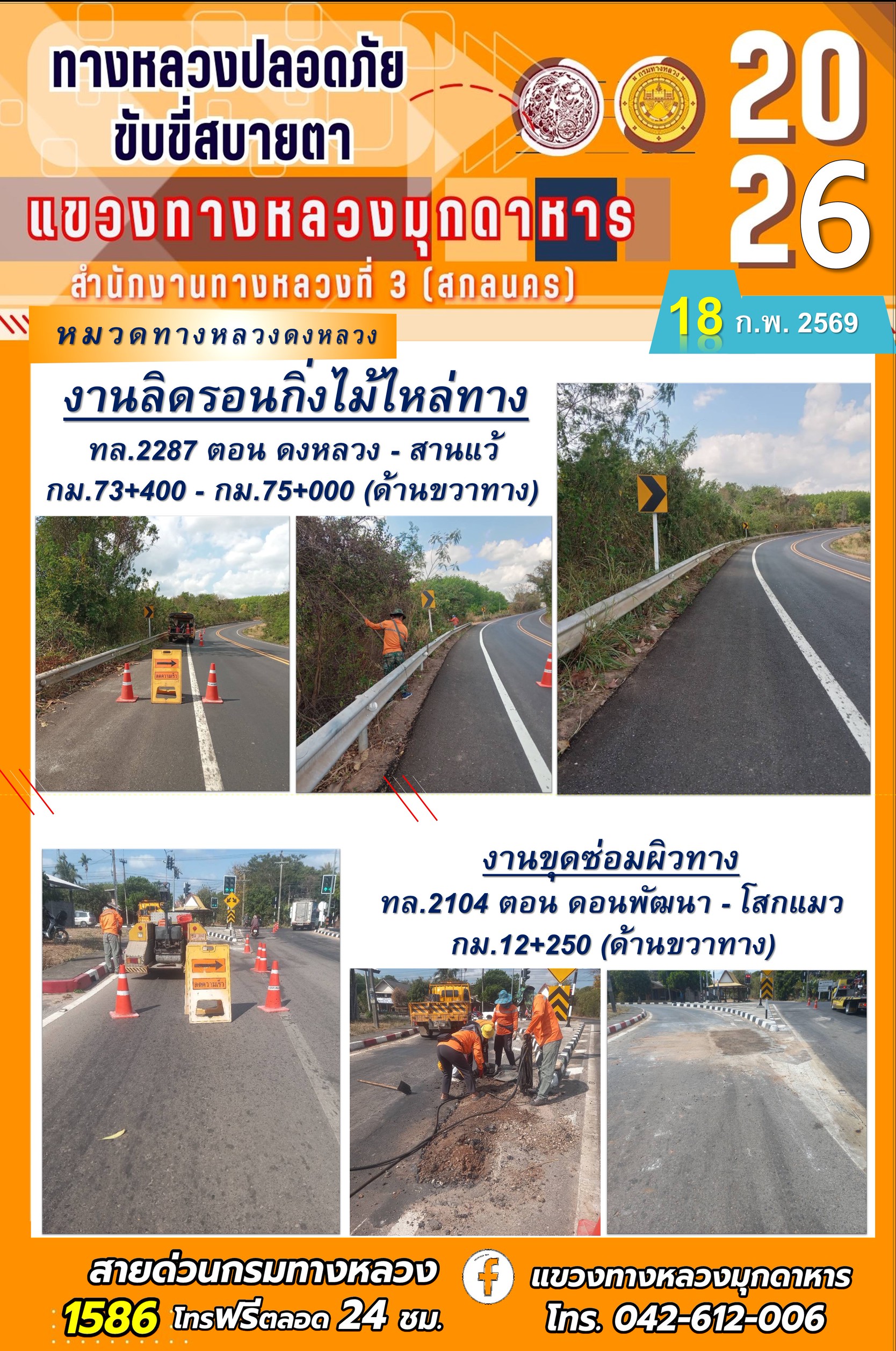 ประจำวันที่ 18 กุมภาพันธ์ 2569 โครงการทางหลวงปลอดภัย ขับขี่สบายตา หน่วยงานในสังกัดแขวงทางหลวง