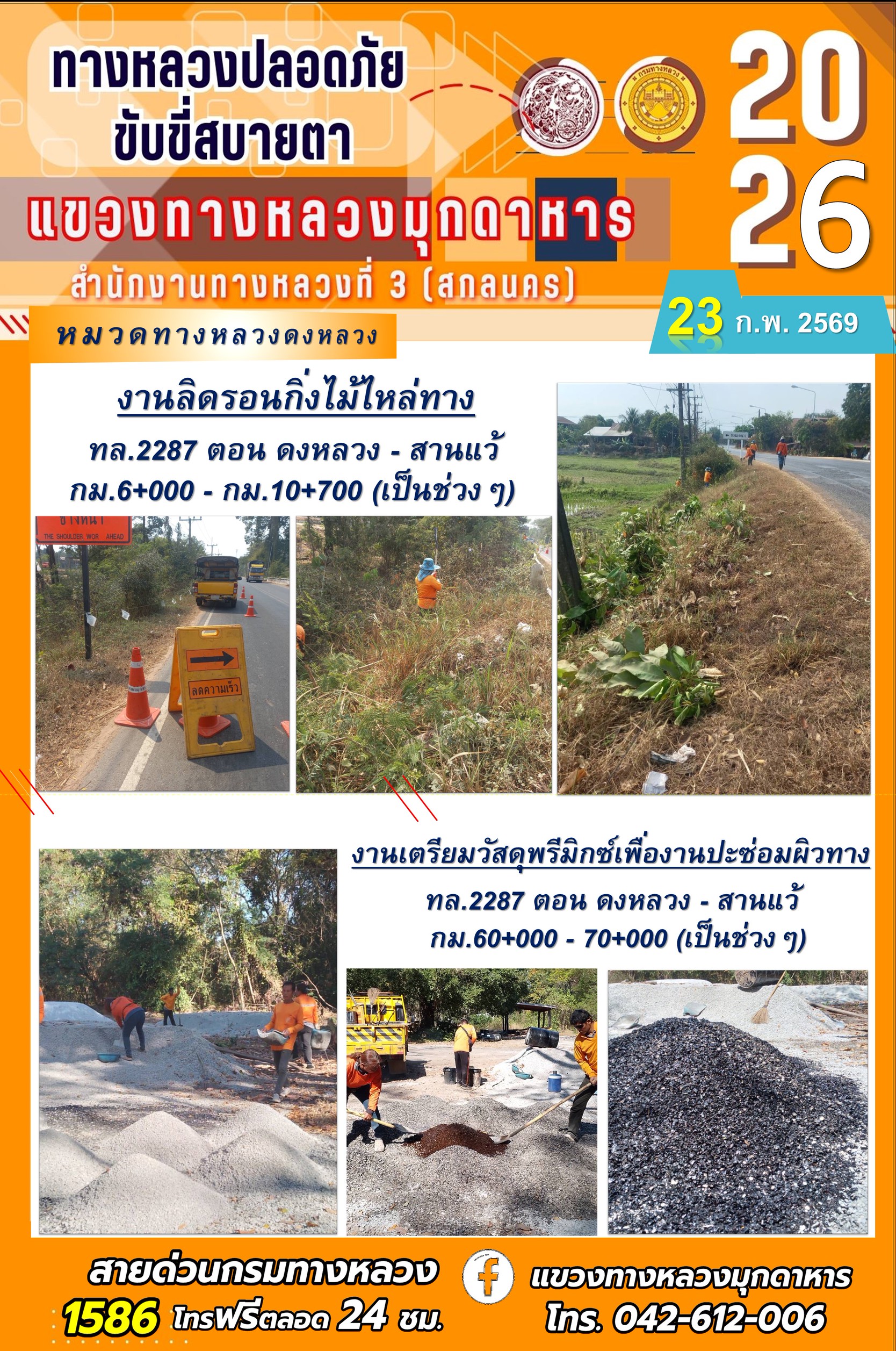 ประจำวันที่ 23 กุมภาพันธ์ 2569 โครงการทางหลวงปลอดภัย ขับขี่สบายตา หน่วยงานในสังกัดแขวงทางหลวง