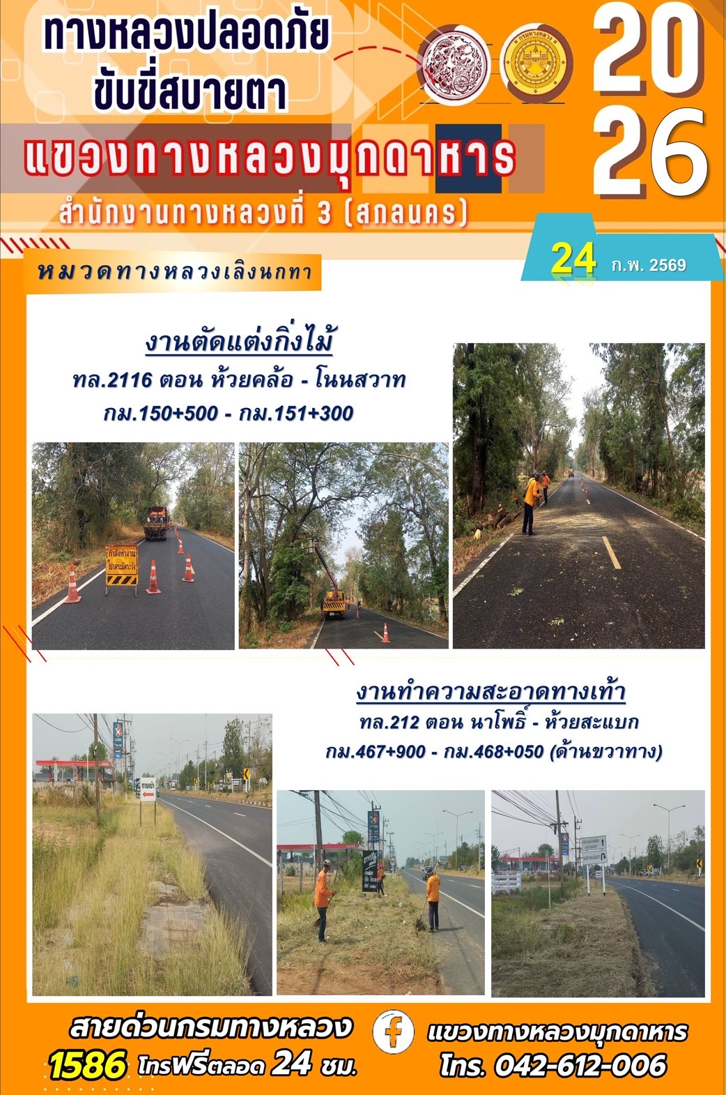 ประจำวันที่ 24 กุมภาพันธ์ 2569 โครงการทางหลวงปลอดภัย ขับขี่สบายตา หน่วยงานในสังกัดแขวงทางหลวง