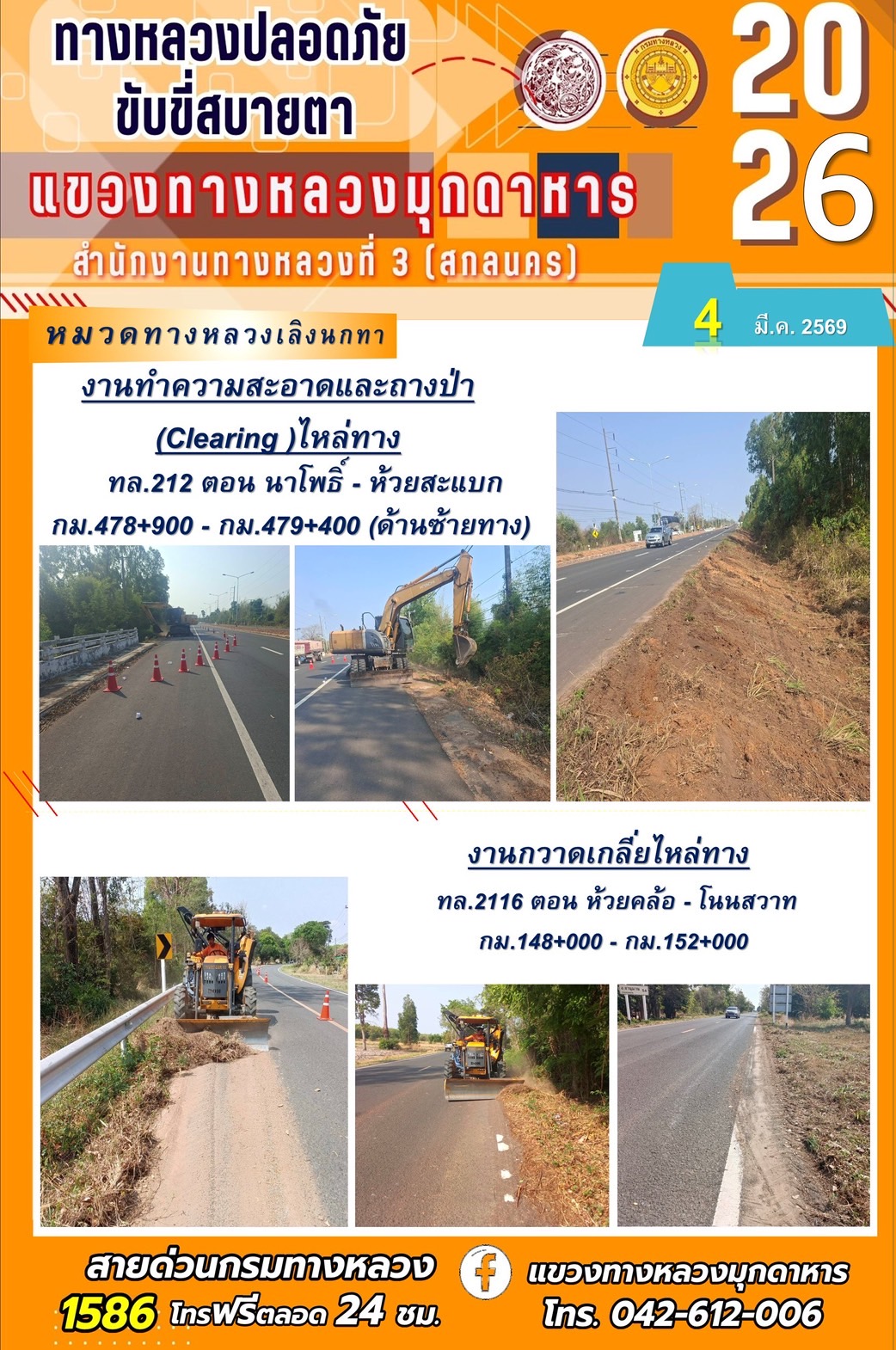 ประจำวันที่ 4 มีนาคม 2569 โครงการทางหลวงปลอดภัย ขับขี่สบายตา หน่วยงานในสังกัดแขวงทางหลวง