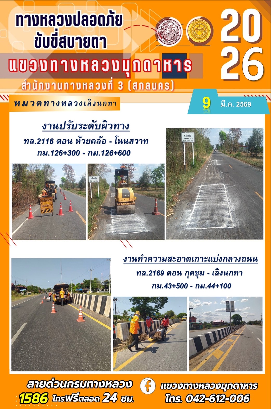 ประจำวันที่ 9 มีนาคม 2569 โครงการทางหลวงปลอดภัย ขับขี่สบายตา หน่วยงานในสังกัดแขวงทางหลวง