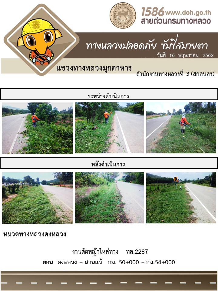 ครงการยกระดับและพัฒนาแหล่งท่องเที่ยวกลุ่มจังหวัดสนุกกิจกรรมปรับปรุงทางหลวงผ่านย่านชุมชนทางหลวงหมายเลข 2287 ตอนควบคุม 0100 ตอน ดงหลวง - สานแว้ระหว่าง กม. 3+147 – กม.3+975 รวมระยะทาง 0.820 กม. งบประมาณค่าก่อสร้าง 15,000,000 13 พ.ย.61
