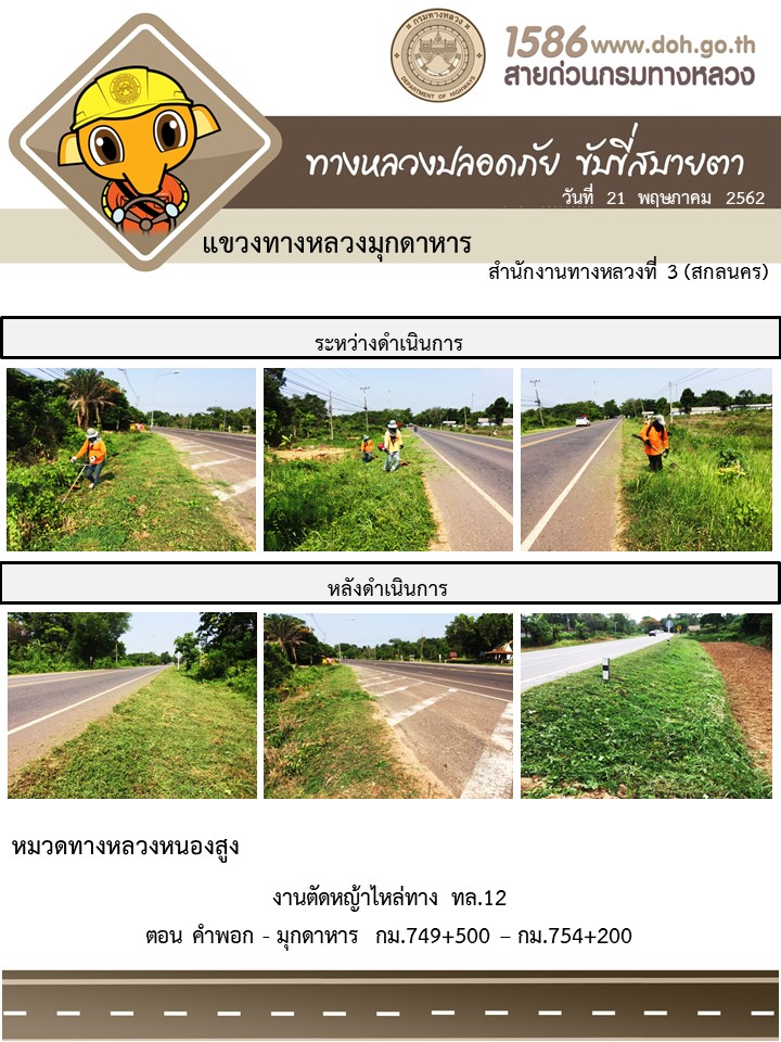 กิจกรรมปรับปรุงทางหลวงผ่านย่านชุมชนทางหลวงหมายเลข ทางหลวงหมายเลข 2034 ตอนควบคุม 0101,0102 ตอน มุกดาหาร - นาสีนวน – บุ่งเขียว ระหว่าง กม. 12+730 - กม. 16+150 (เป็นช่วงๆ) รวมระยะทาง 1.780 กม. งบประมาณค่าก่อสร้าง 25,000,000 บาท