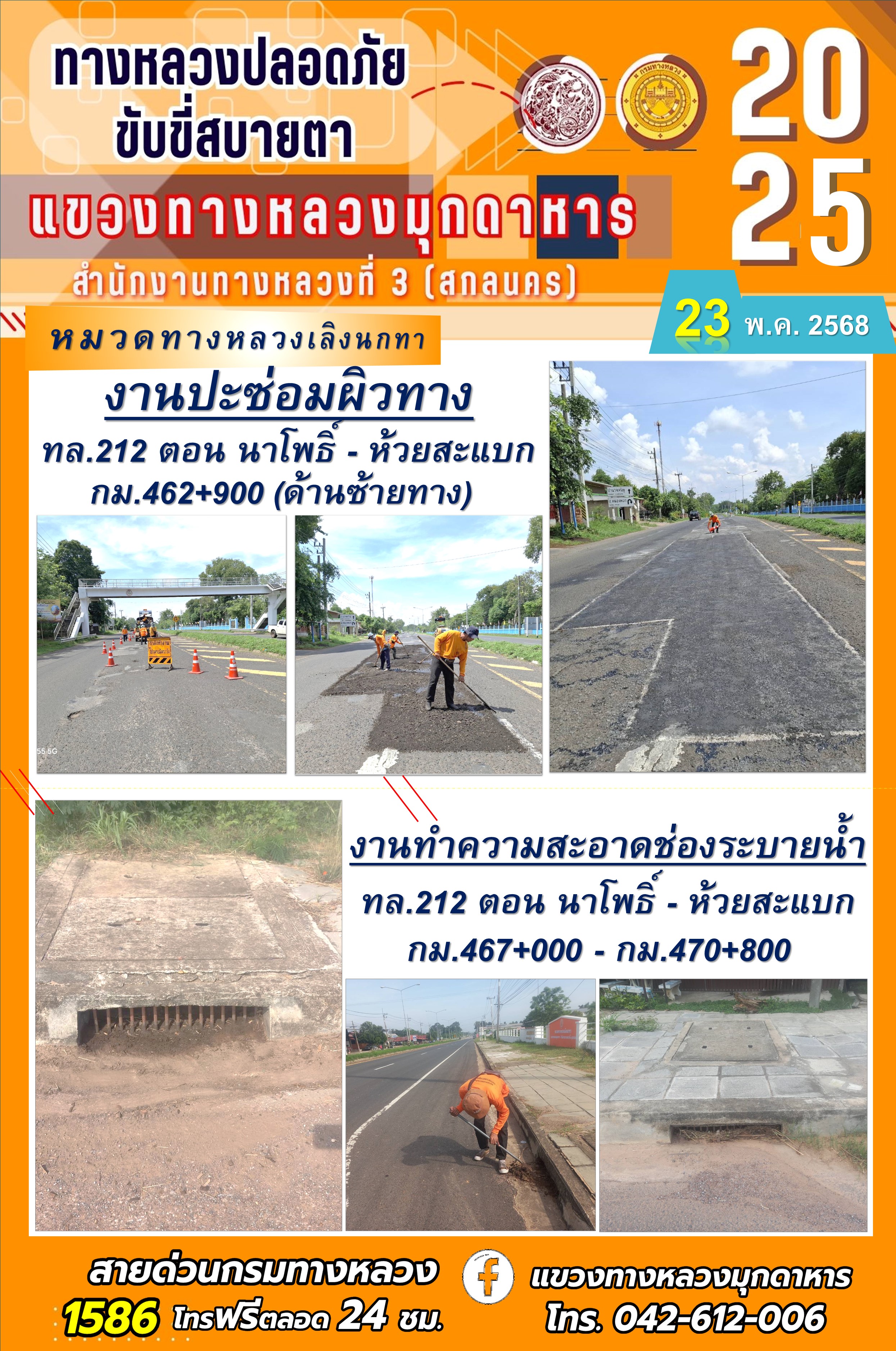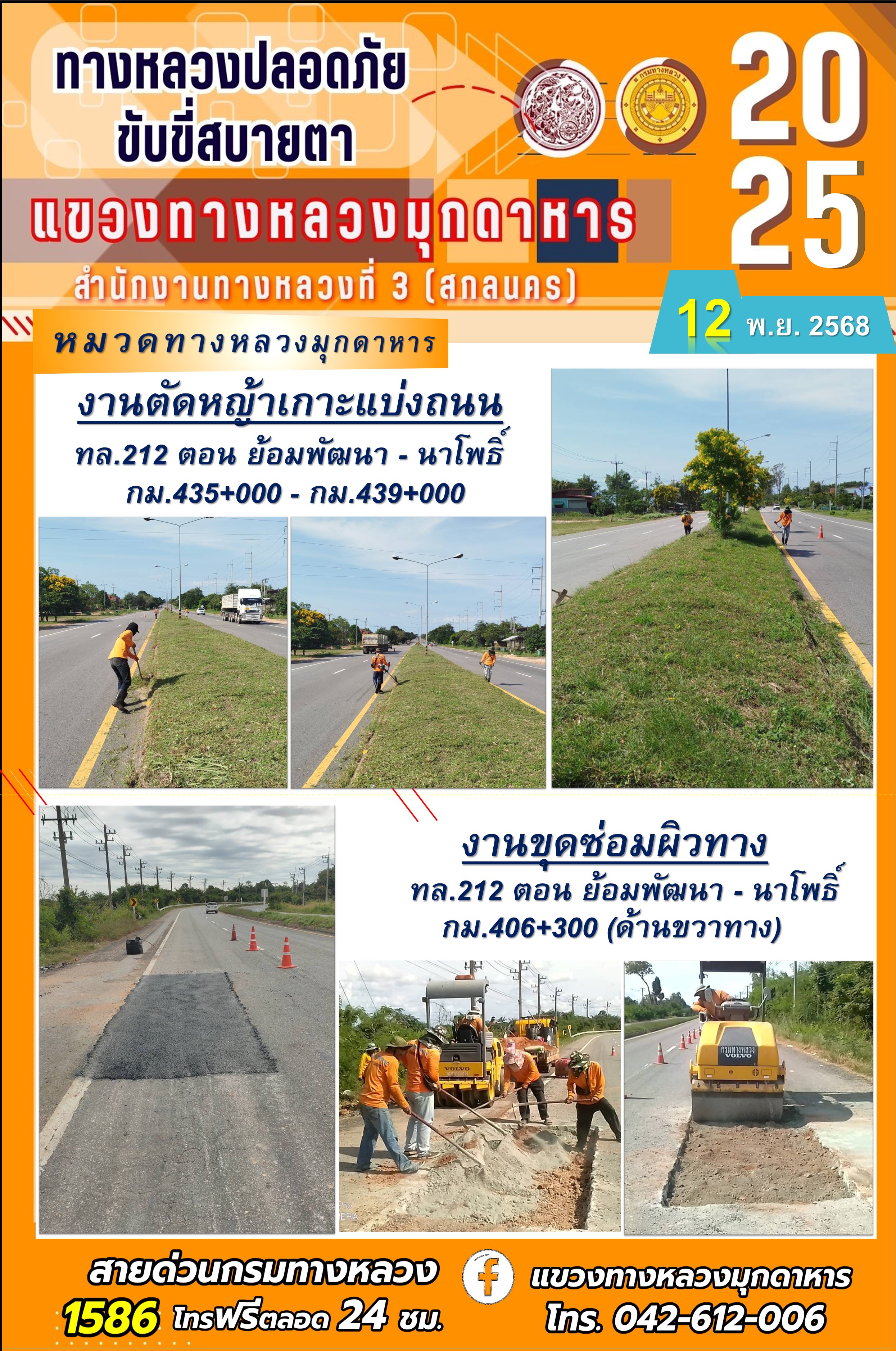 ประจำวันที่ 12.11.2568 โครงการทางหลวงปลอดภัย ขับขี่สบายตา หน่วยงานในสังกัดแขวงทางหลวงมุกดาหาร