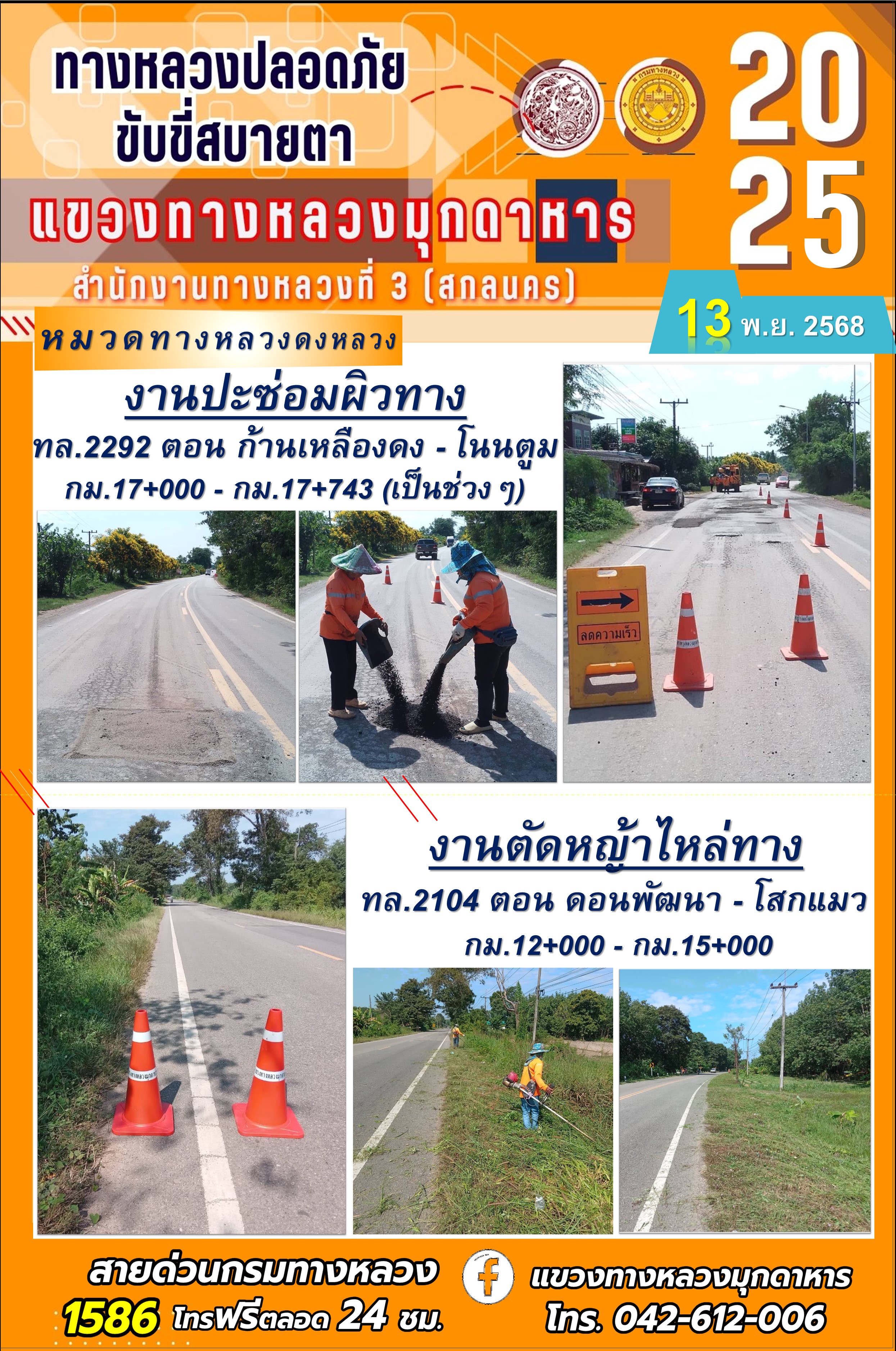 ประจำวันที่ 13.11.2568 โครงการทางหลวงปลอดภัย ขับขี่สบายตา หน่วยงานในสังกัดแขวงทางหลวงมุกดาหาร