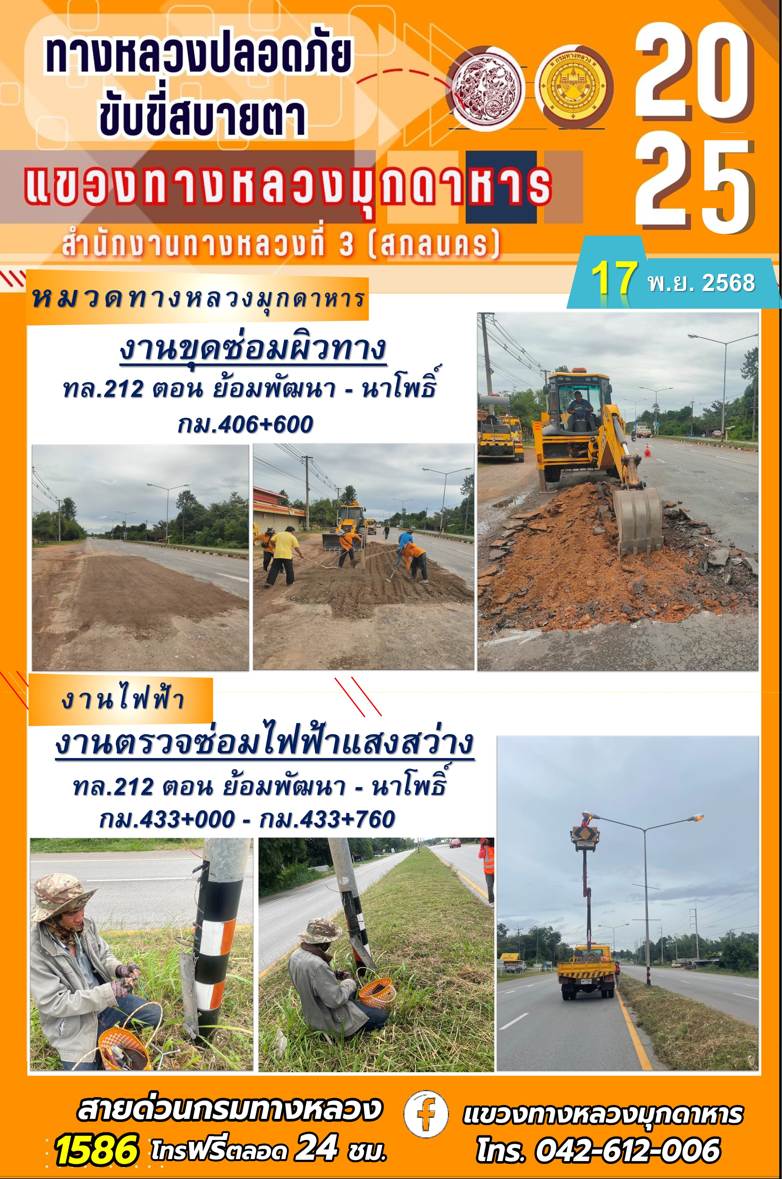 ประจำวันที่ 17.11.2568 โครงการทางหลวงปลอดภัย ขับขี่สบายตา หน่วยงานในสังกัดแขวงทางหลวงมุกดาหาร