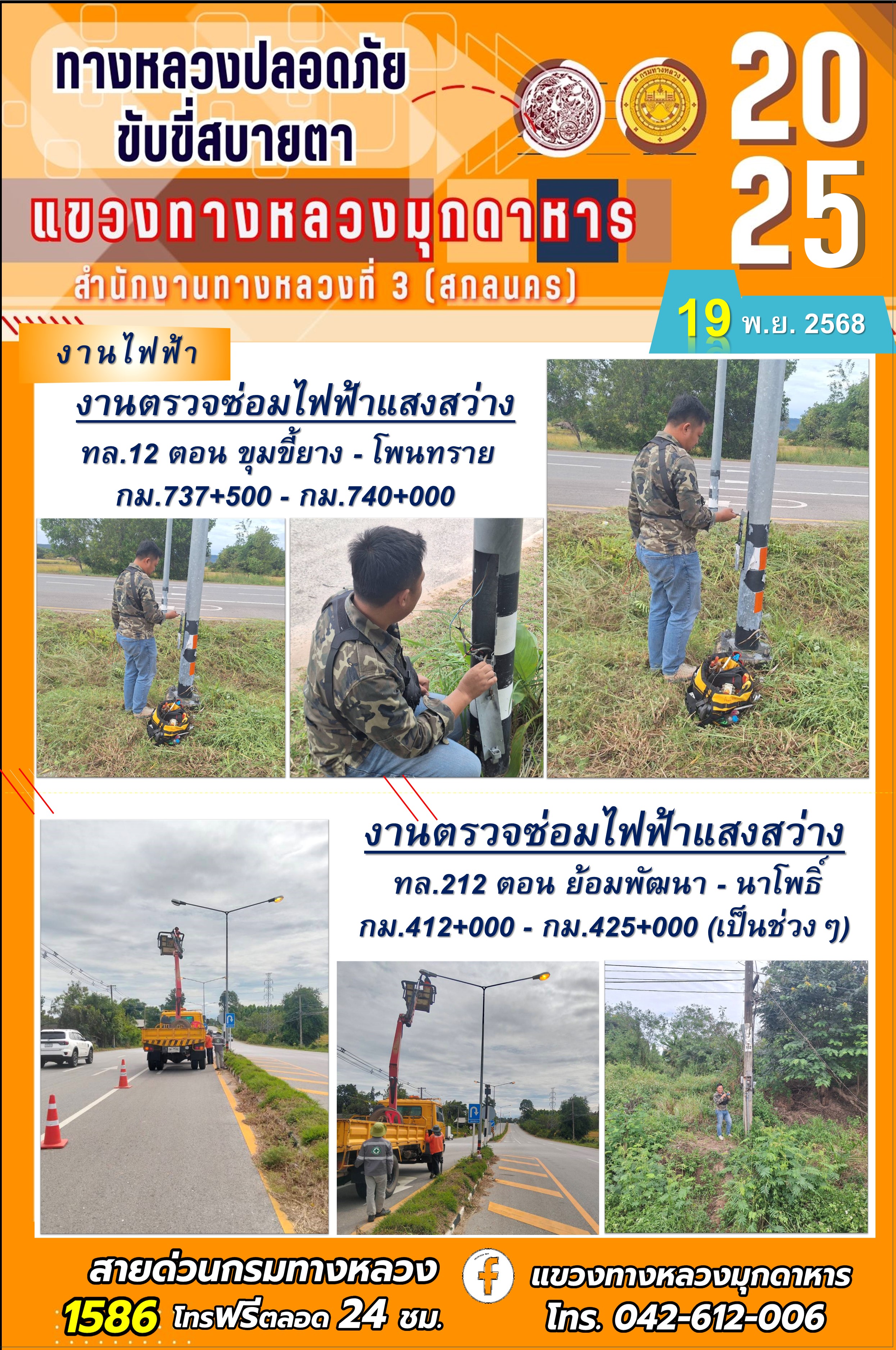 ประจำวันที่ 19.11.2568 โครงการทางหลวงปลอดภัย ขับขี่สบายตา หน่วยงานในสังกัดแขวงทางหลวงมุกดาหาร