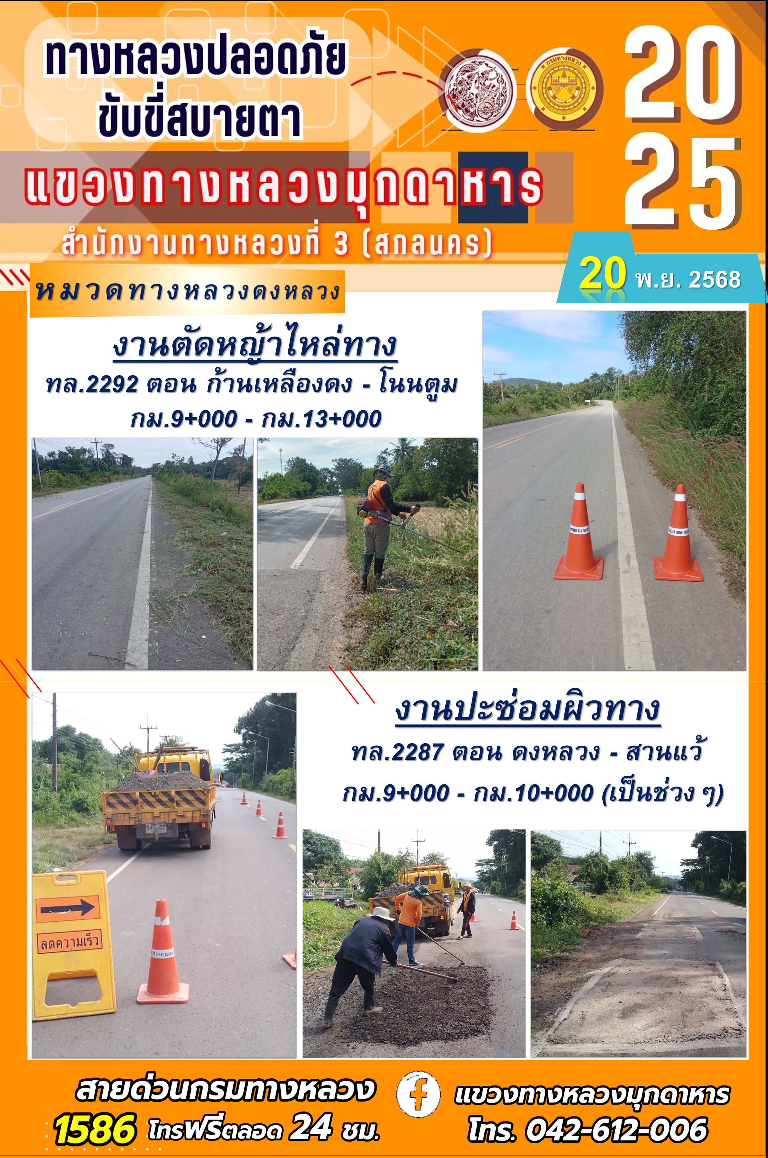 ประจำวันที่ 20.11.2568 โครงการทางหลวงปลอดภัย ขับขี่สบายตา หน่วยงานในสังกัดแขวงทางหลวงมุกดาหาร