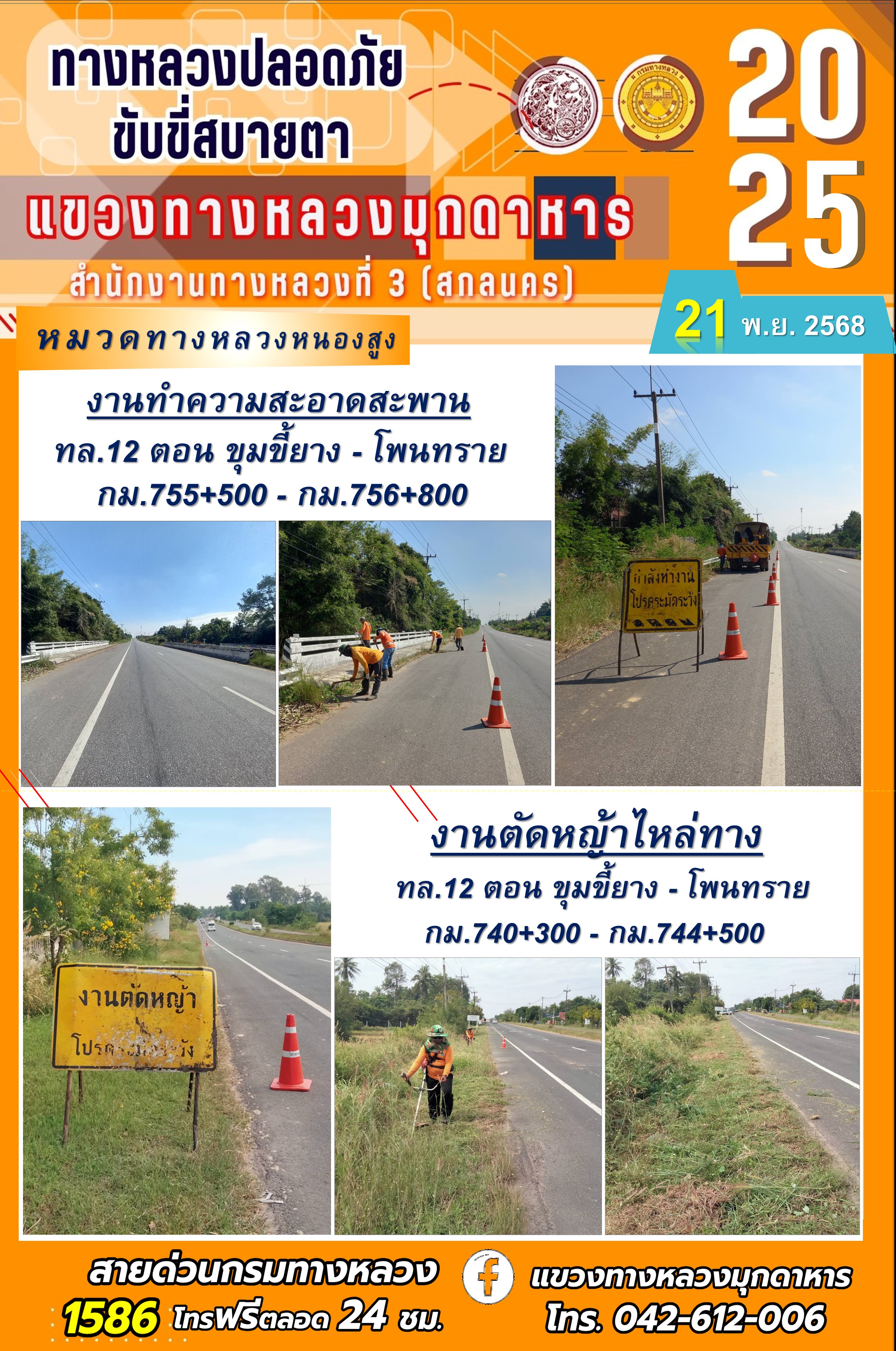 ประจำวันที่ 21.11.2568 โครงการทางหลวงปลอดภัย ขับขี่สบายตา หน่วยงานในสังกัดแขวงทางหลวงมุกดาหาร