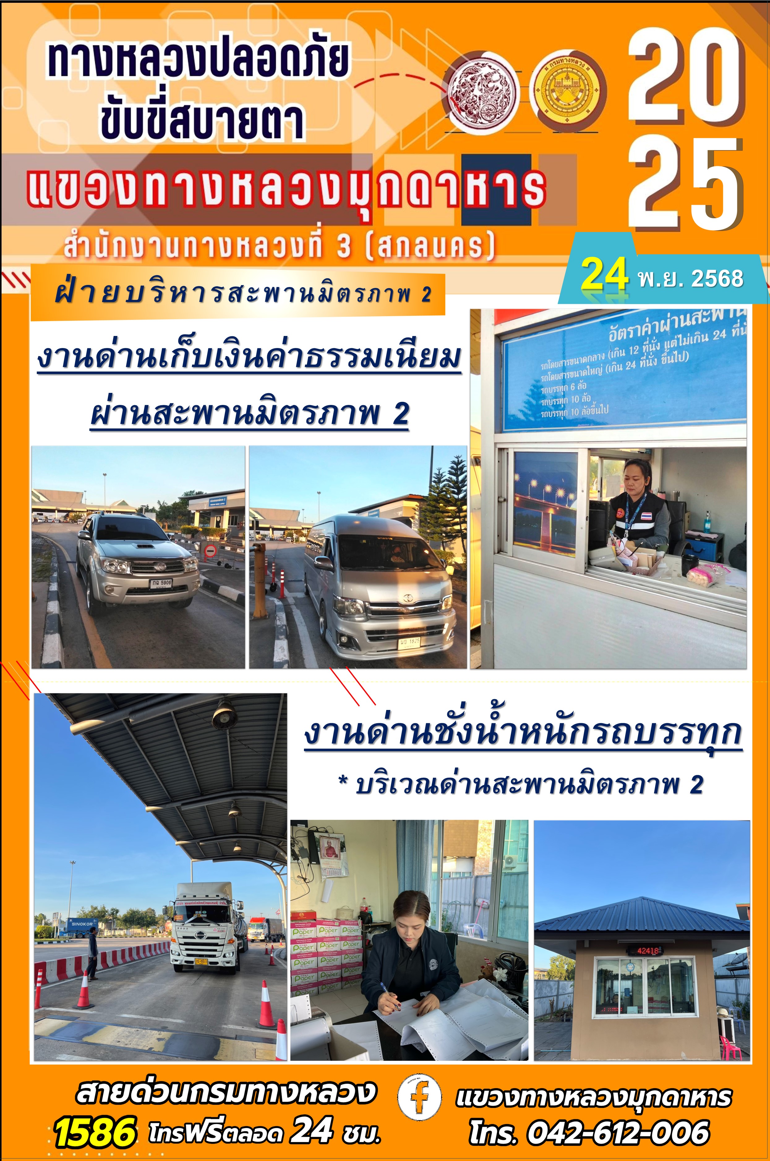 ประจำวันที่ 24.11.2568 โครงการทางหลวงปลอดภัย ขับขี่สบายตา หน่วยงานในสังกัดแขวงทางหลวงมุกดาหาร