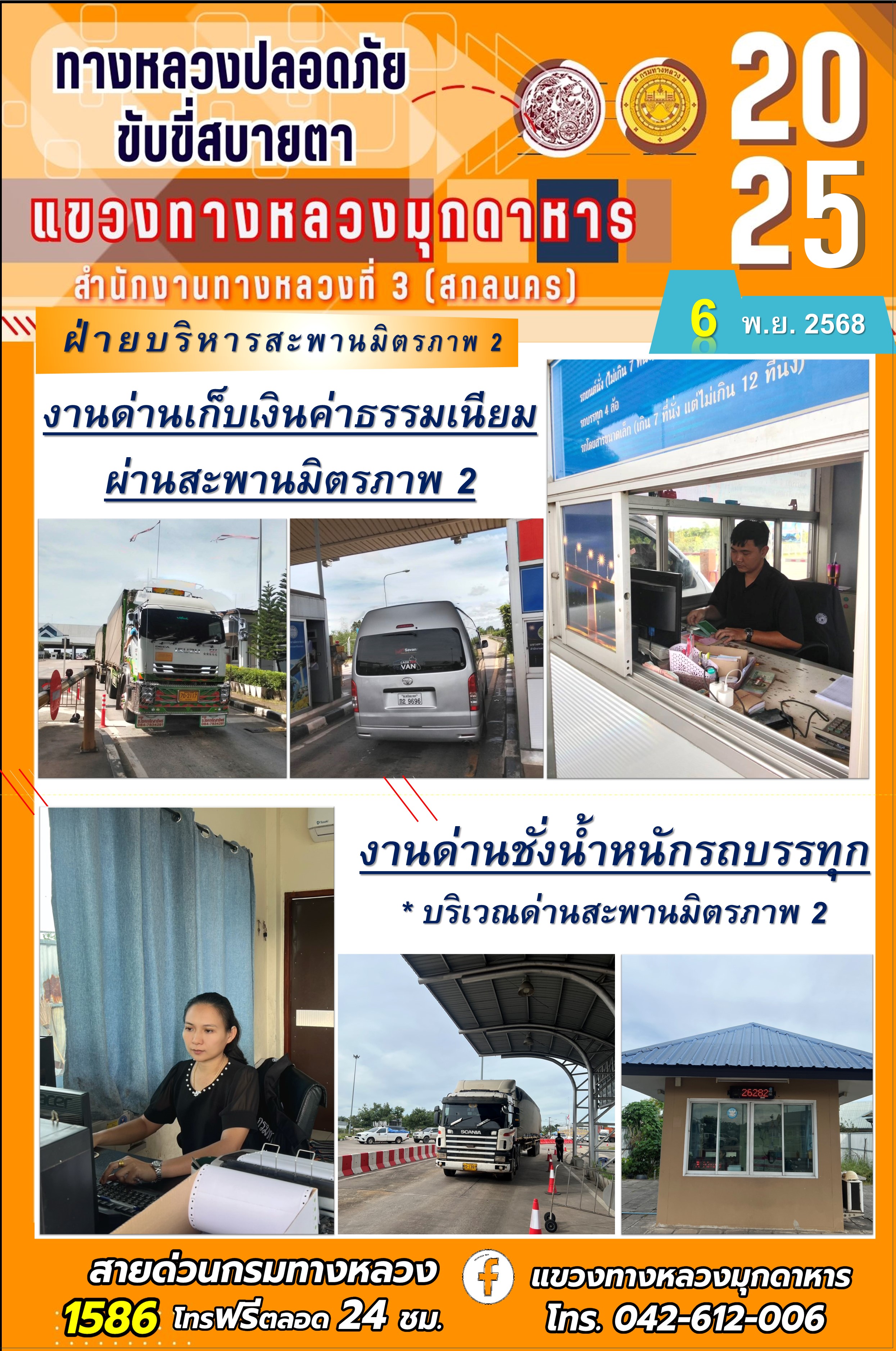 ประจำวันที่ 6.11.2568 โครงการทางหลวงปลอดภัย ขับขี่สบายตา หน่วยงานในสังกัดแขวงทางหลวงมุกดาหาร