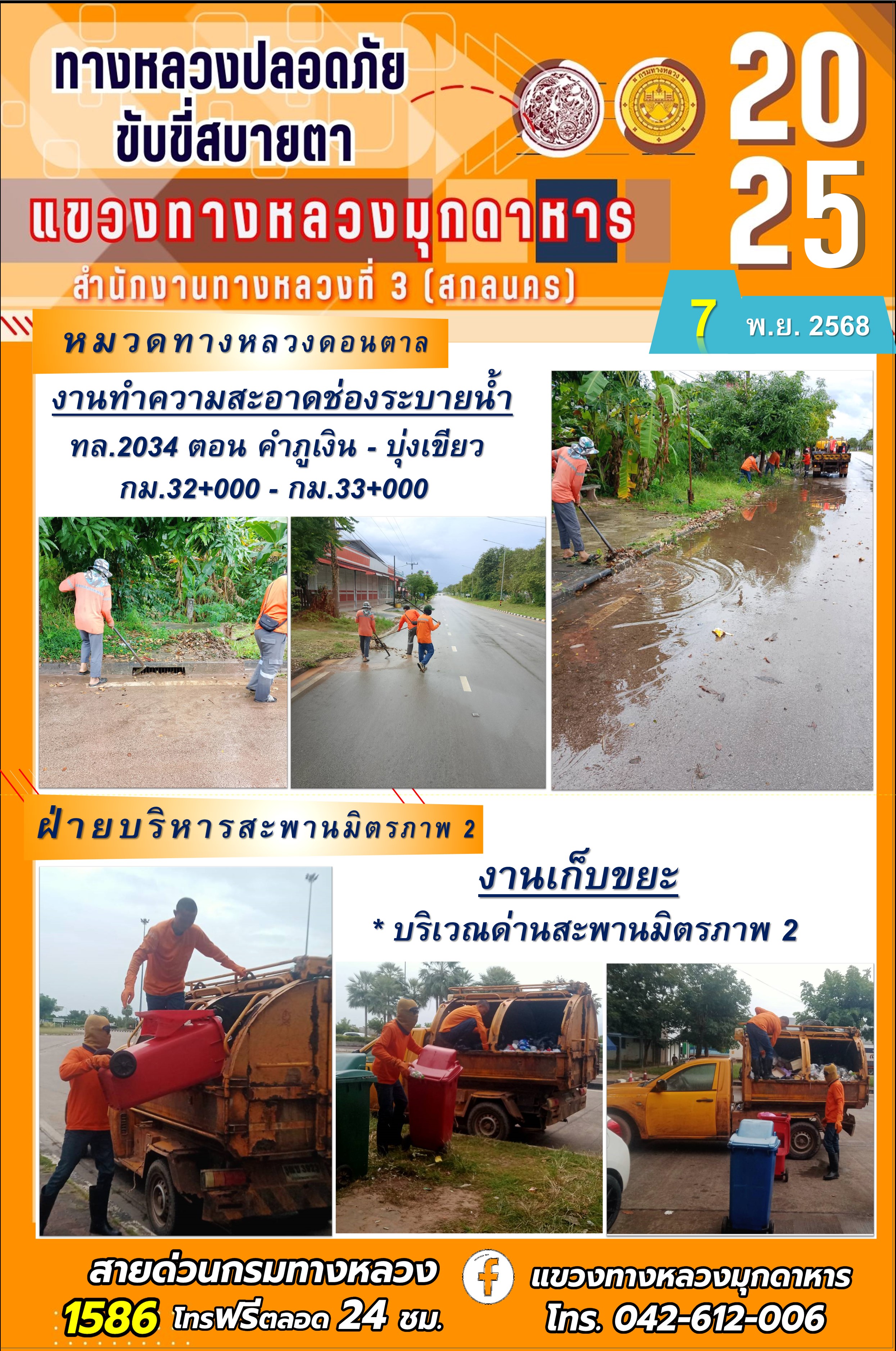 ประจำวันที่ 7.11.2568 โครงการทางหลวงปลอดภัย ขับขี่สบายตา หน่วยงานในสังกัดแขวงทางหลวงมุกดาหาร