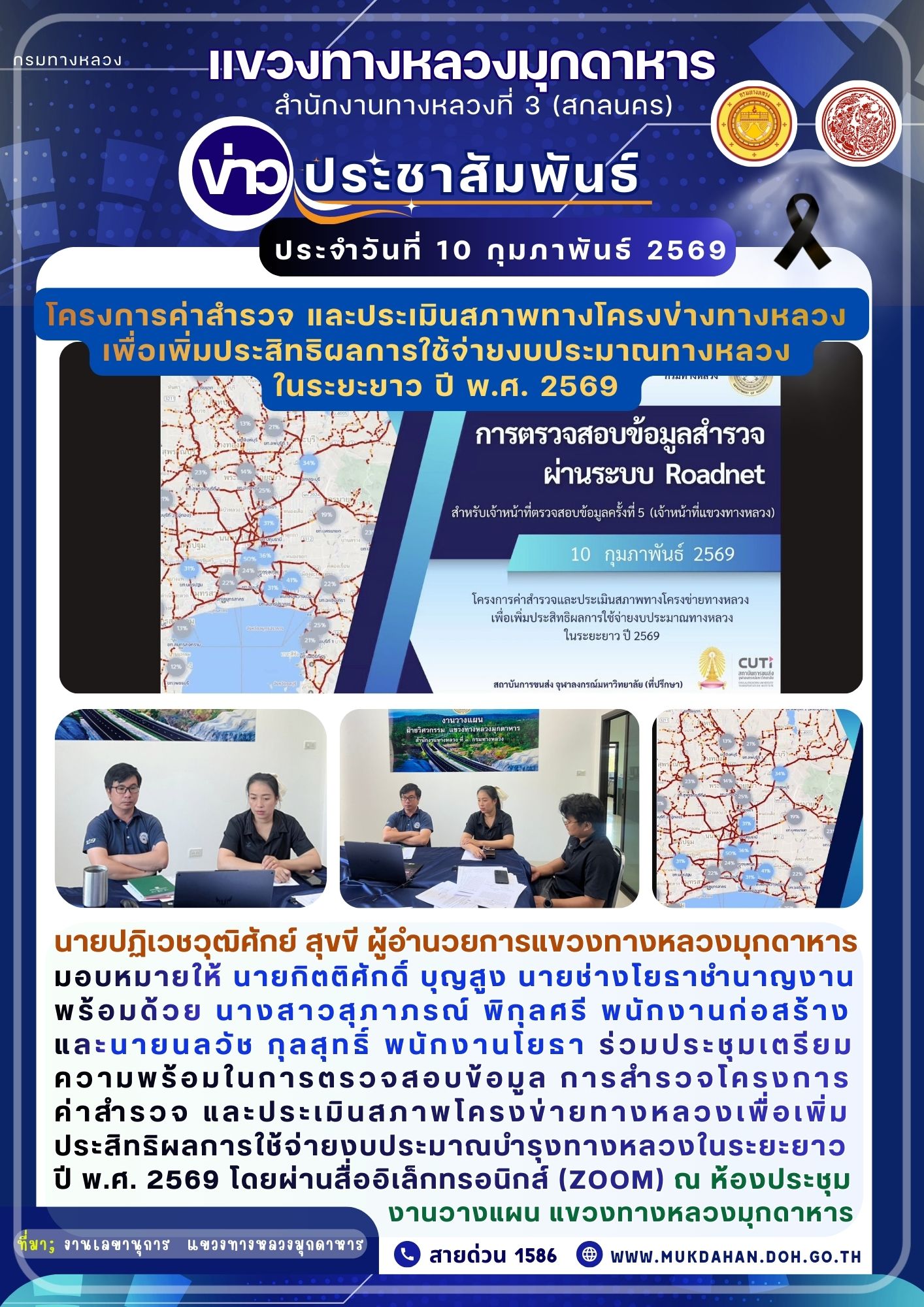 ประชุมเตรียมความพร้อมในการตรวจสอบข้อมูล การสำรวจโครงการค่าสำรวจ และประเมินสภาพโครงข่ายทางหลวงเพื่อเพิ่มประสิทธิผลการใช้จ่ายงบประมาณบำรุงทางหลวงในระยะยาว ปี พ.ศ. 2569
