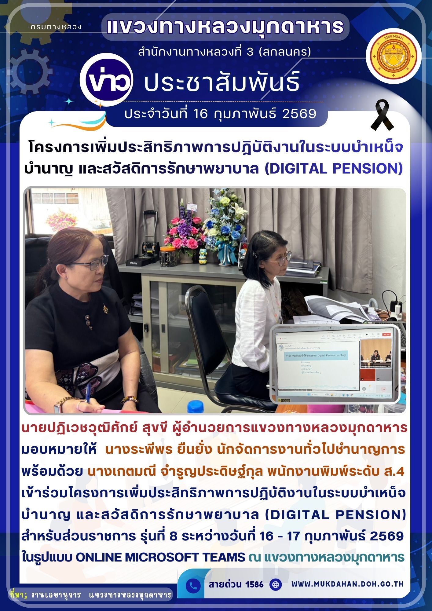ร่วมโครงการเพิ่มประสิทธิภาพการปฏิบัติงานในระบบบำเหน็จบํานาญ และสวัสดิการรักษาพยาบาล (Digital Pension) สำหรับส่วนราชการ รุ่นที่ 8 ระหว่างวันที่ 16 - 17 กุมภาพันธ์ 2569