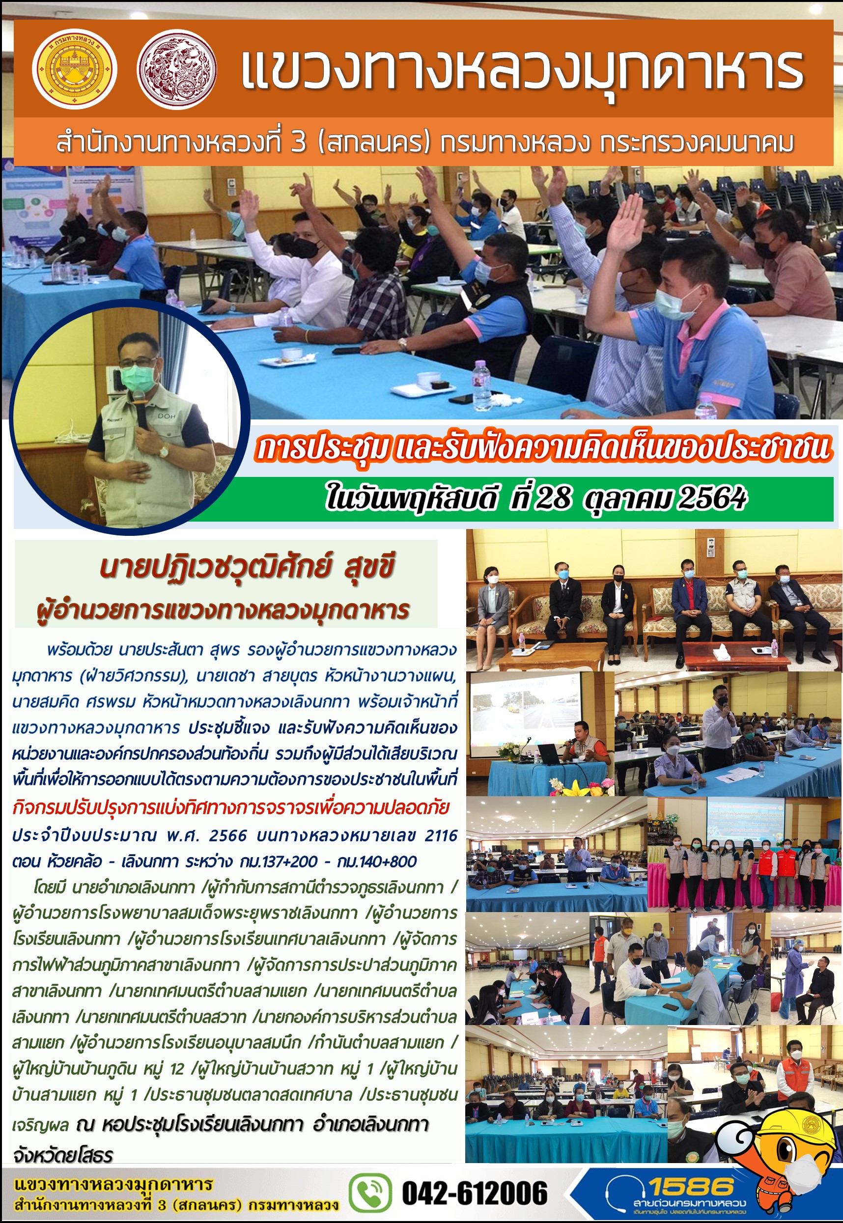 แขวงทางหลวงมุกดาหาร โดย นายปฏิเวชวุฒิศักย์ สุขขี ผู้อำนวยการแขวงทางหลวงมุกดาหาร พร้อมด้วย นายประสันตา สุพร รองผู้อำนวยการแขวงทางหลวงมุกดาหาร (ฝ่ายวิศวกรรม), นายเดชา สายบุตร หัวหน้างานวางแผน, นายสมคิด ศรพรม หัวหน้าหมวดทางหลวงเลิงนกทา พร้อมเจ้าหน้าที่แขวงทางหลวงมุกดาหาร