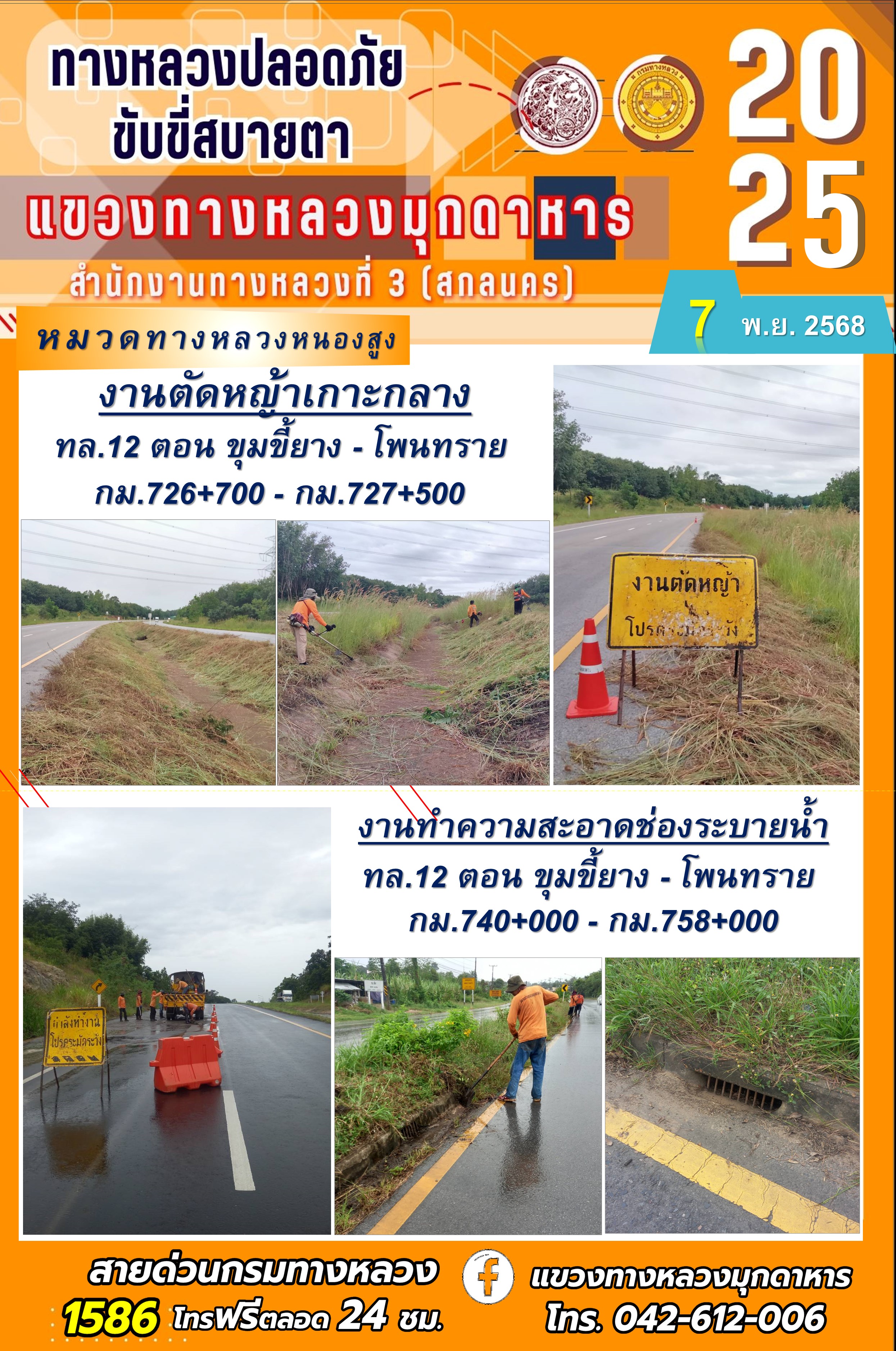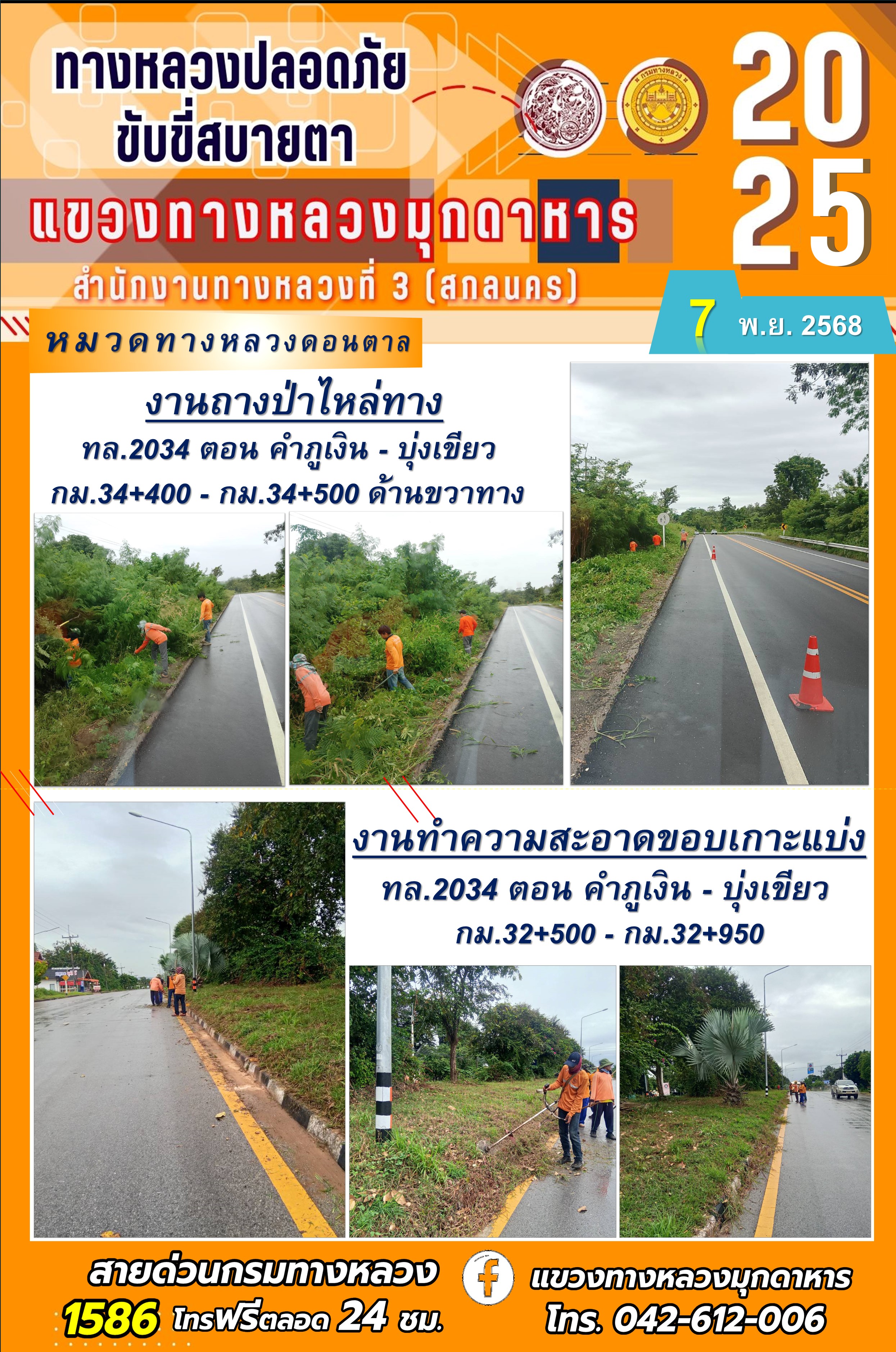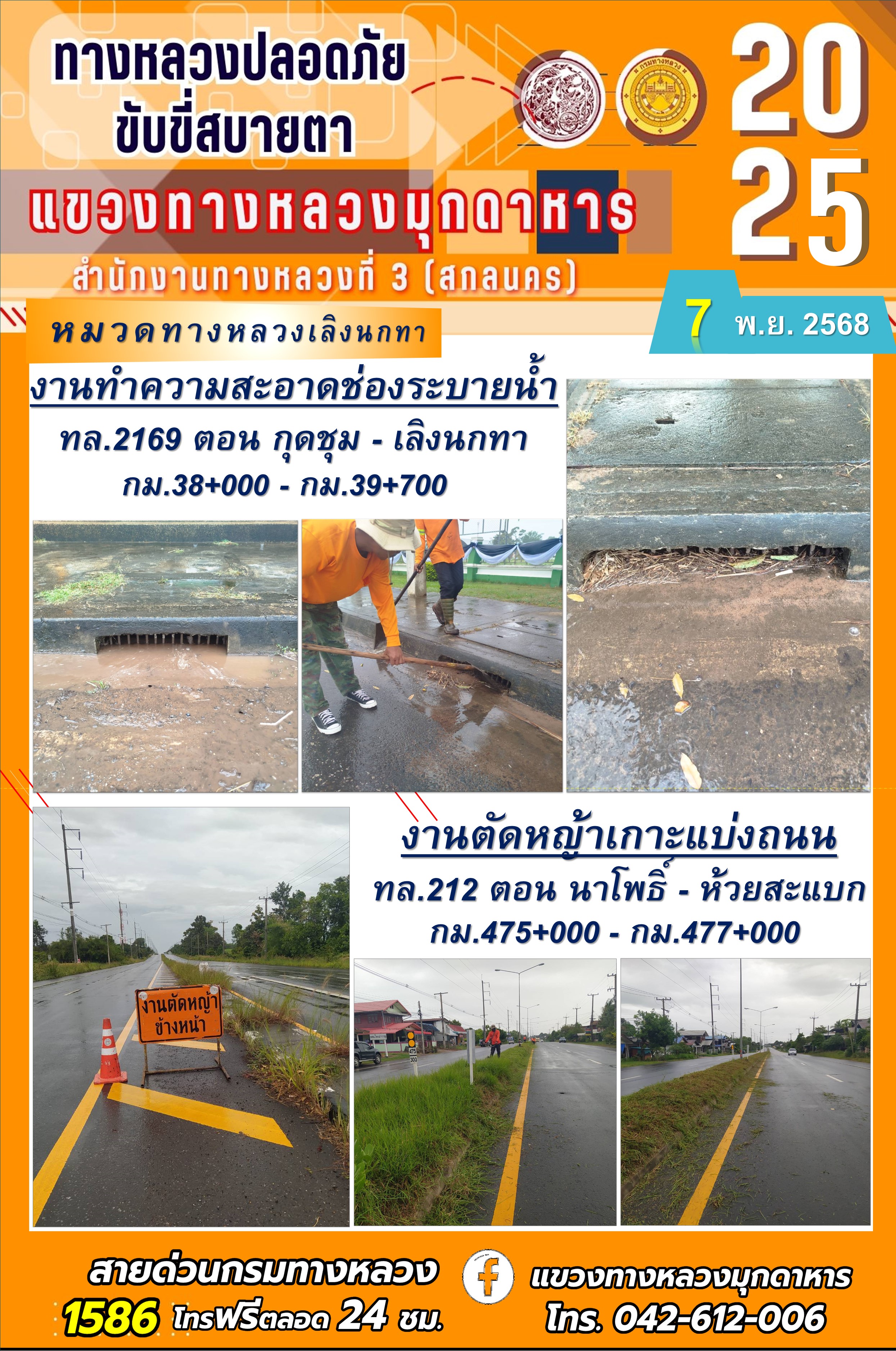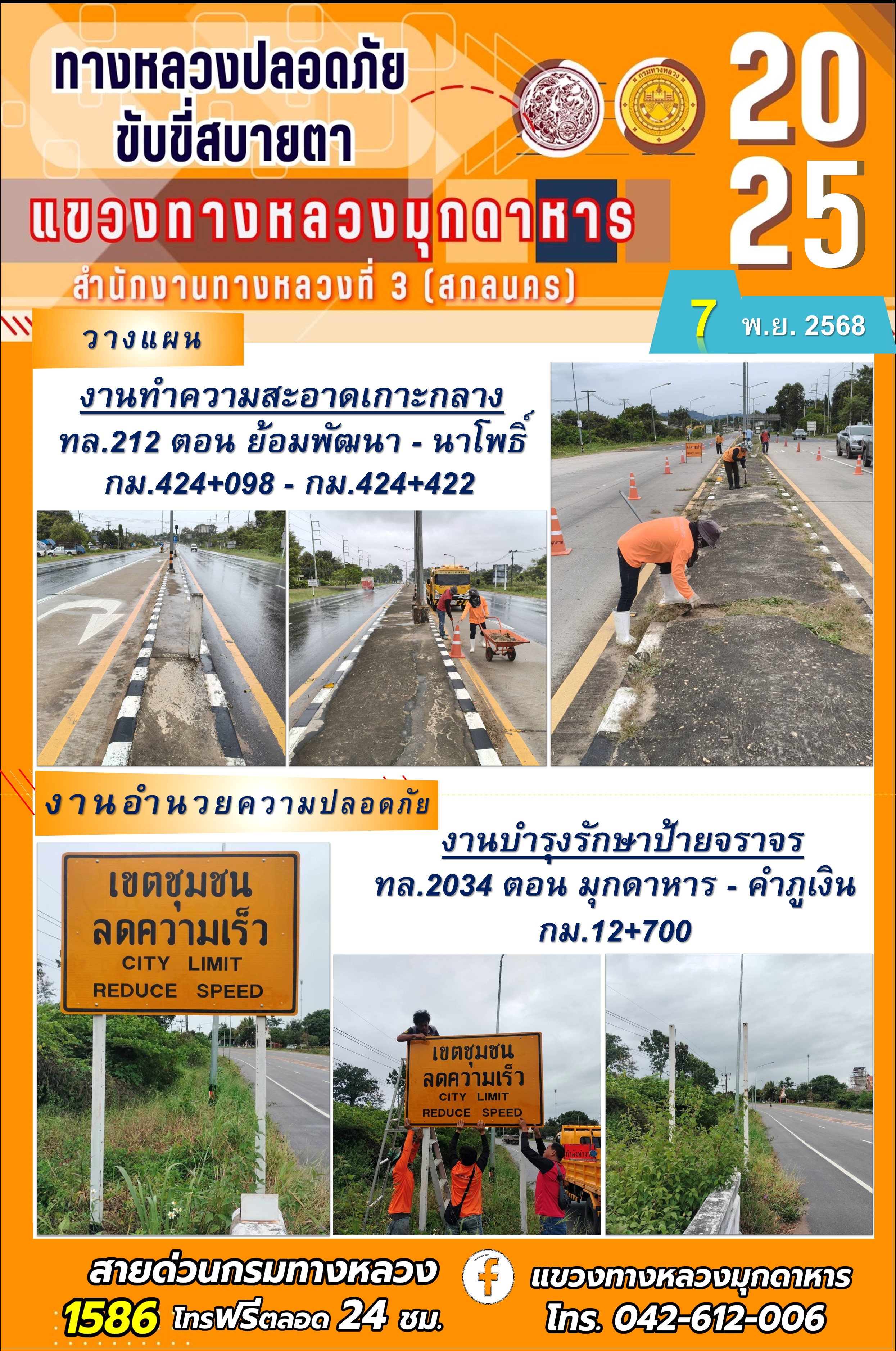 ประจำวันที่ 7.11.2568 โครงการทางหลวงปลอดภัย ขับขี่สบายตา หน่วยงานในสังกัดแขวงทางหลวงมุกดาหาร
