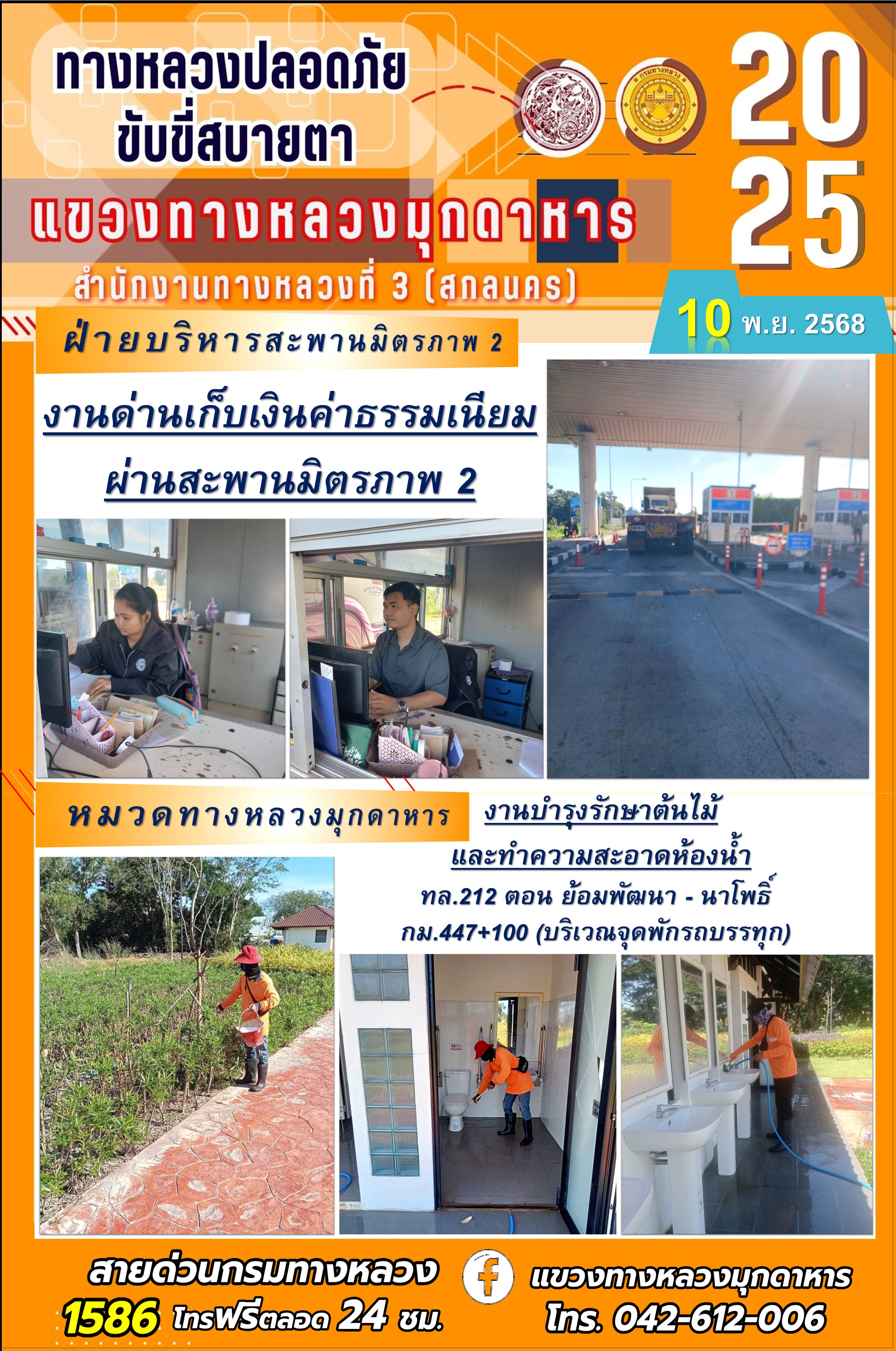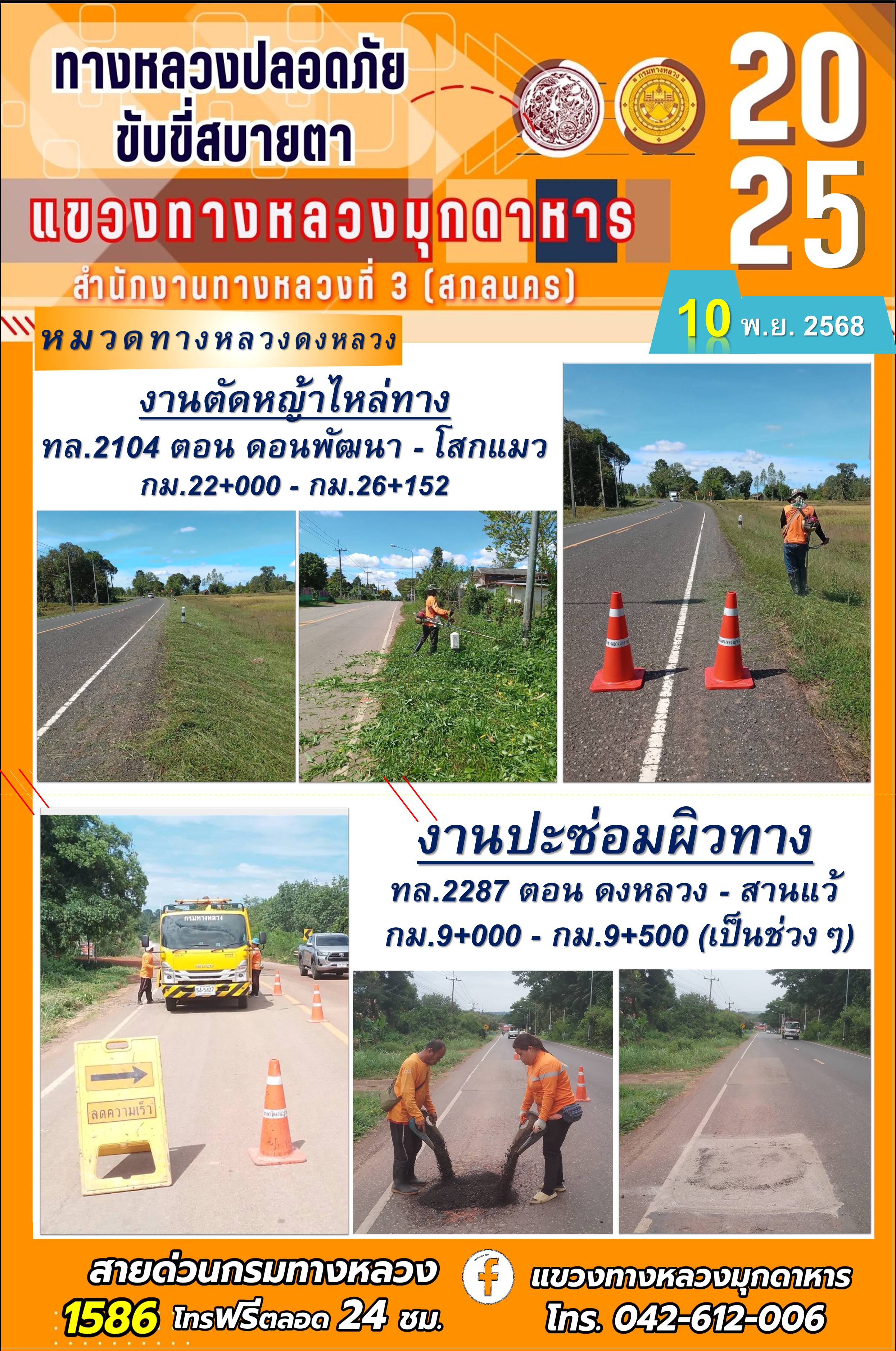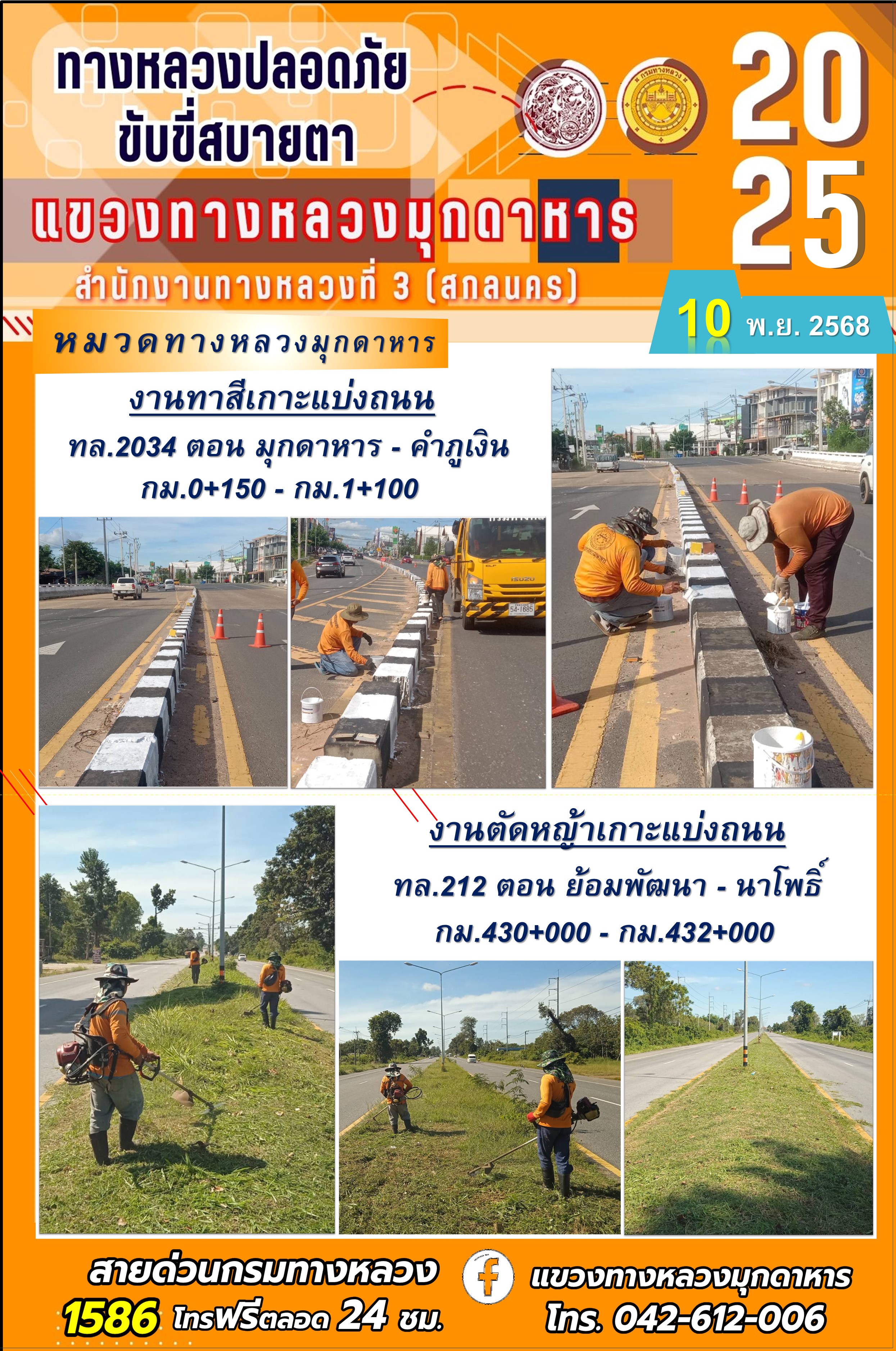 ประจำวันที่ 10.11.2568 โครงการทางหลวงปลอดภัย ขับขี่สบายตา หน่วยงานในสังกัดแขวงทางหลวงมุกดาหาร