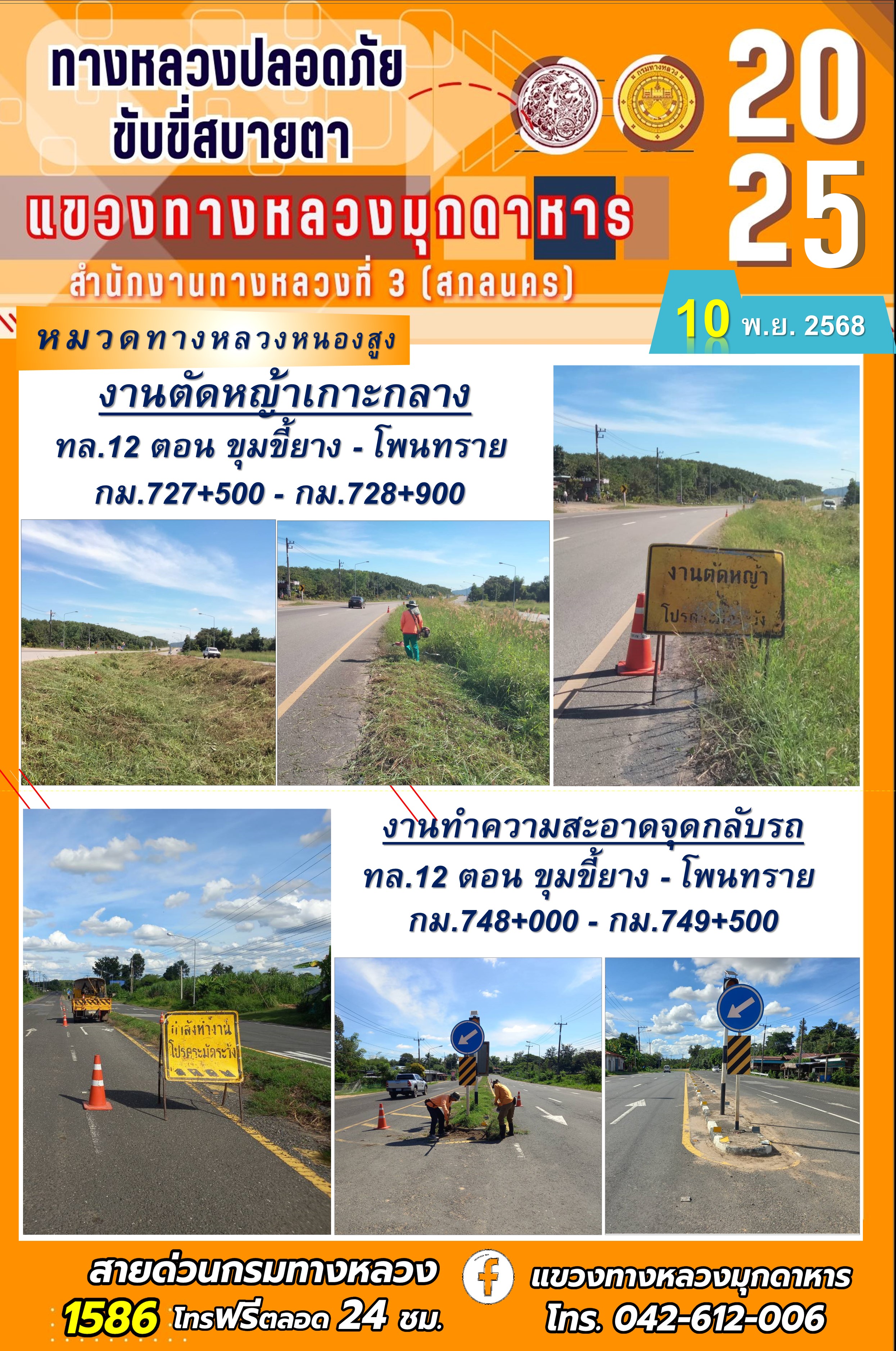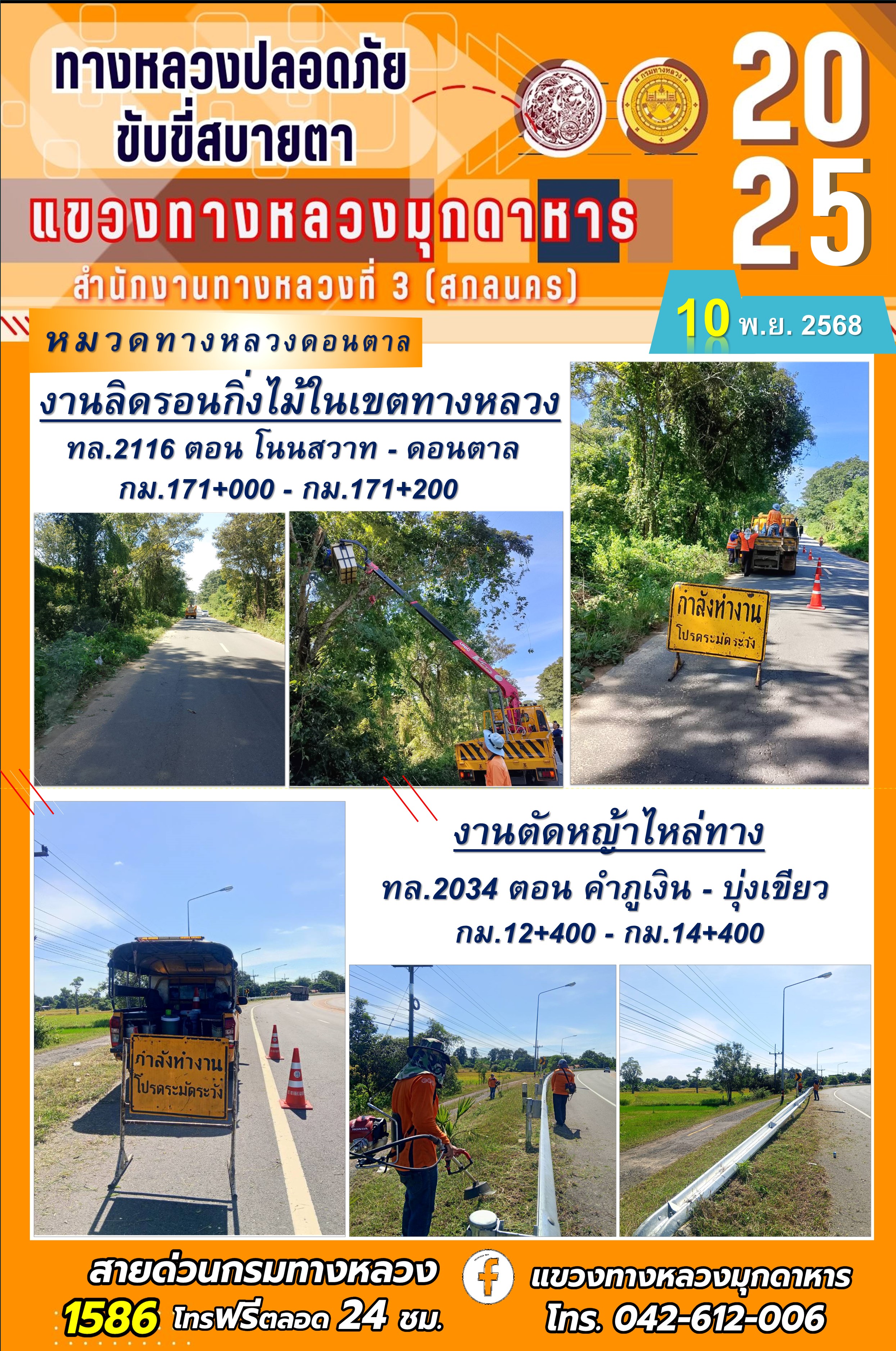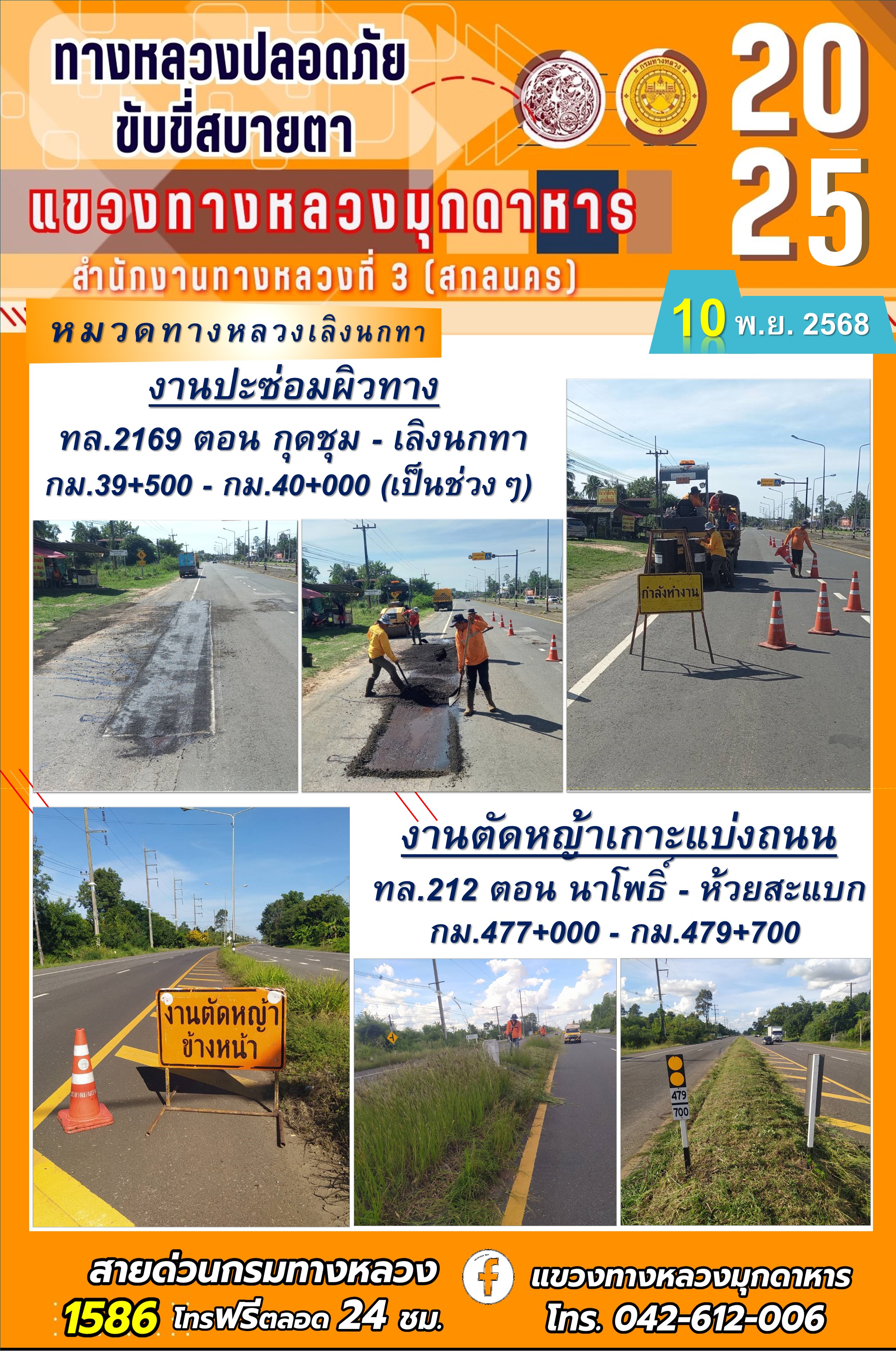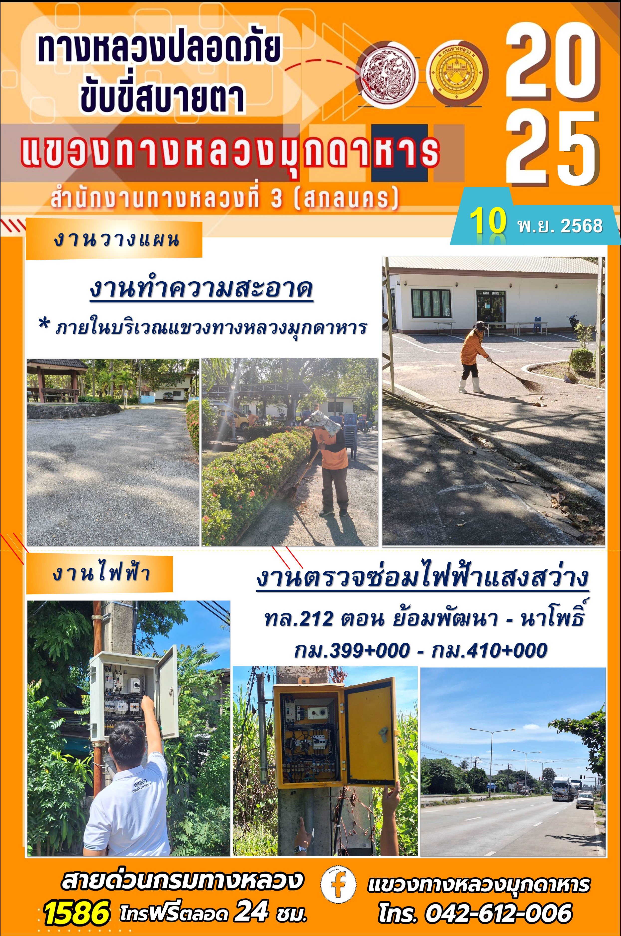 ประจำวันที่ 10.11.2568 โครงการทางหลวงปลอดภัย ขับขี่สบายตา หน่วยงานในสังกัดแขวงทางหลวงมุกดาหาร