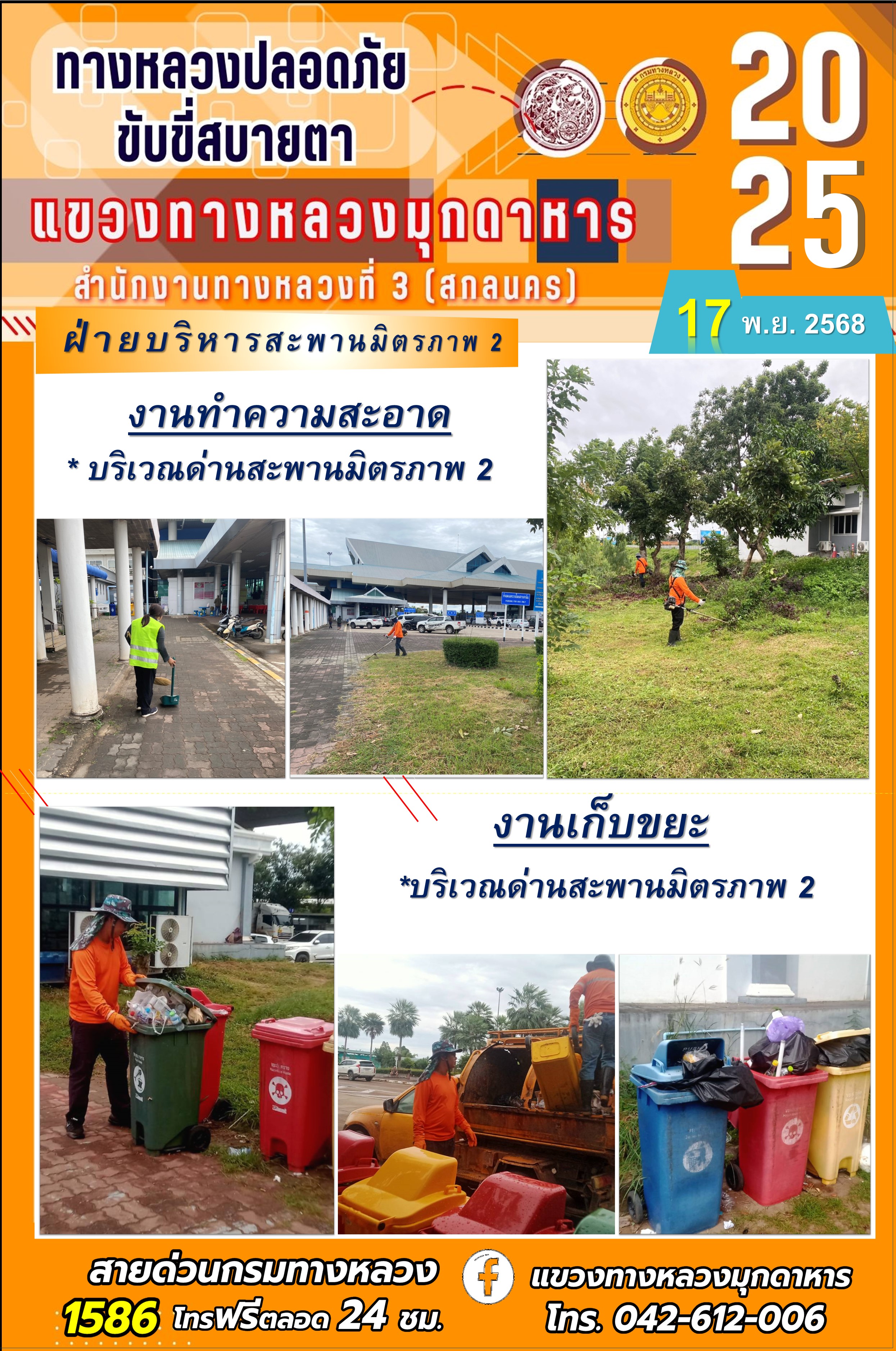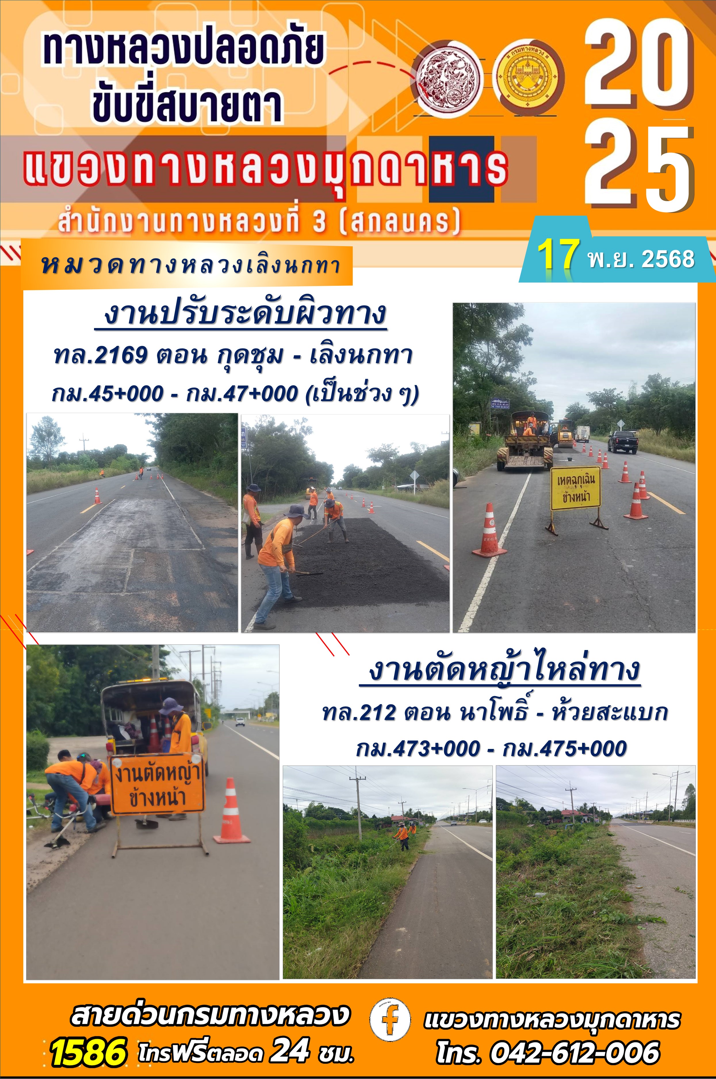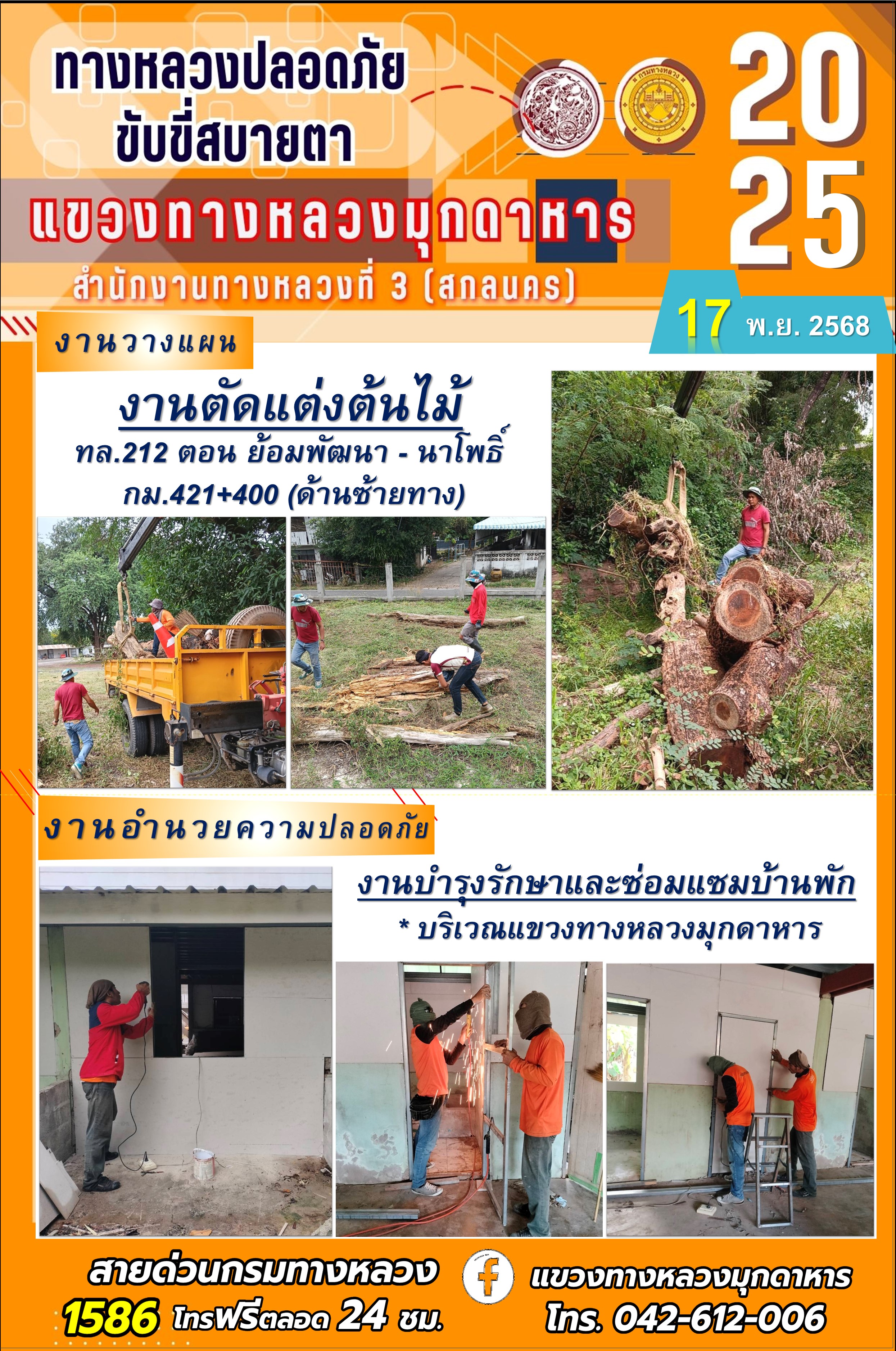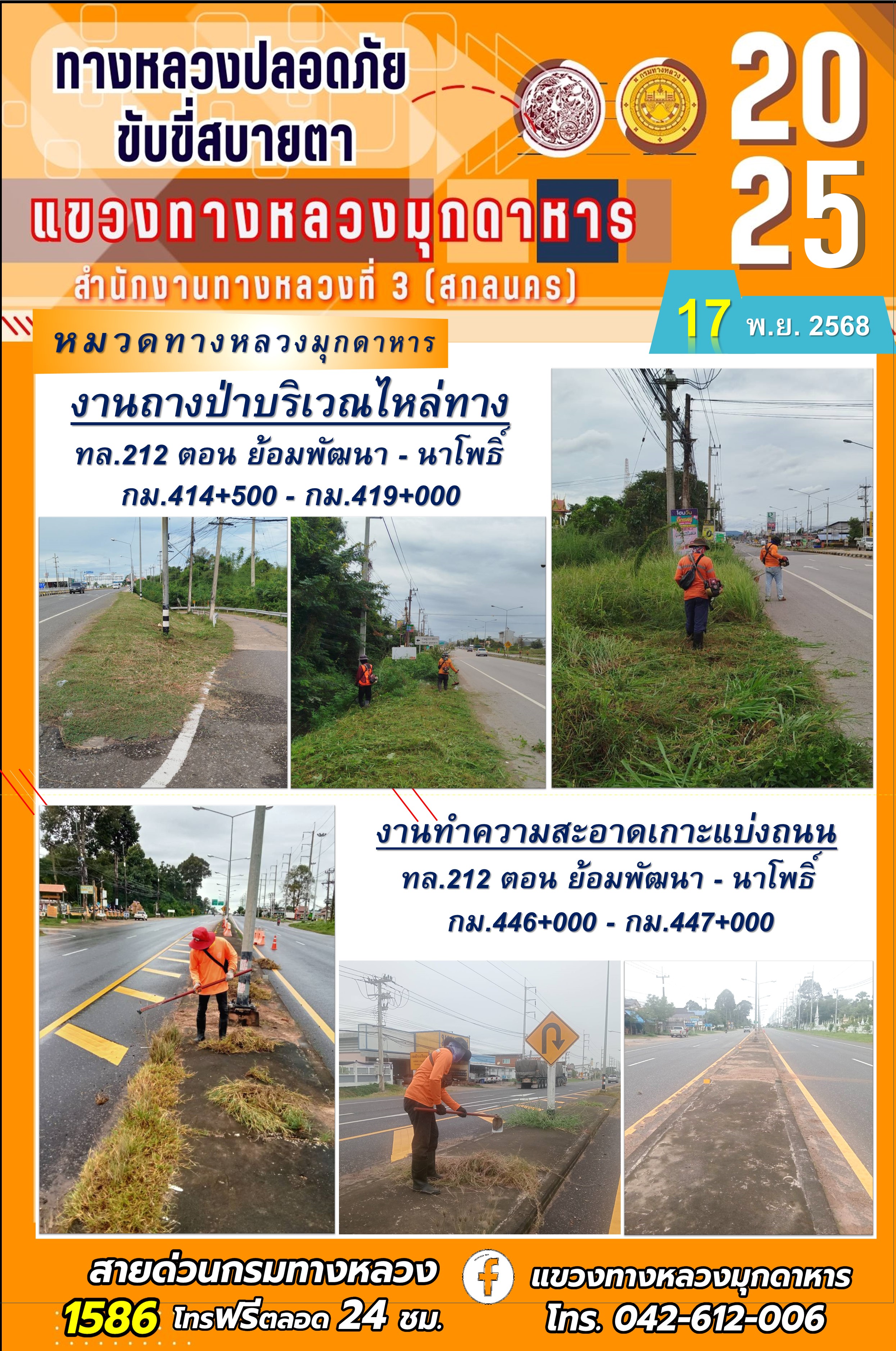 ประจำวันที่ 17.11.2568 โครงการทางหลวงปลอดภัย ขับขี่สบายตา หน่วยงานในสังกัดแขวงทางหลวงมุกดาหาร