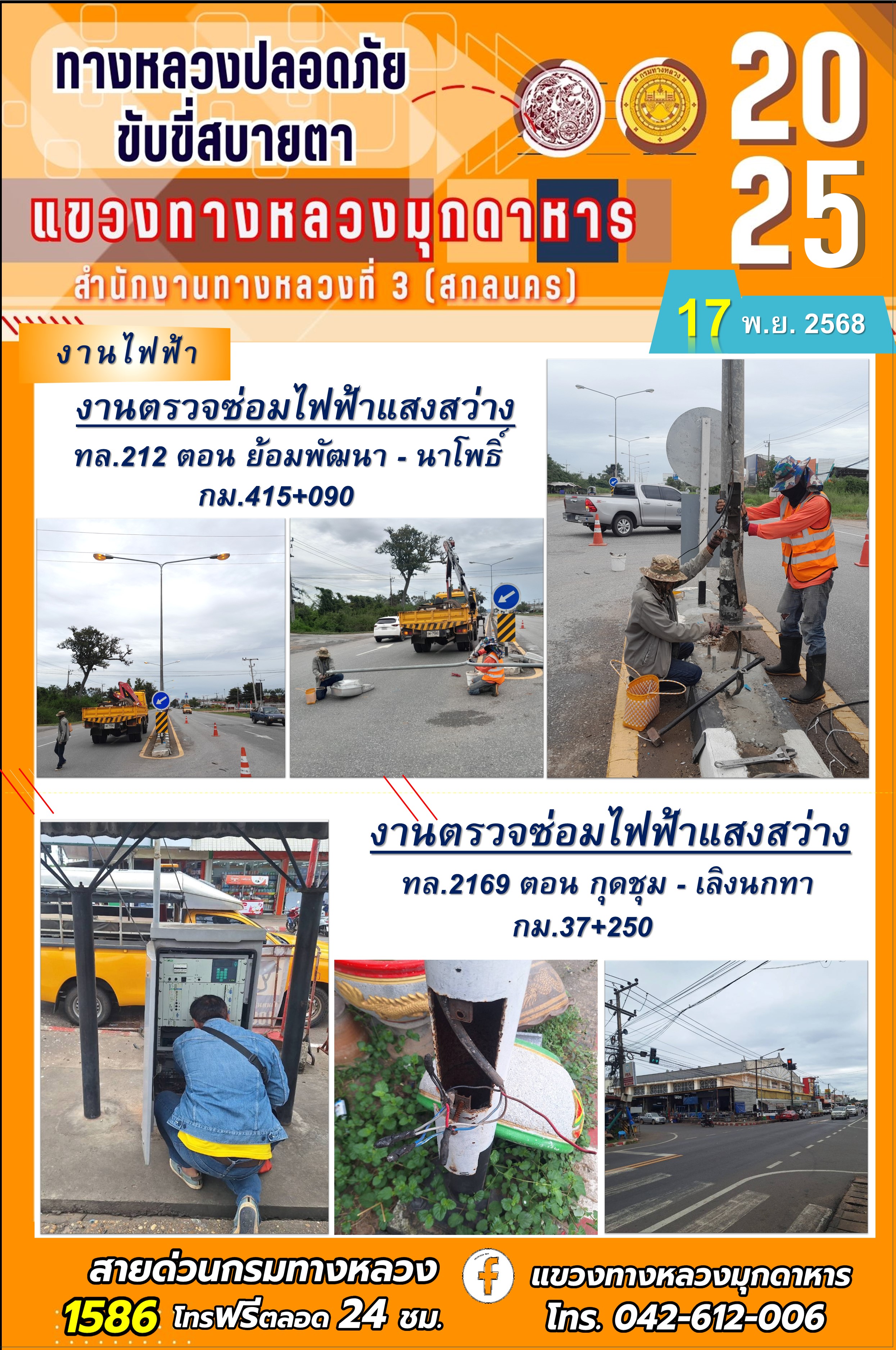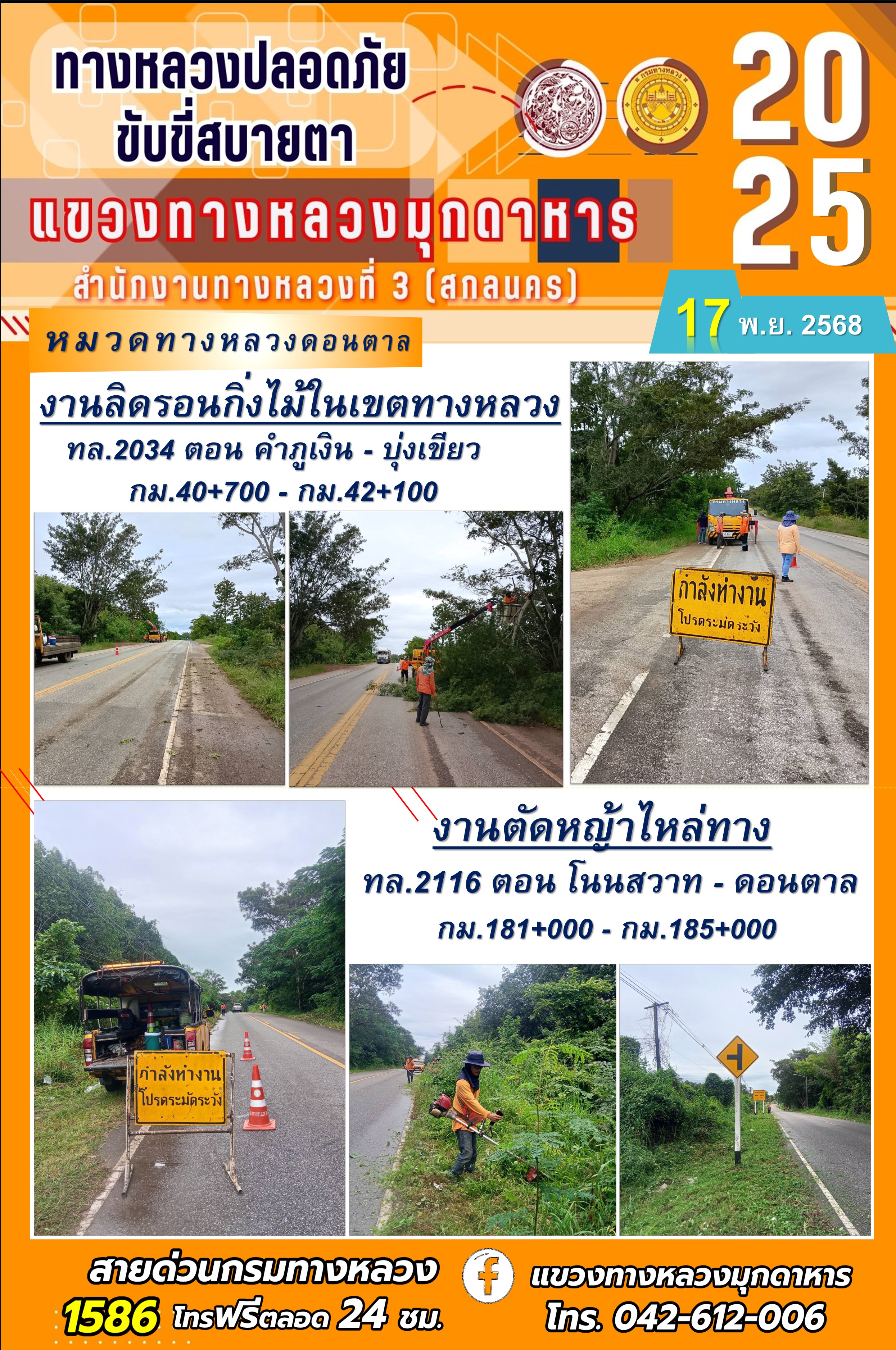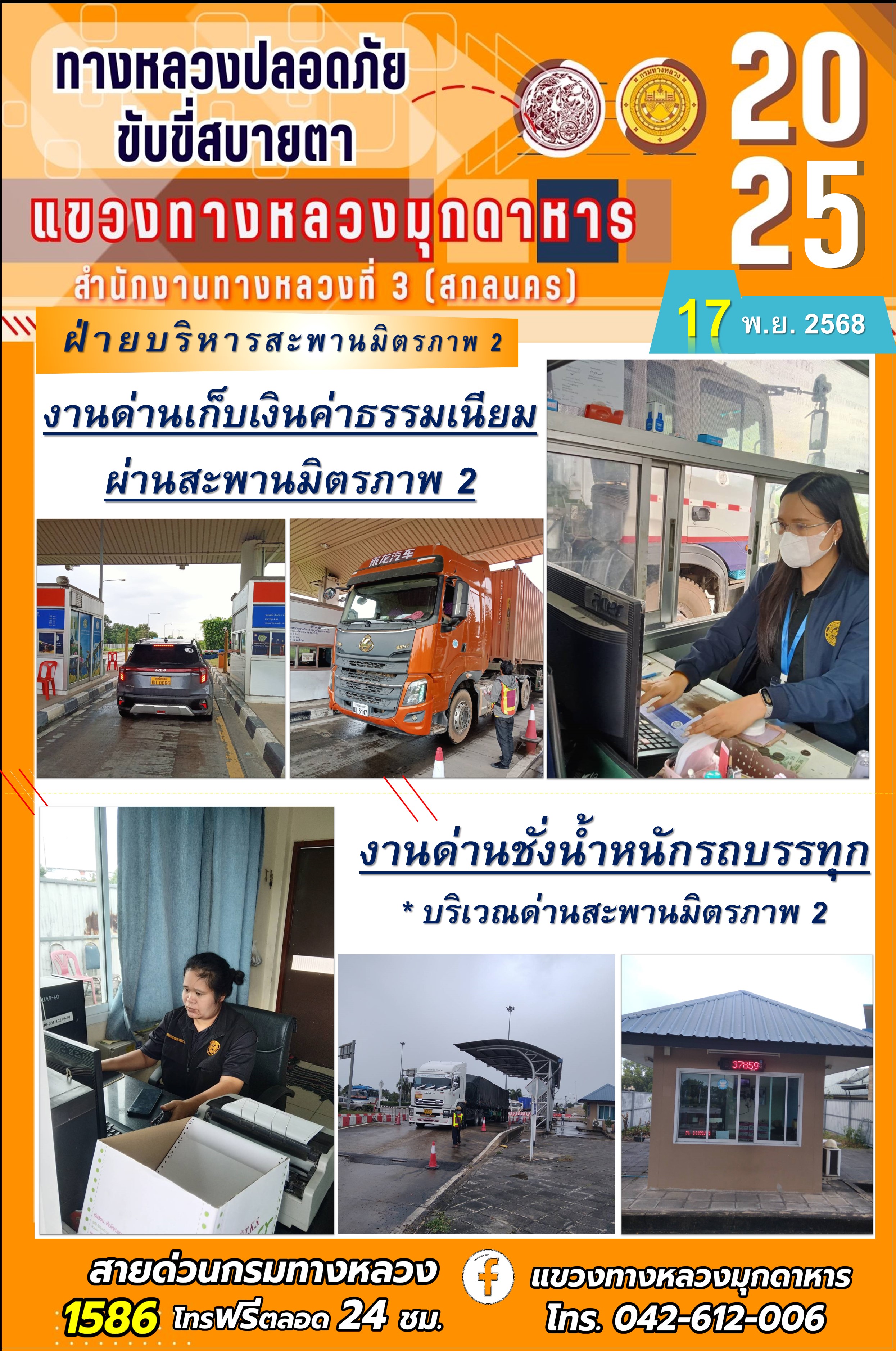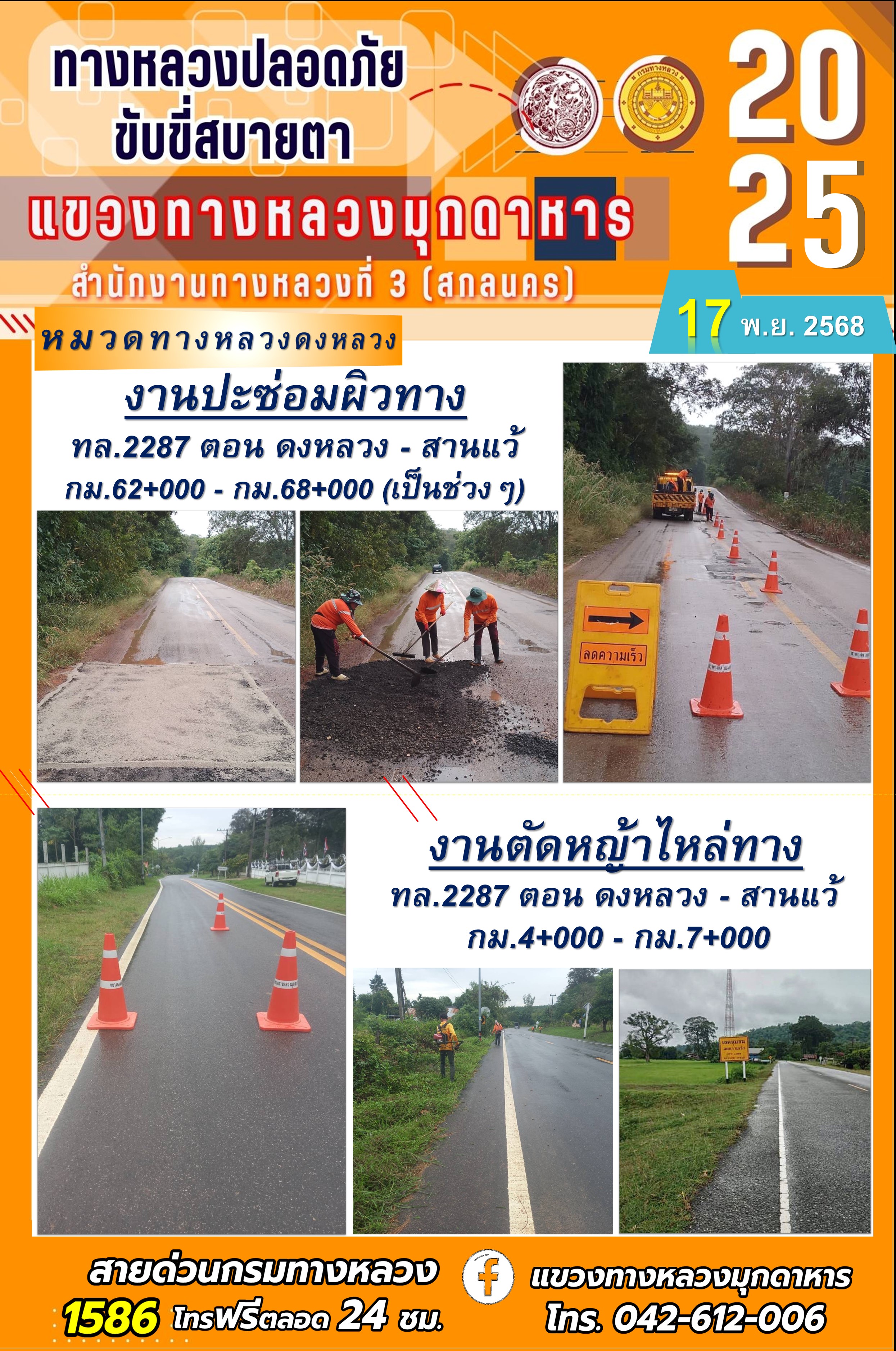 ประจำวันที่ 17.11.2568 โครงการทางหลวงปลอดภัย ขับขี่สบายตา หน่วยงานในสังกัดแขวงทางหลวงมุกดาหาร
