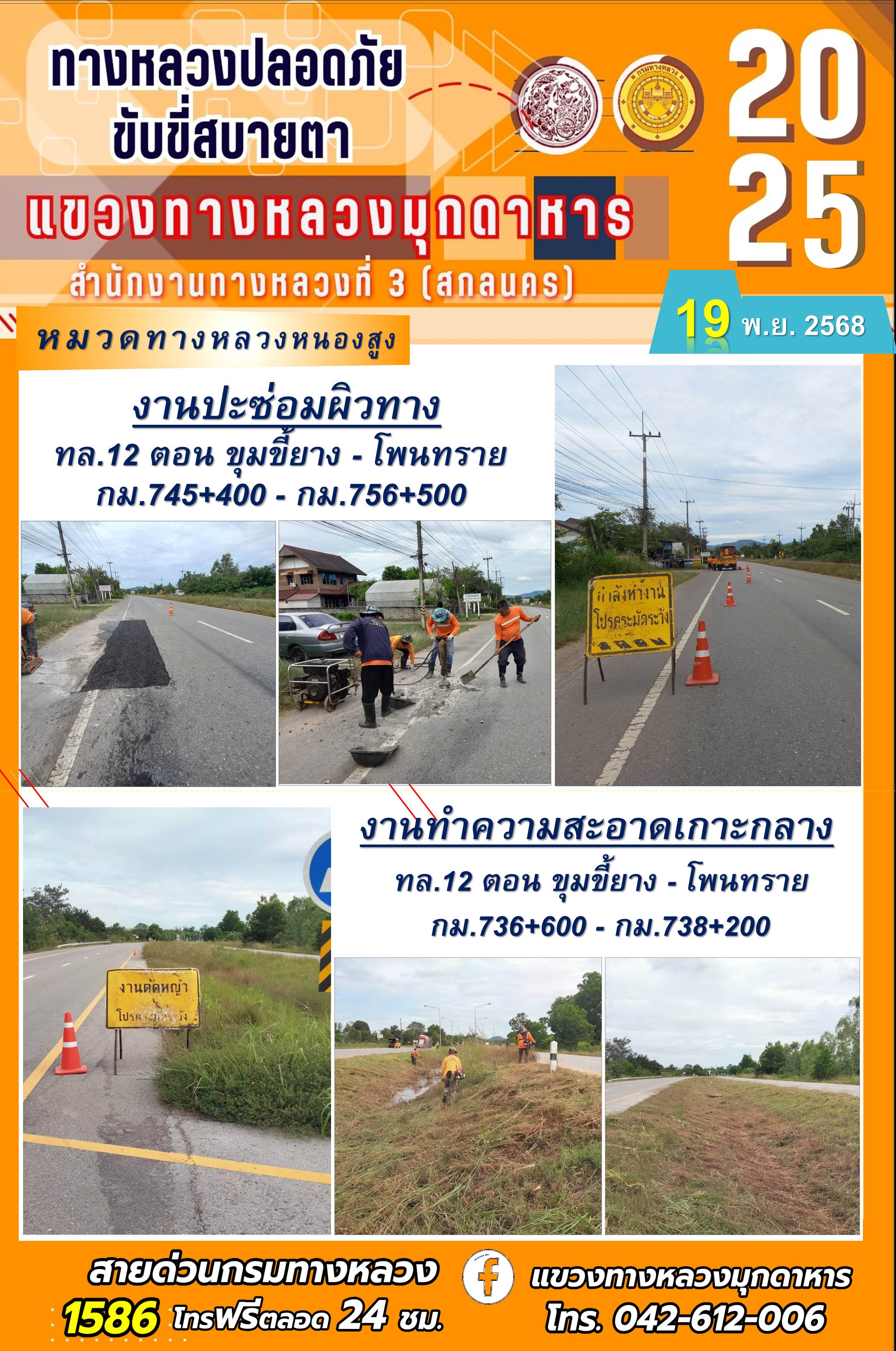 ประจำวันที่ 19.11.2568 โครงการทางหลวงปลอดภัย ขับขี่สบายตา หน่วยงานในสังกัดแขวงทางหลวงมุกดาหาร
