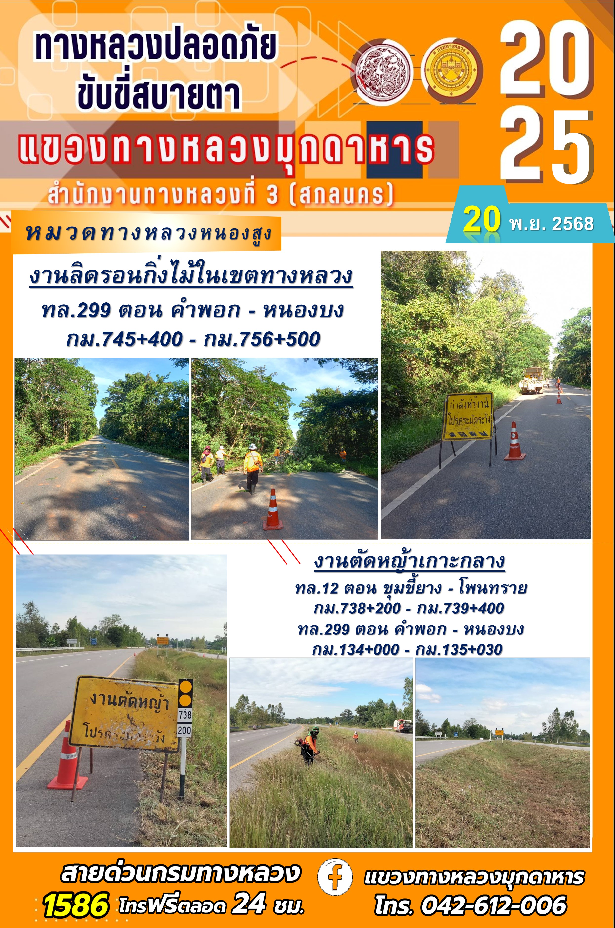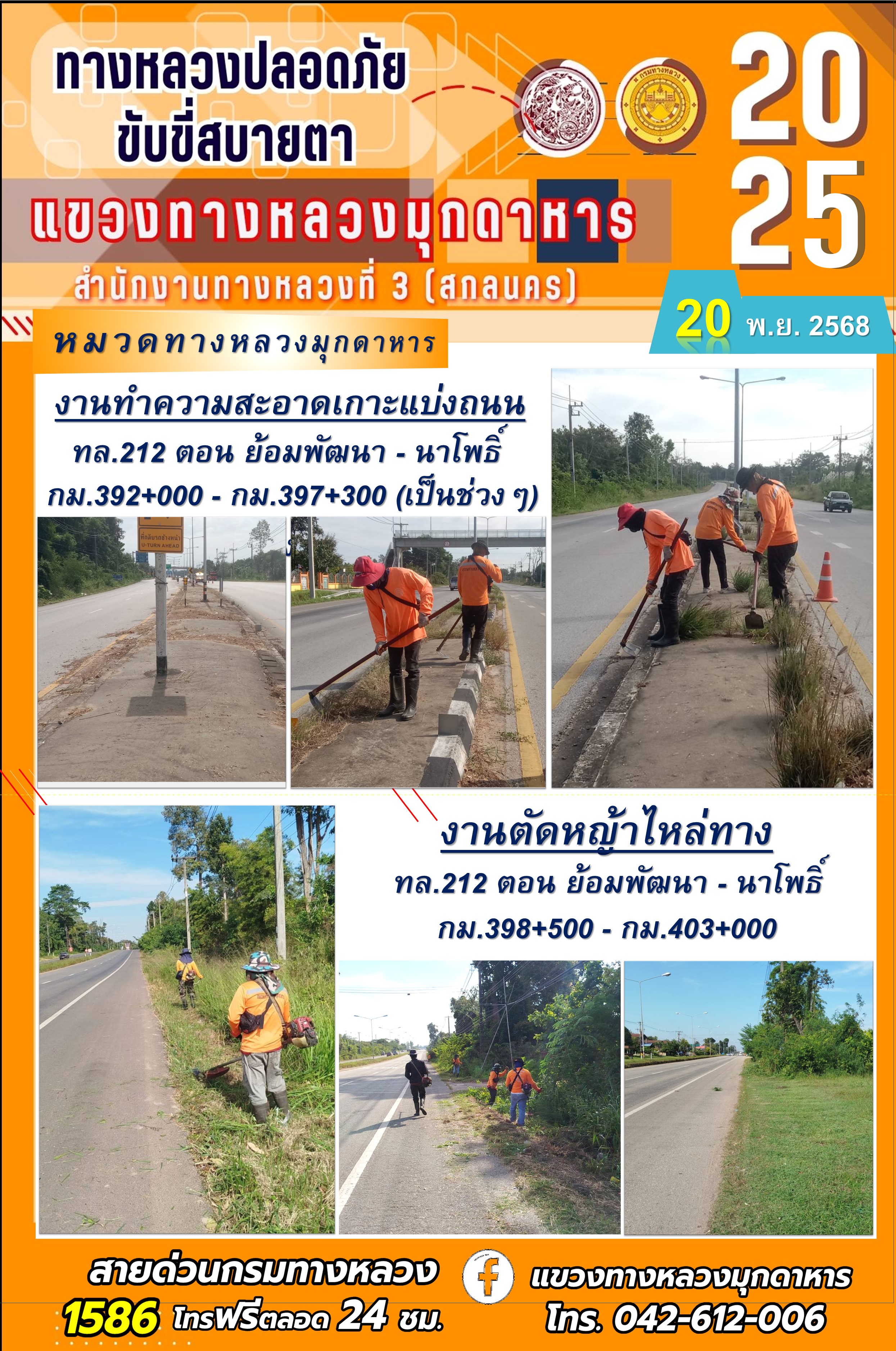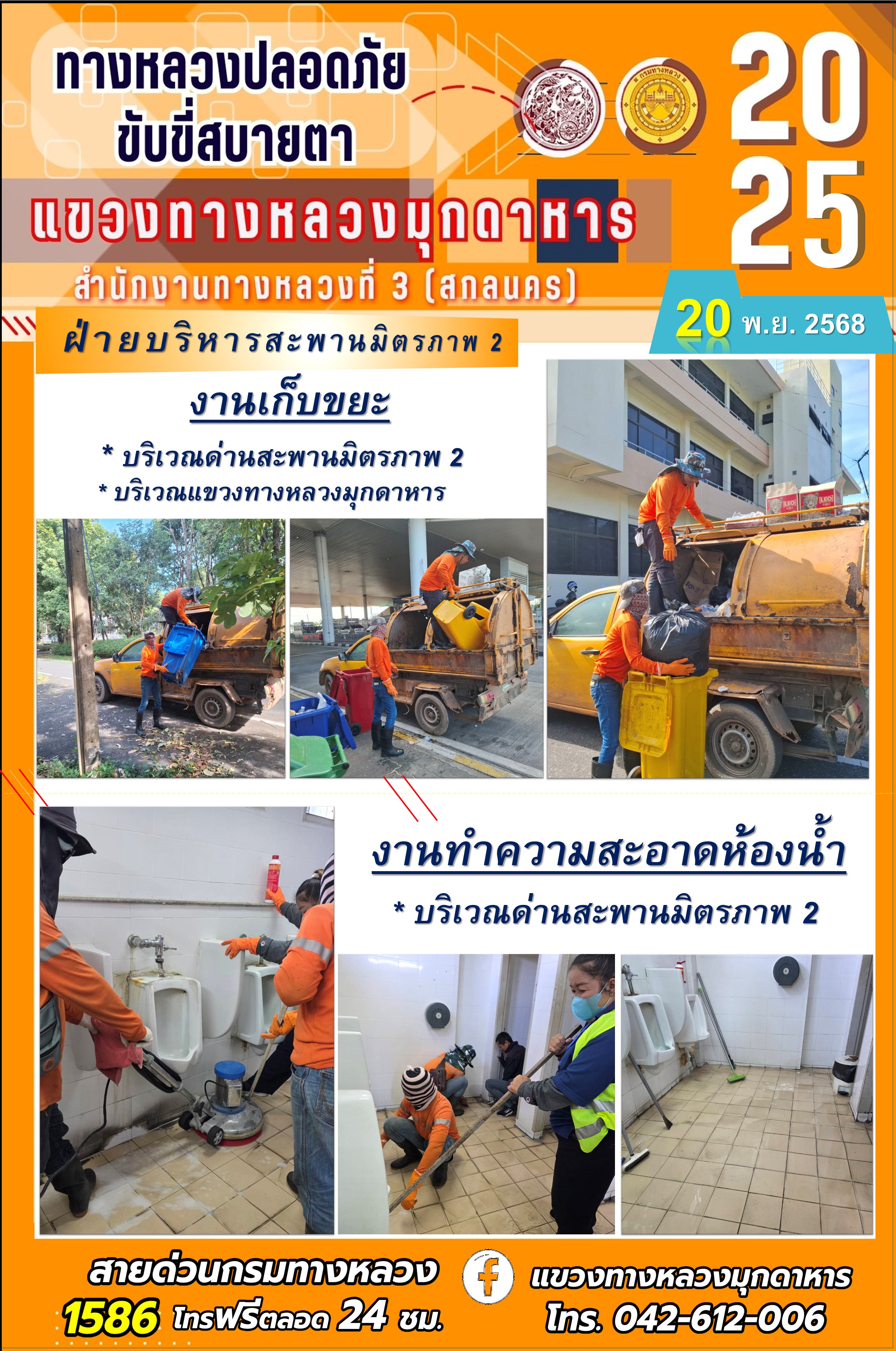 ประจำวันที่ 20.11.2568 โครงการทางหลวงปลอดภัย ขับขี่สบายตา หน่วยงานในสังกัดแขวงทางหลวงมุกดาหาร