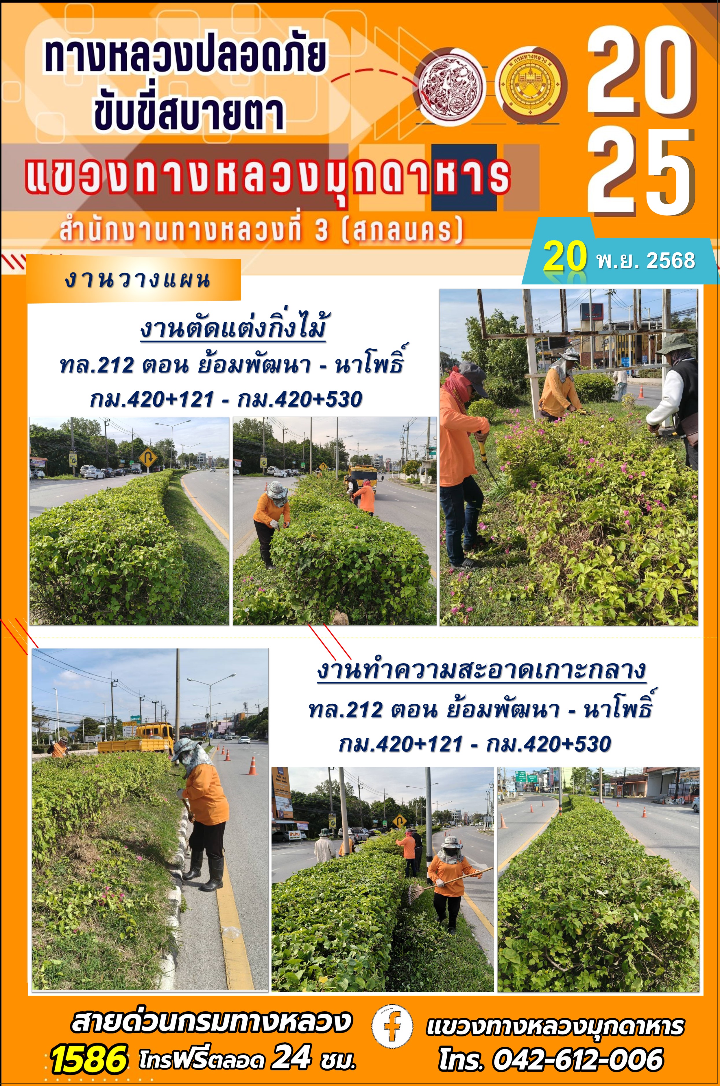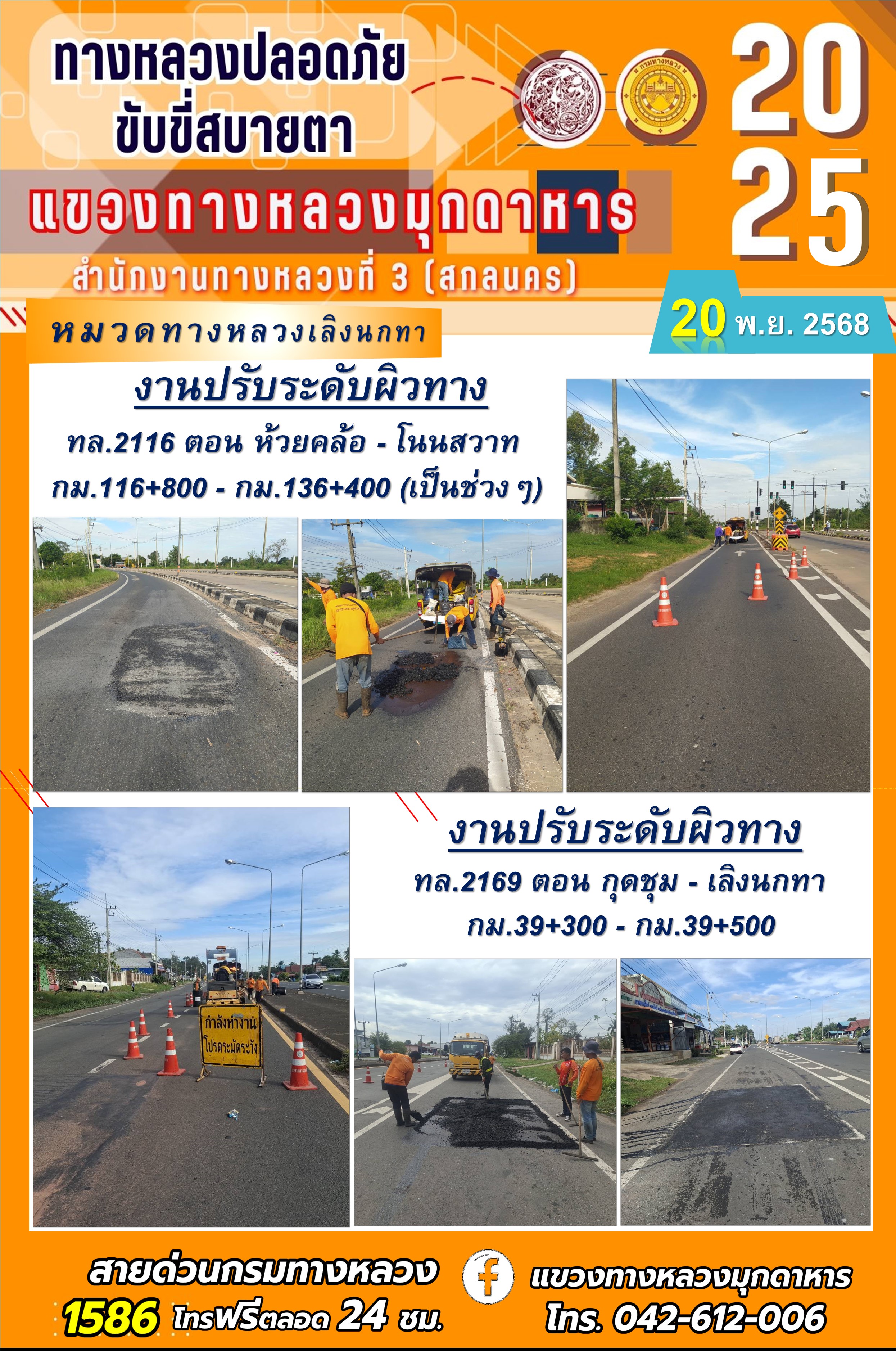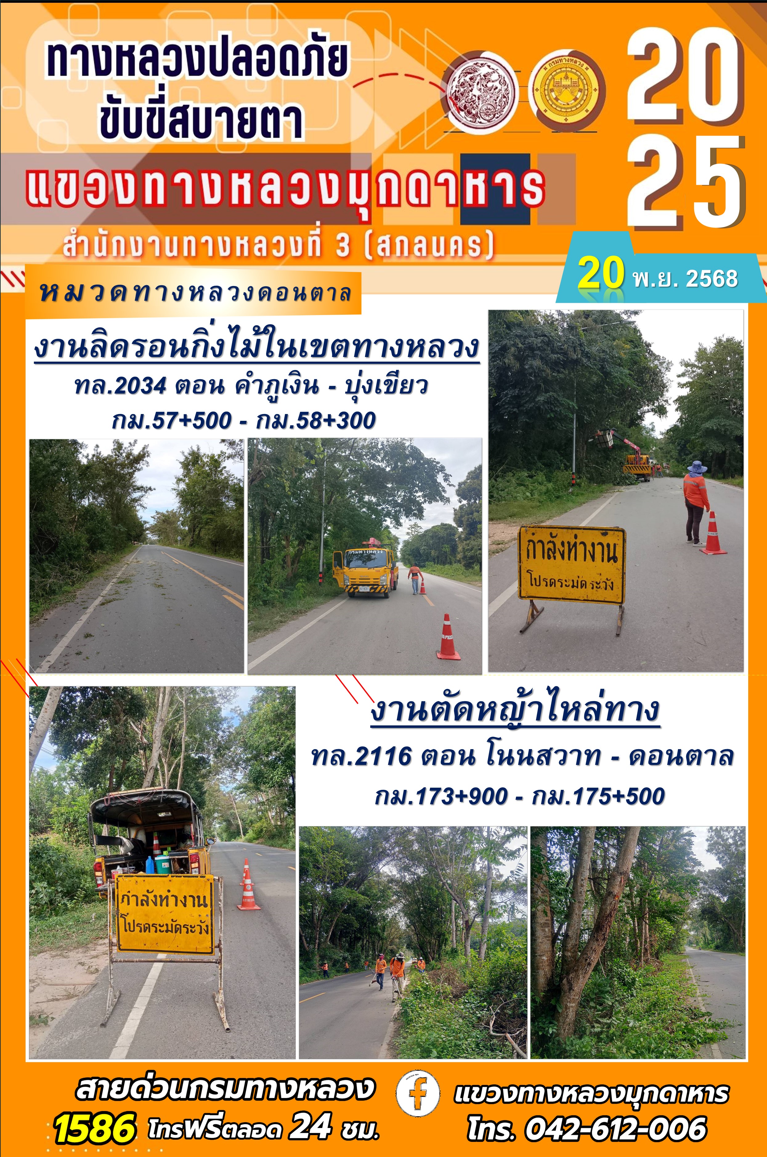 ประจำวันที่ 20.11.2568 โครงการทางหลวงปลอดภัย ขับขี่สบายตา หน่วยงานในสังกัดแขวงทางหลวงมุกดาหาร