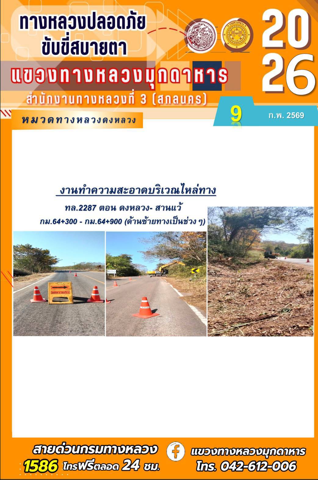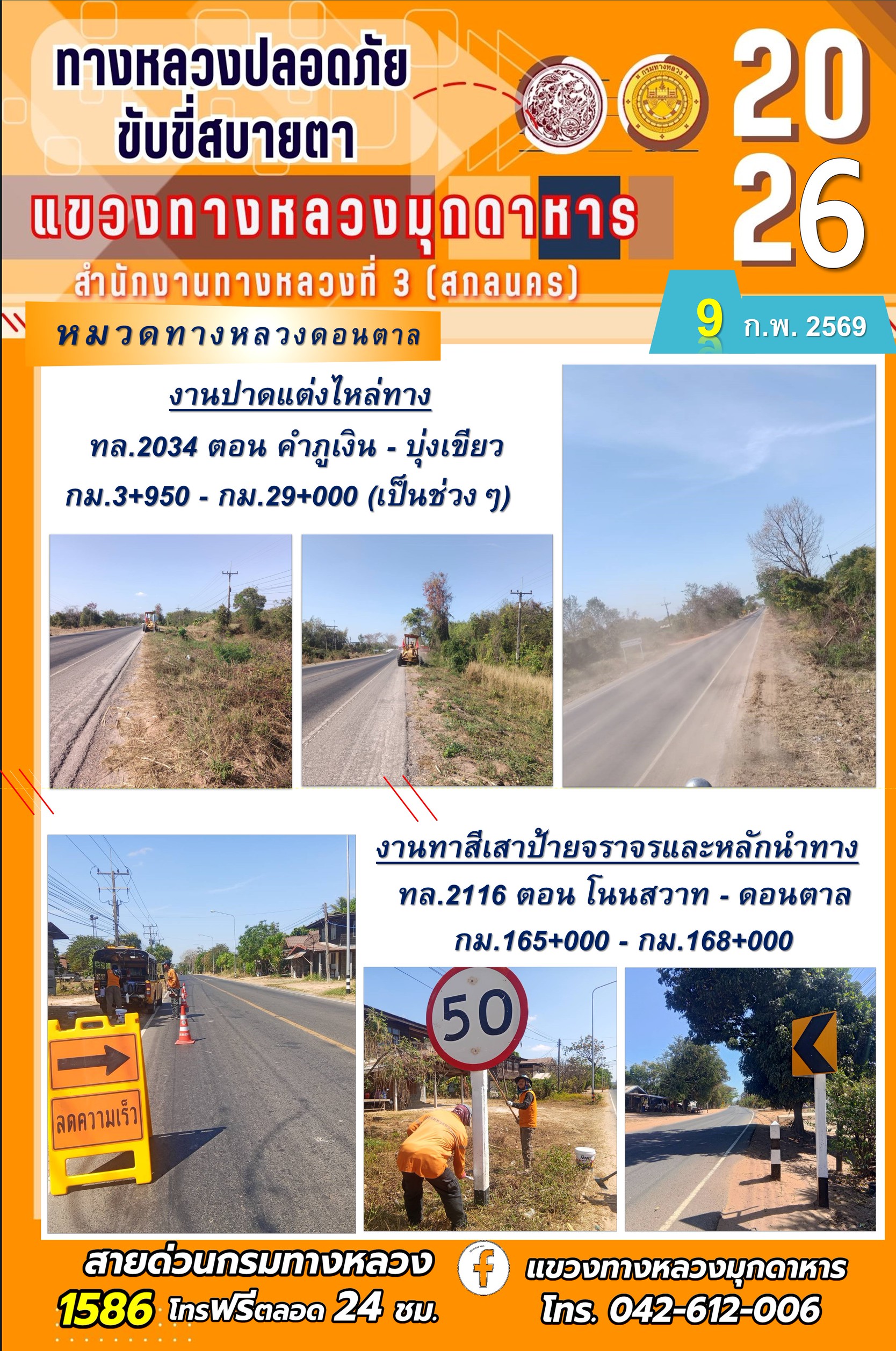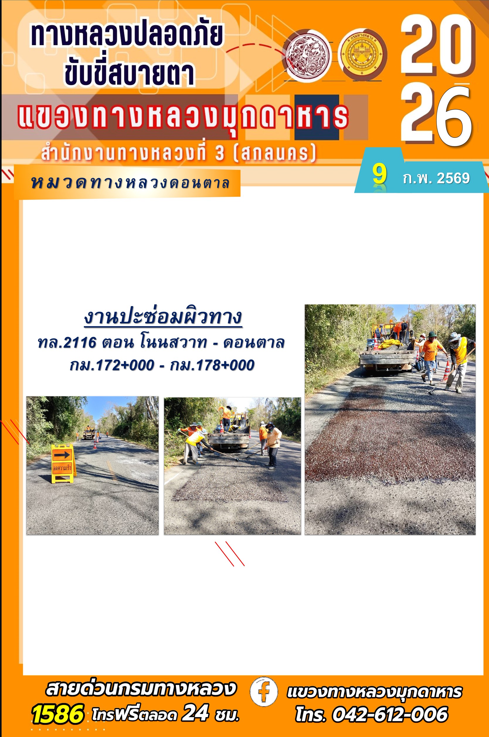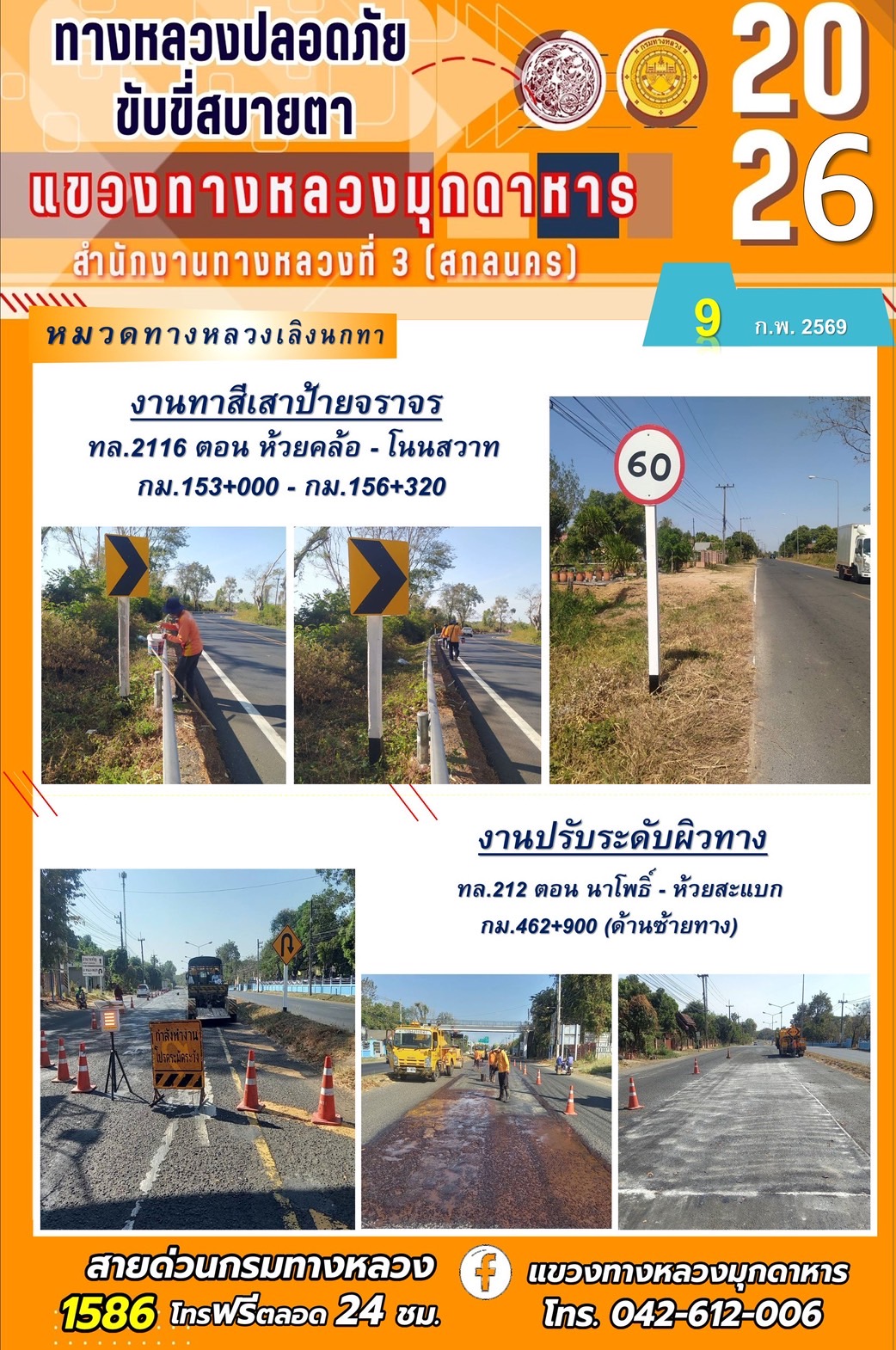 ประจำวันที่ 9 กุมภาพันธ์ 2569 โครงการทางหลวงปลอดภัย ขับขี่สบายตา หน่วยงานในสังกัดแขวงทางหลวง