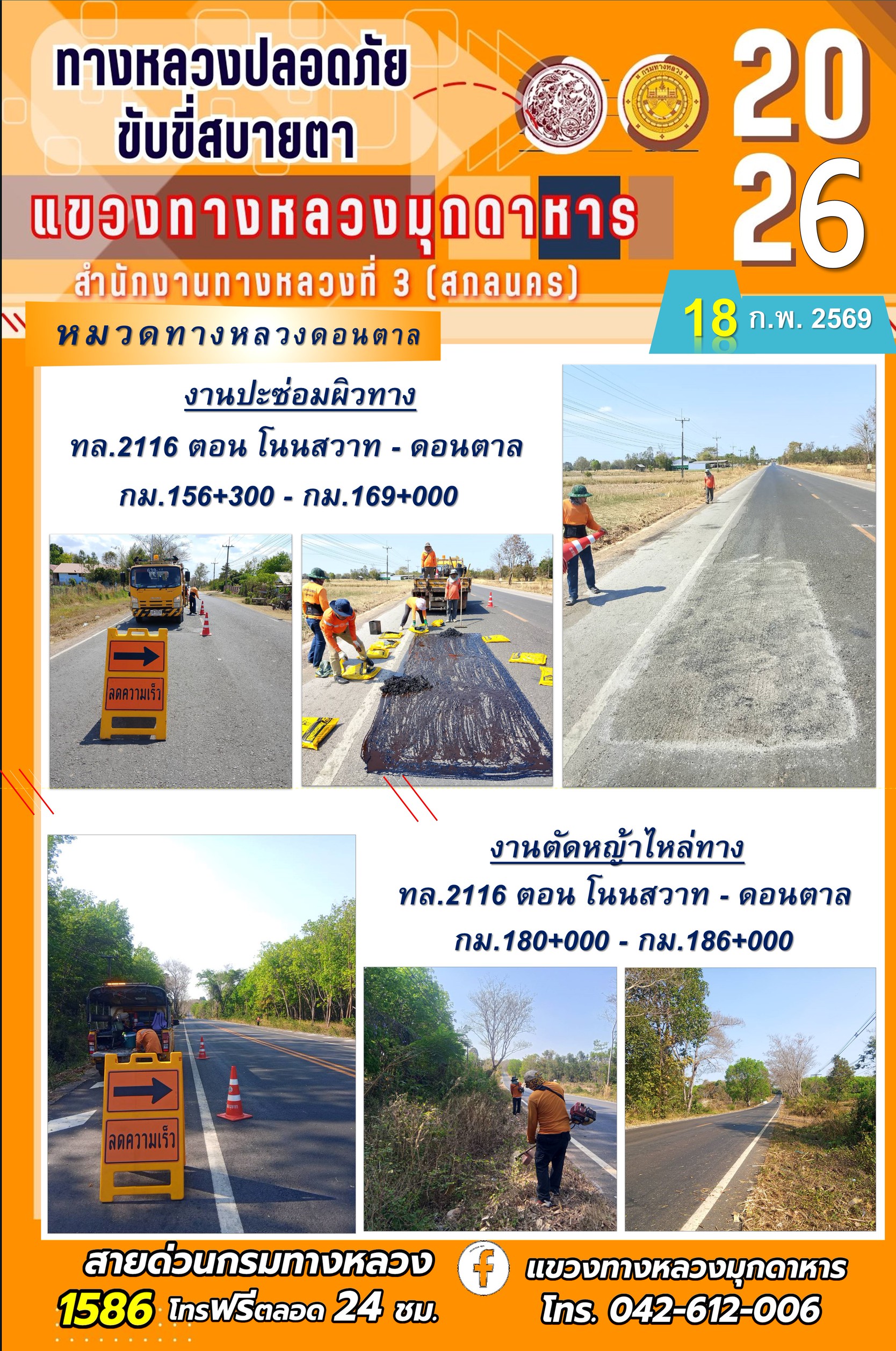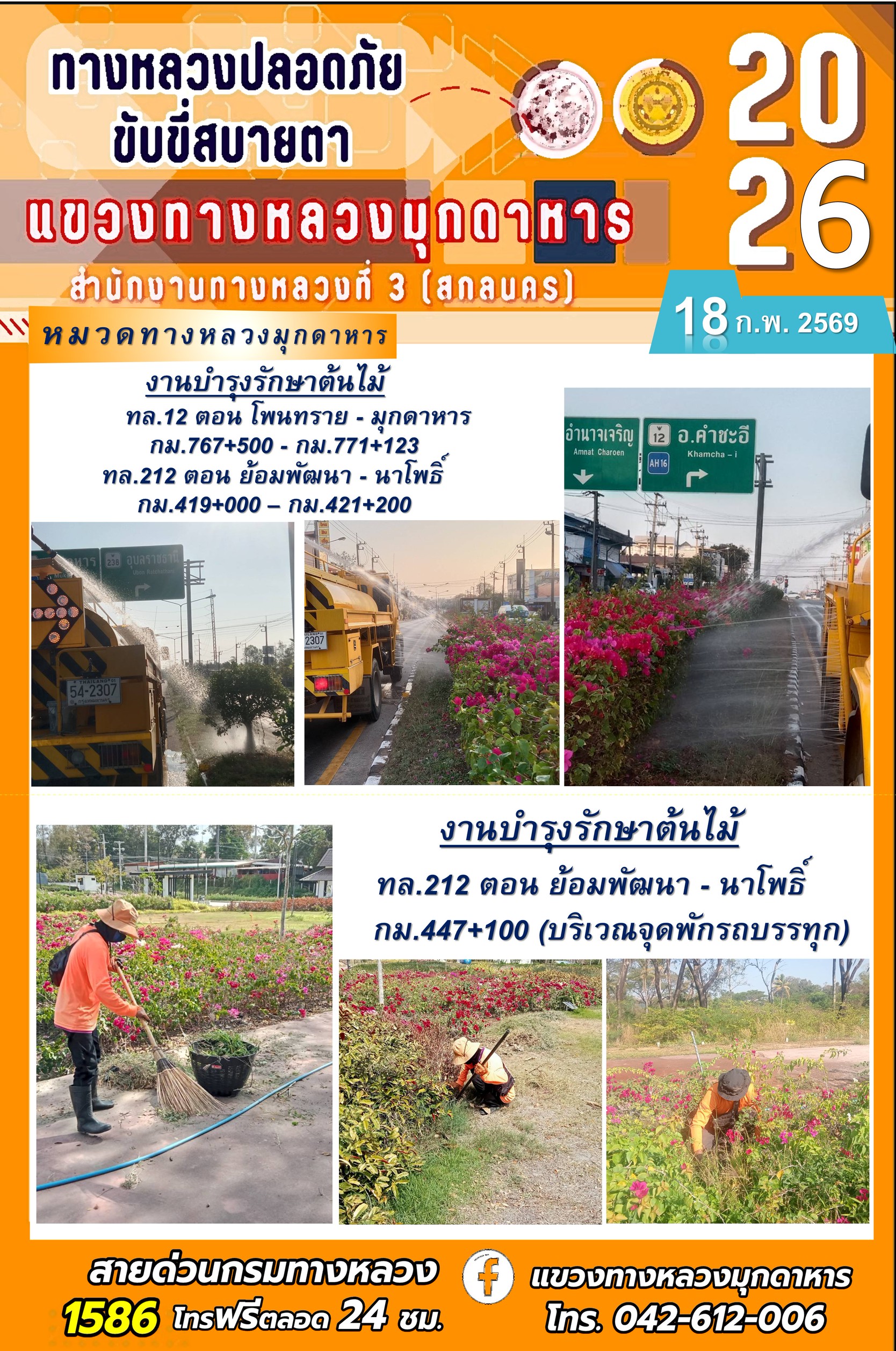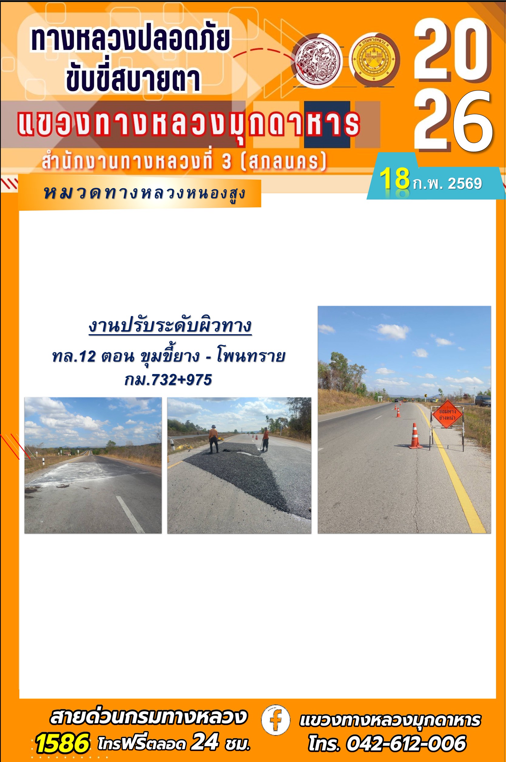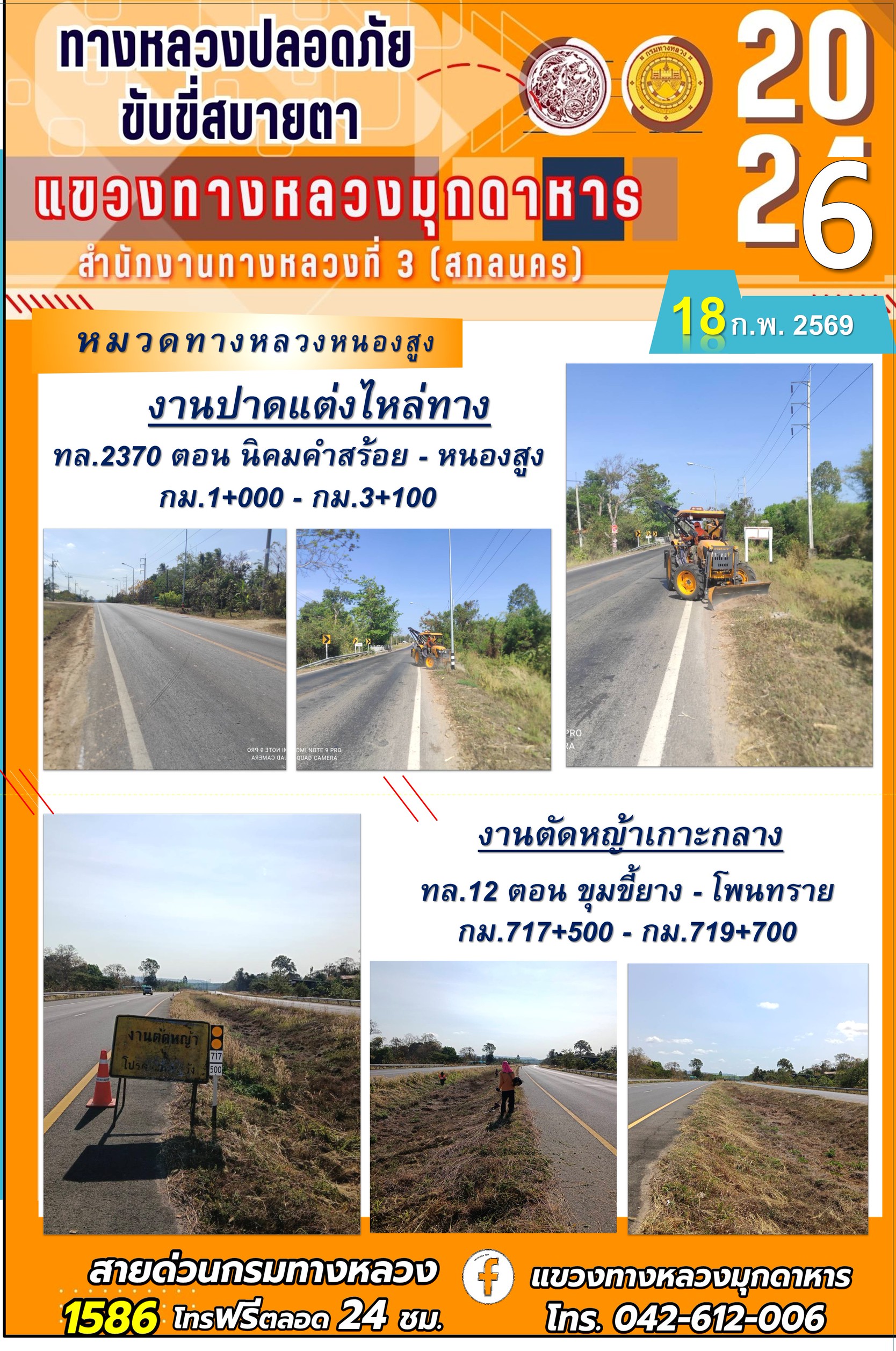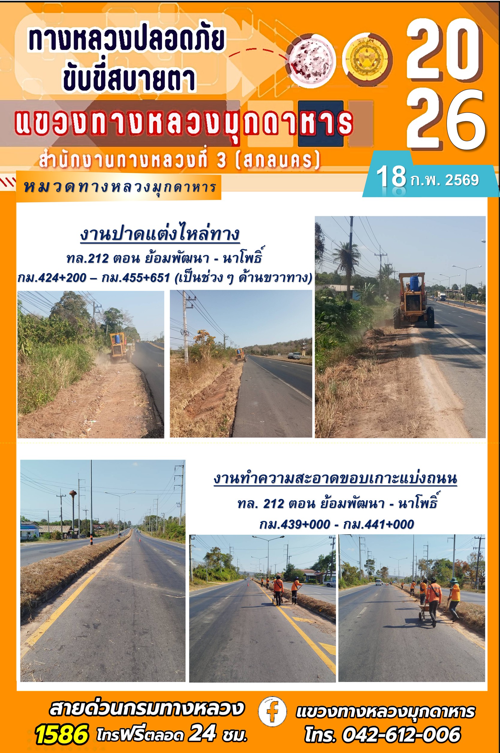 ประจำวันที่ 18 กุมภาพันธ์ 2569 โครงการทางหลวงปลอดภัย ขับขี่สบายตา หน่วยงานในสังกัดแขวงทางหลวง