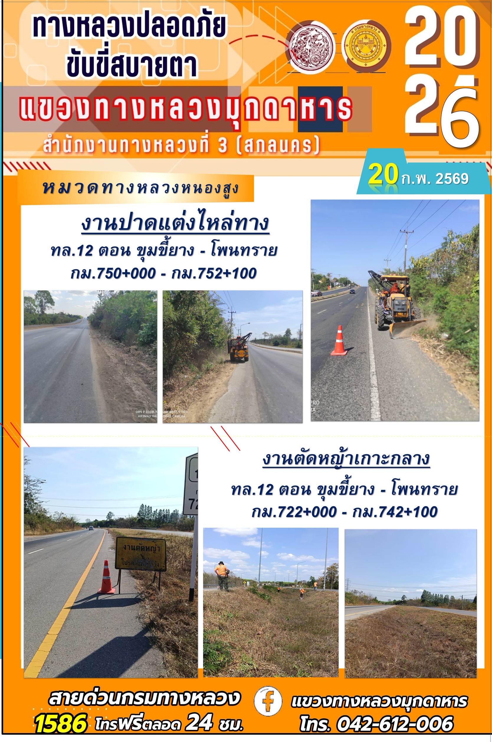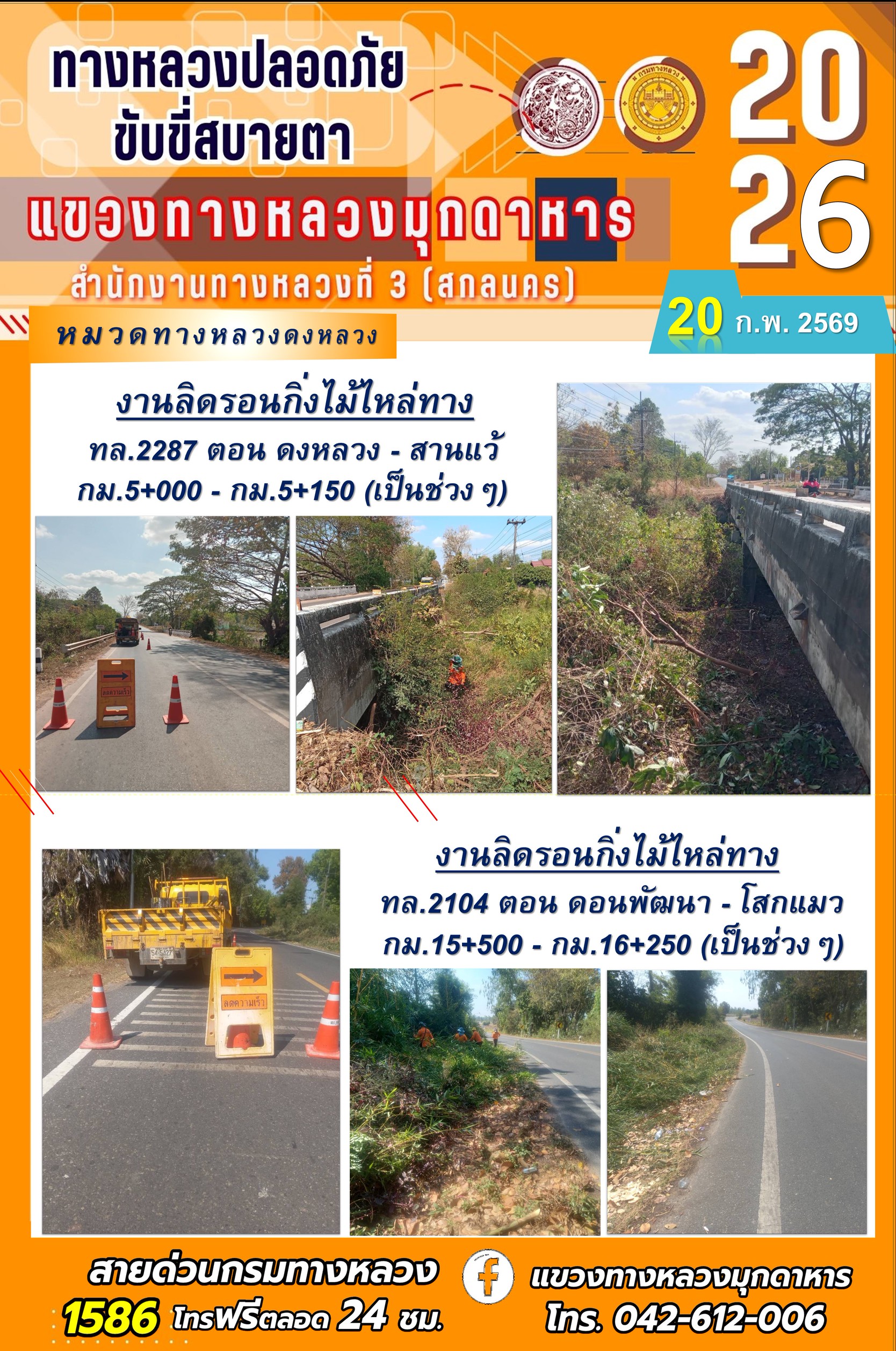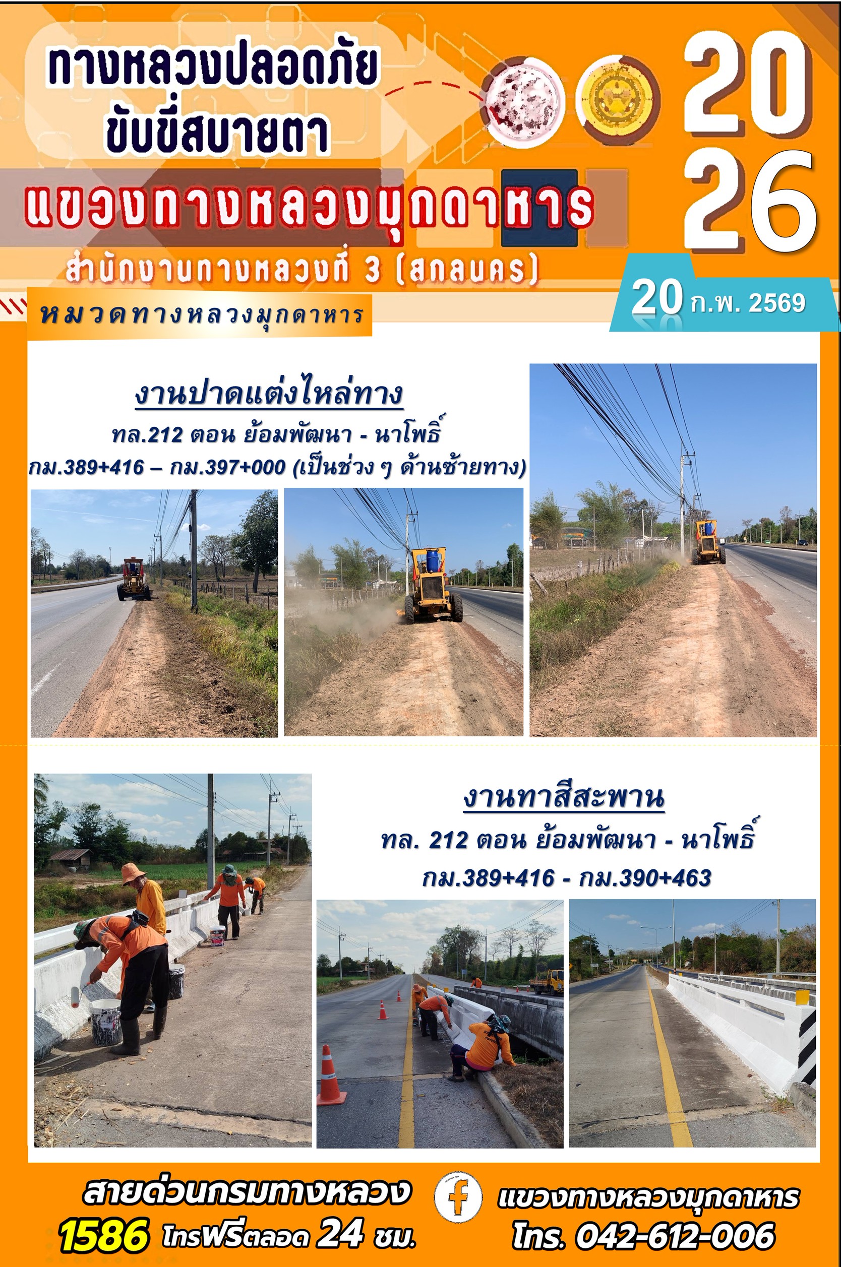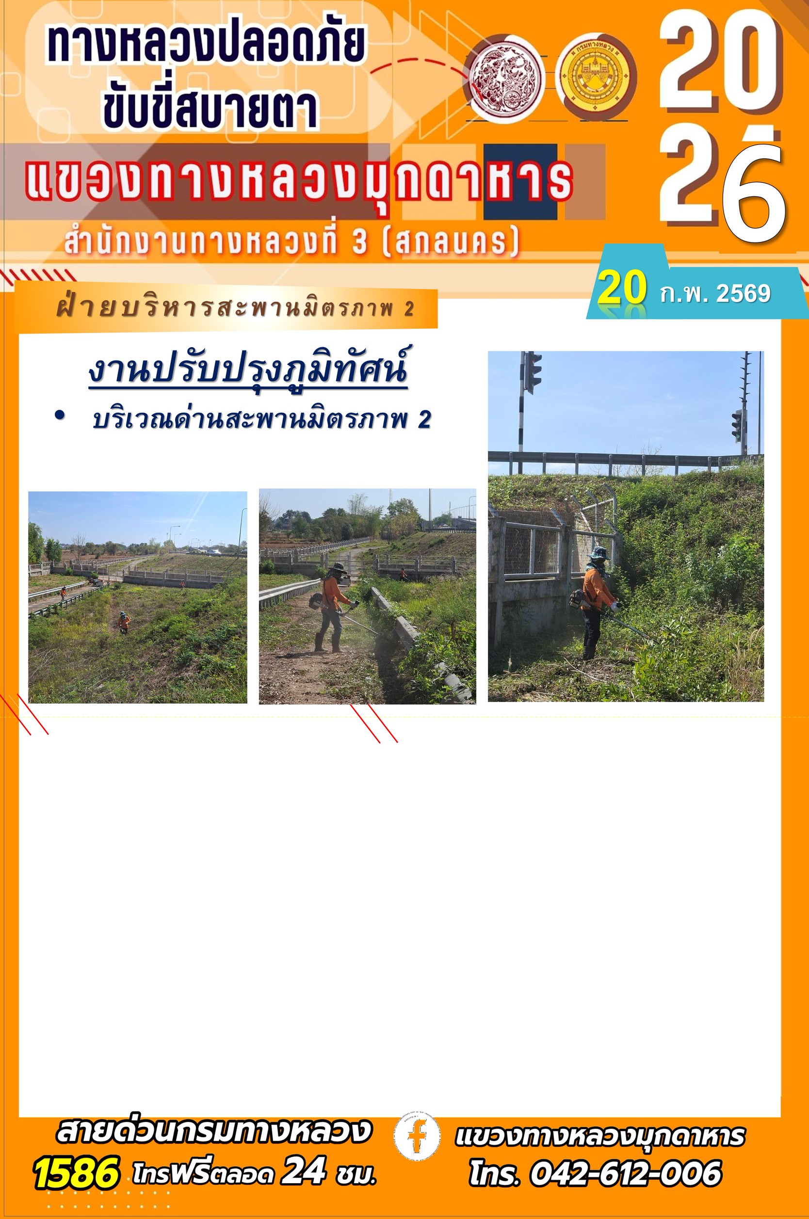 ประจำวันที่ 20 กุมภาพันธ์ 2569 โครงการทางหลวงปลอดภัย ขับขี่สบายตา หน่วยงานในสังกัดแขวงทางหลวง