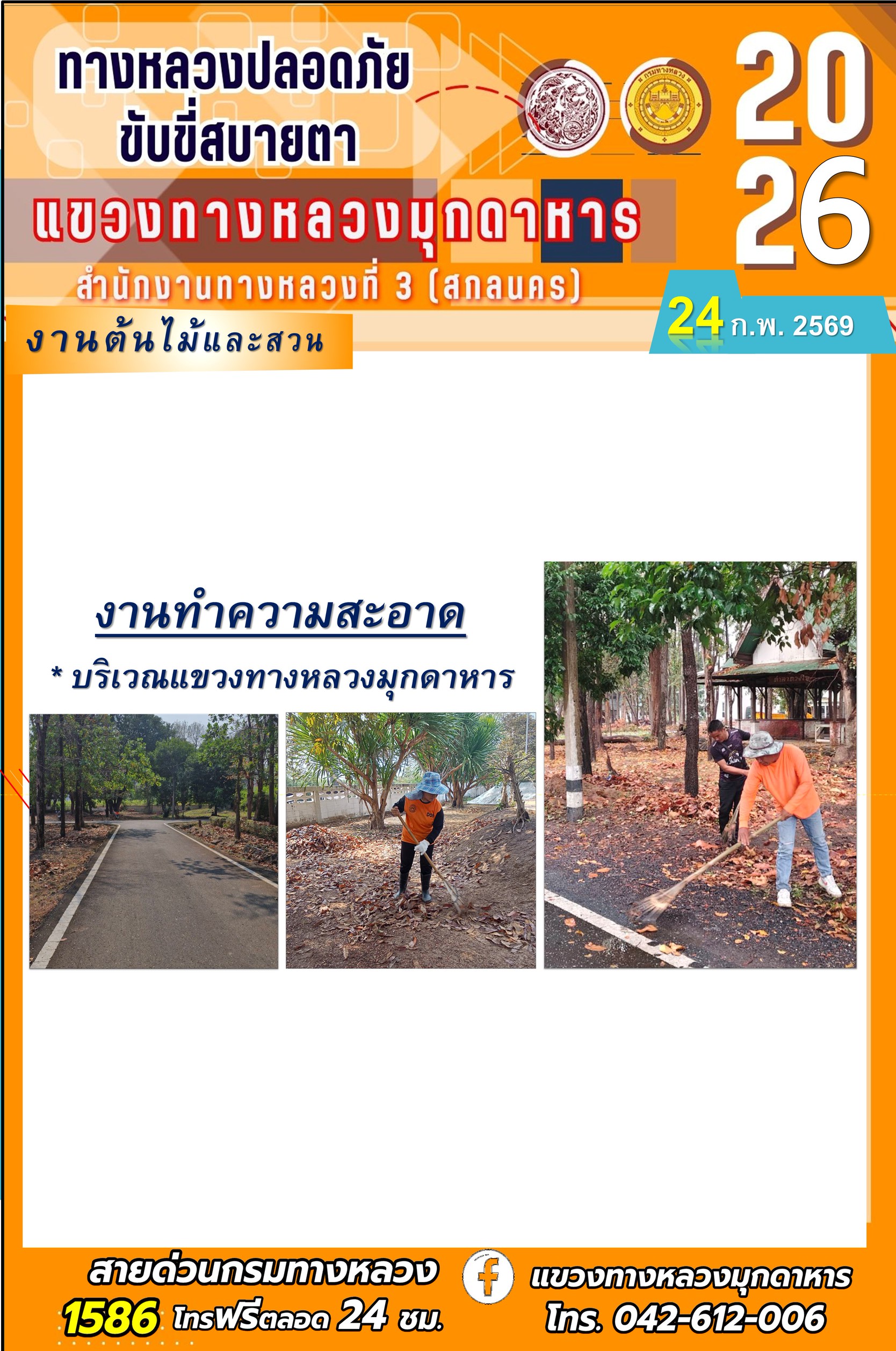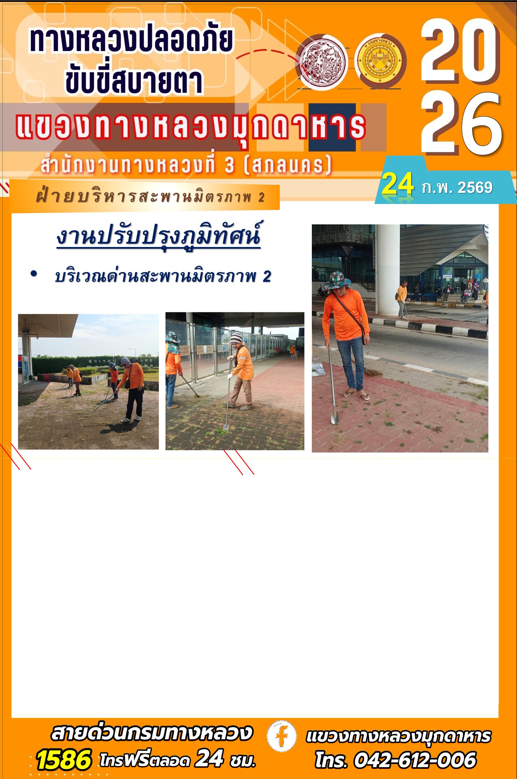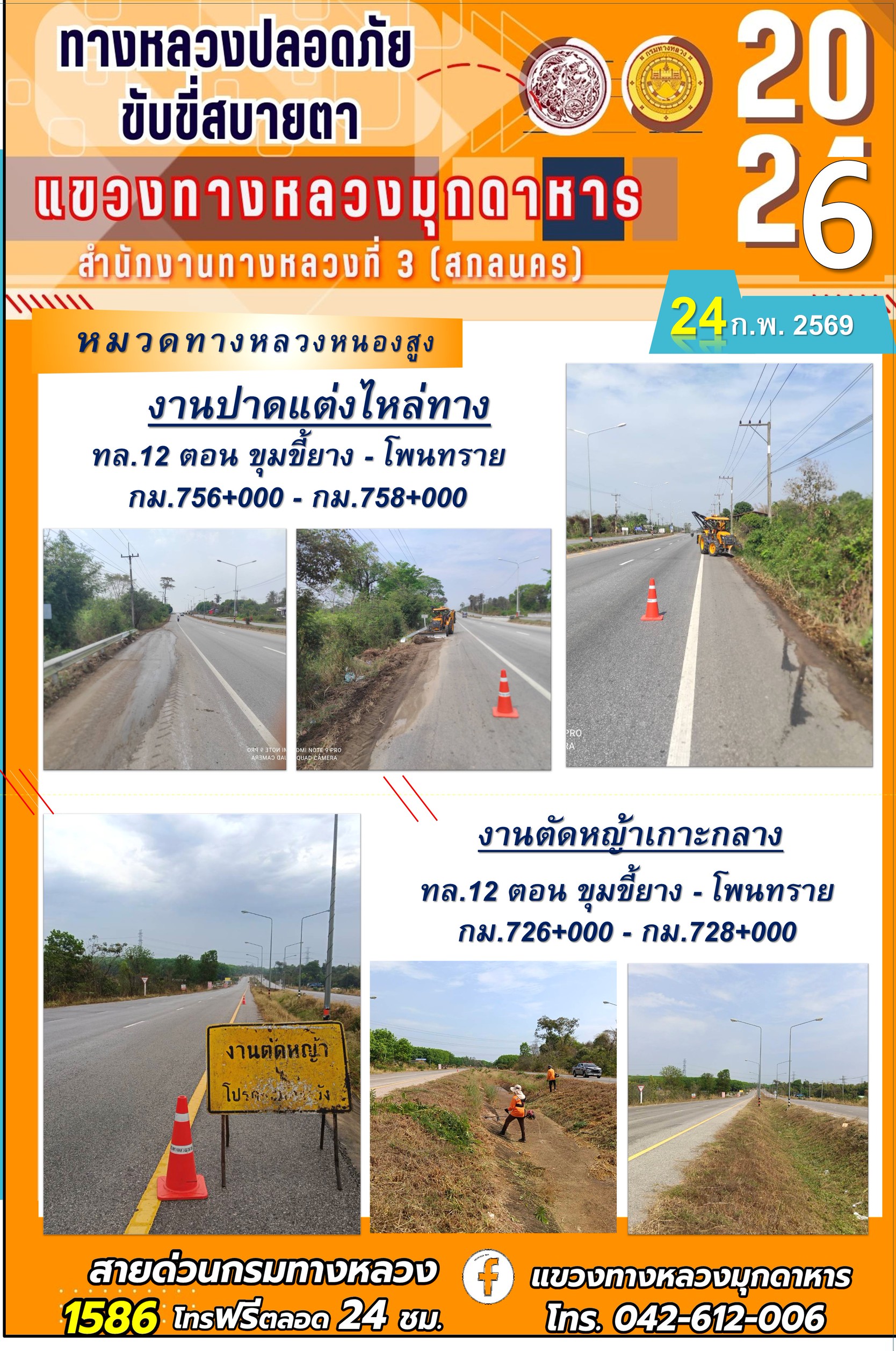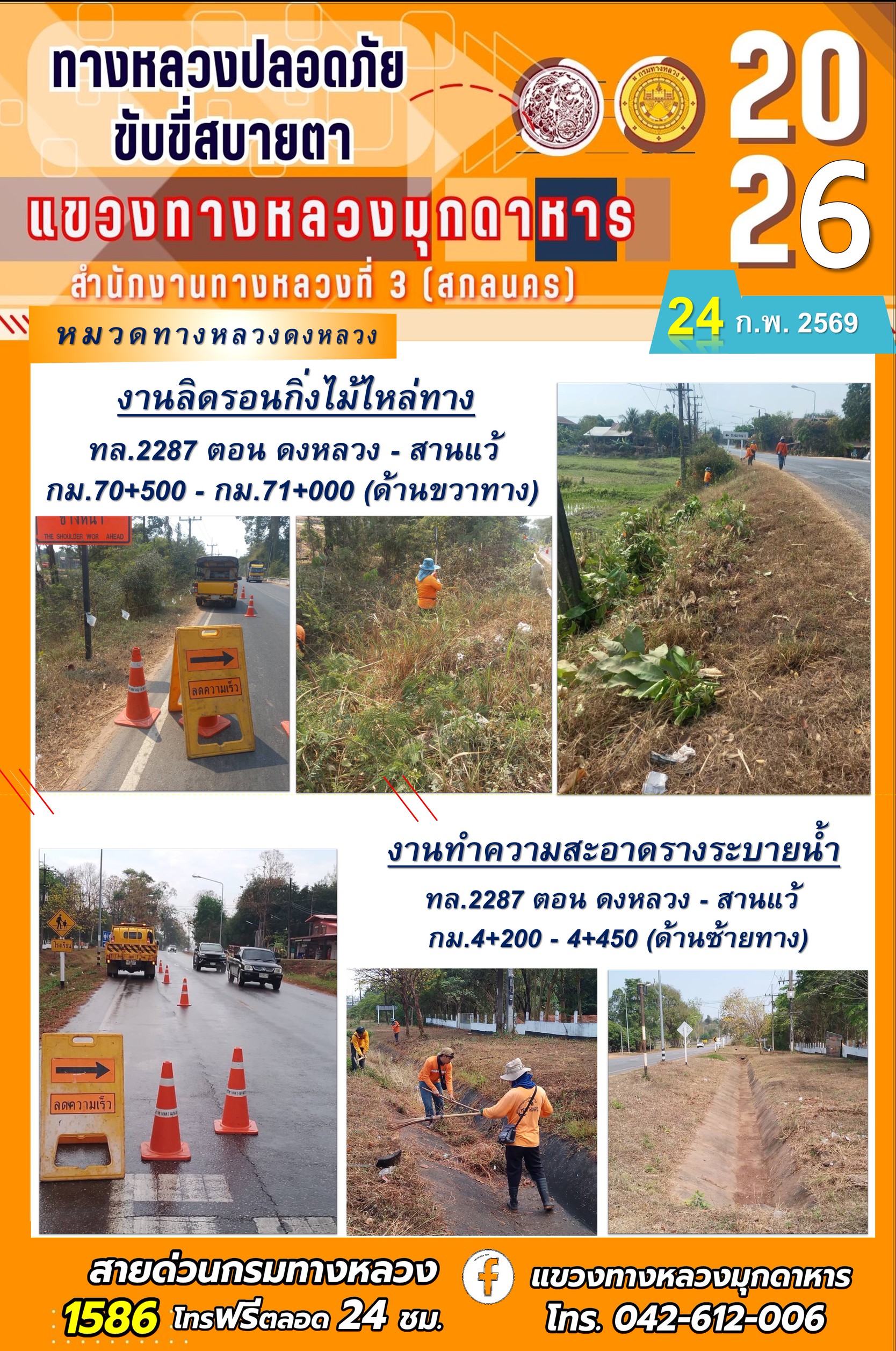 ประจำวันที่ 24 กุมภาพันธ์ 2569 โครงการทางหลวงปลอดภัย ขับขี่สบายตา หน่วยงานในสังกัดแขวงทางหลวง