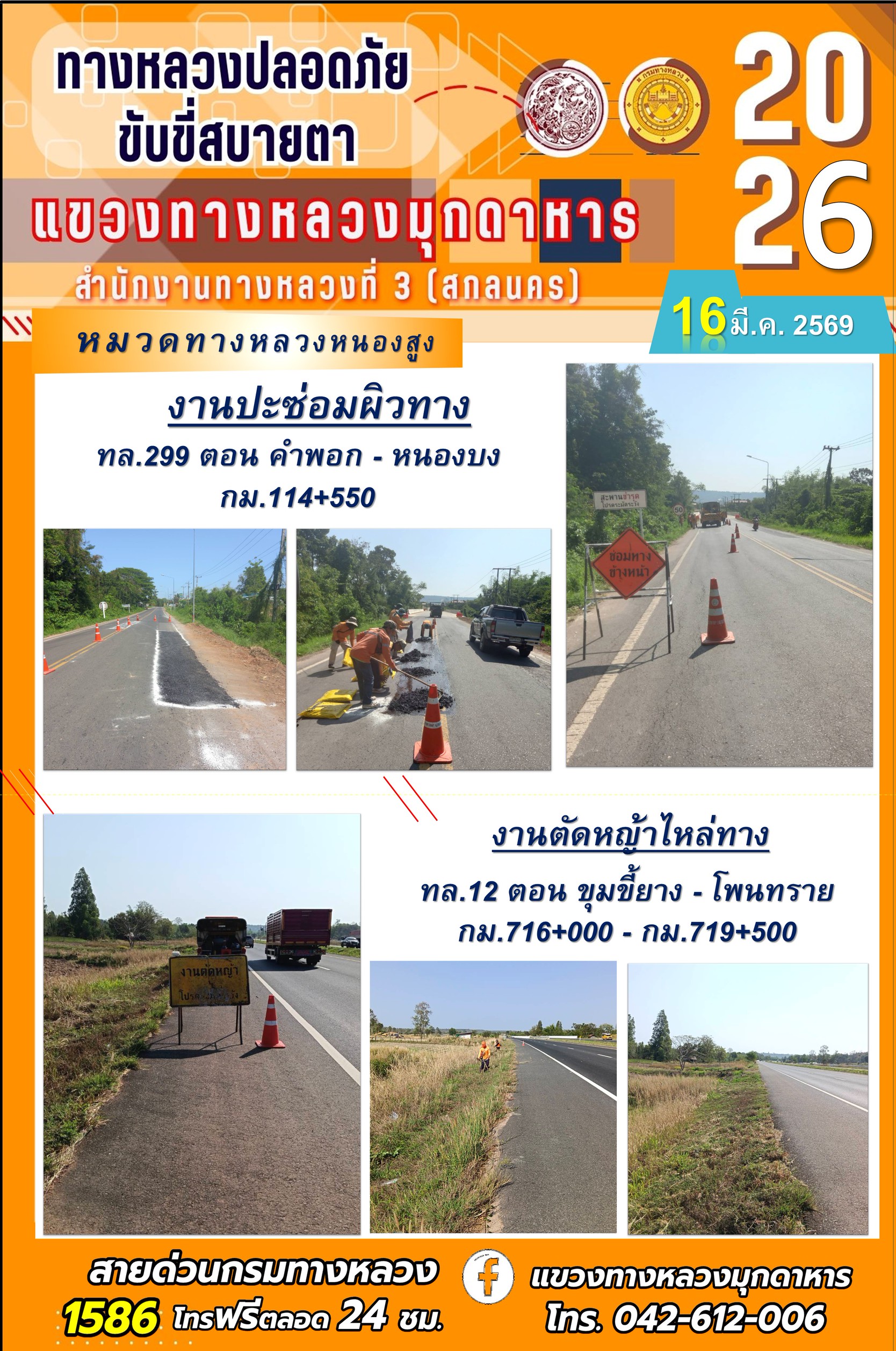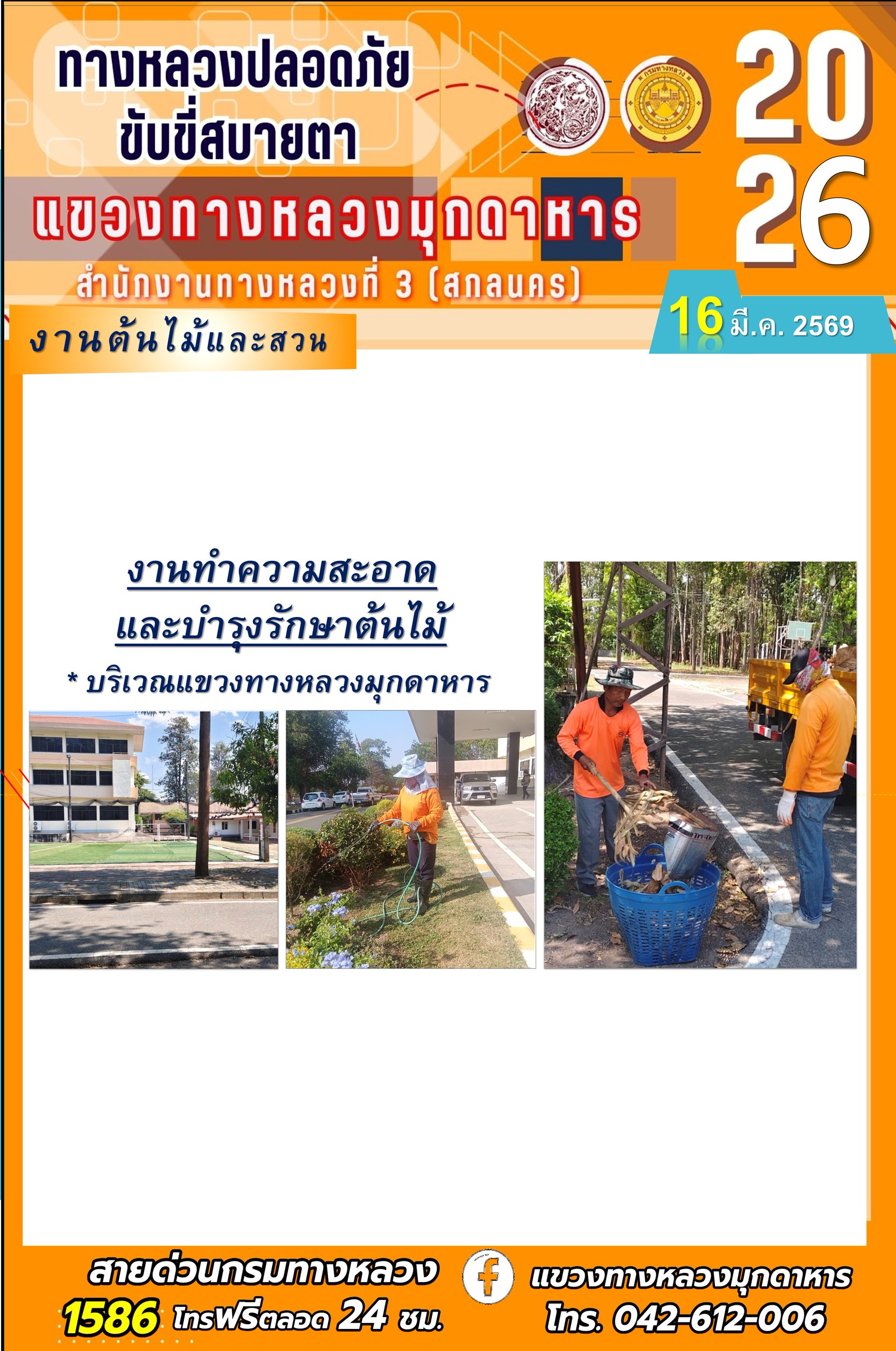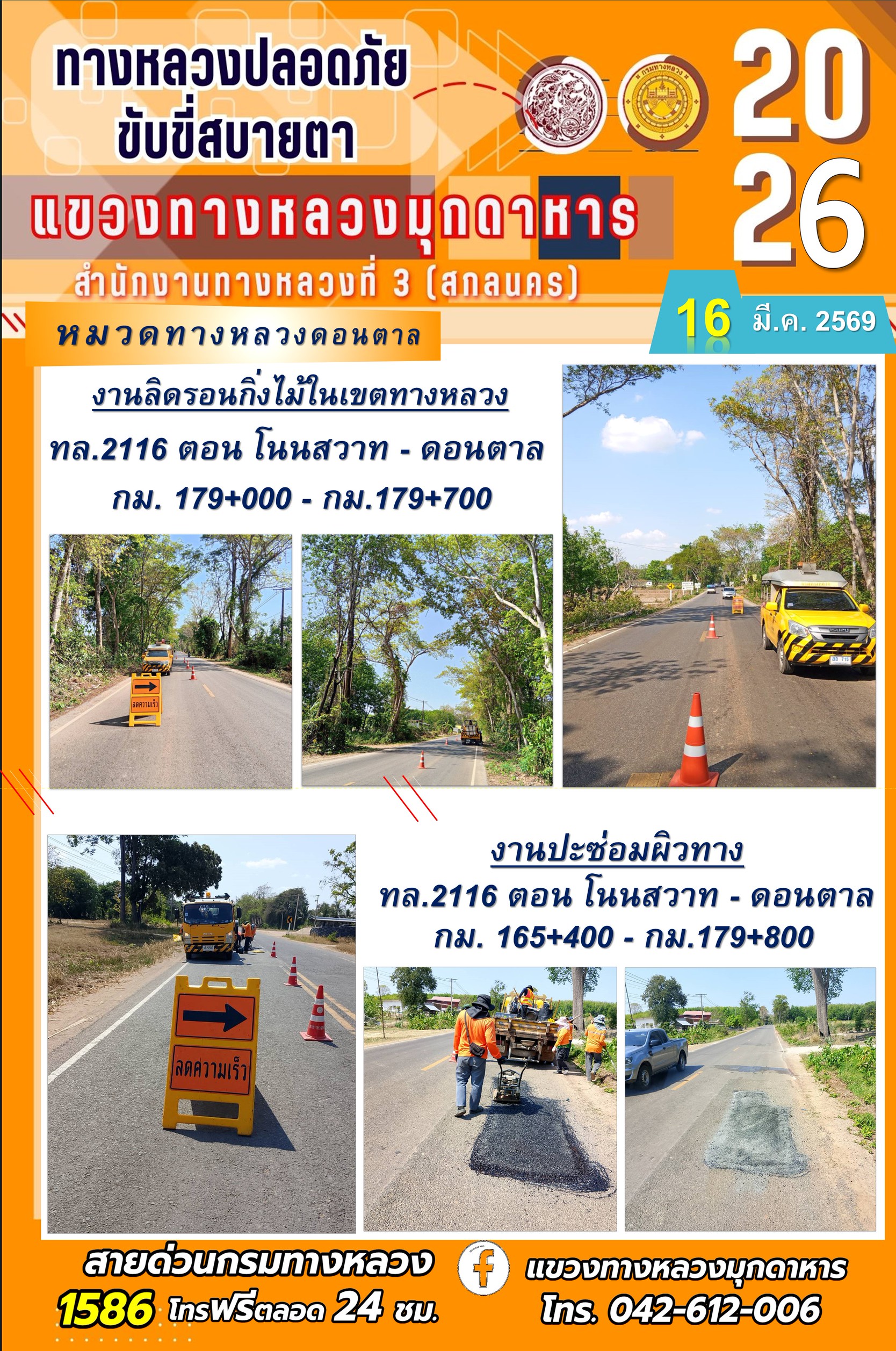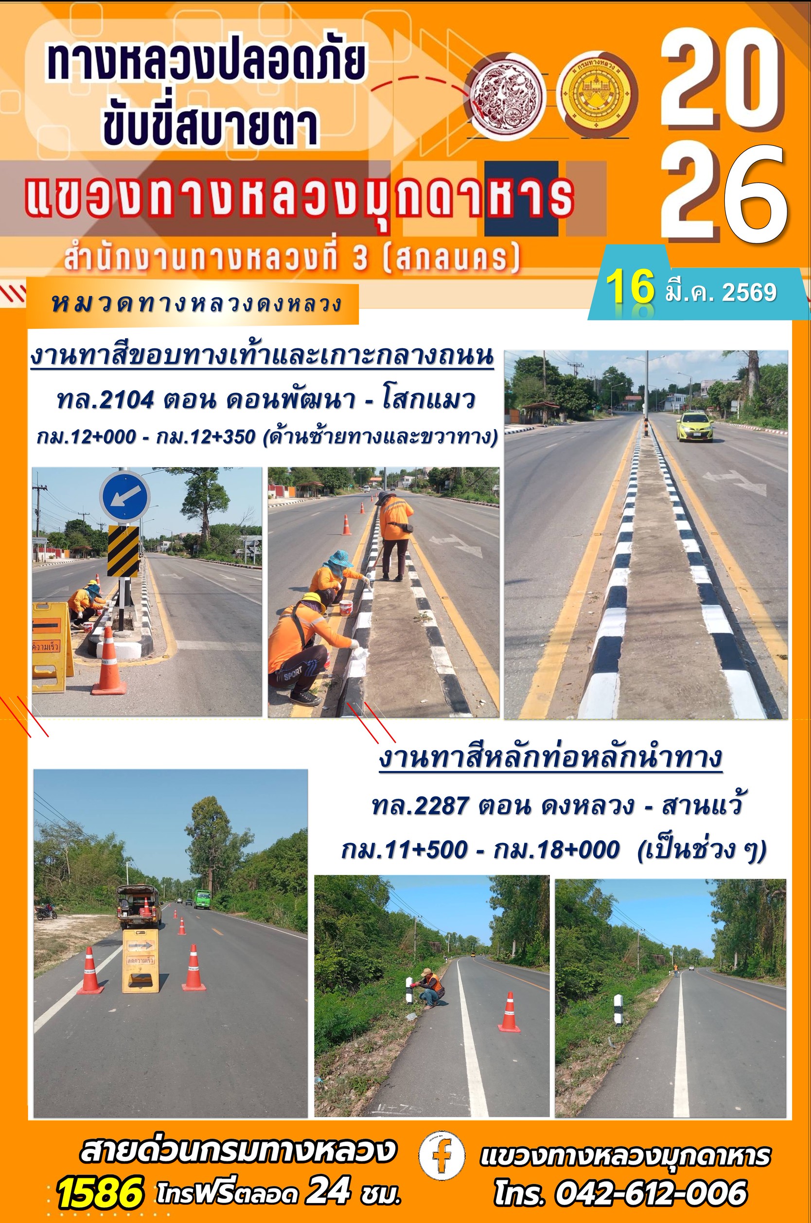 ประจำวันที่ 16 มีนาคม 2569 โครงการทางหลวงปลอดภัย ขับขี่สบายตา หน่วยงานในสังกัดแขวงทางหลวง