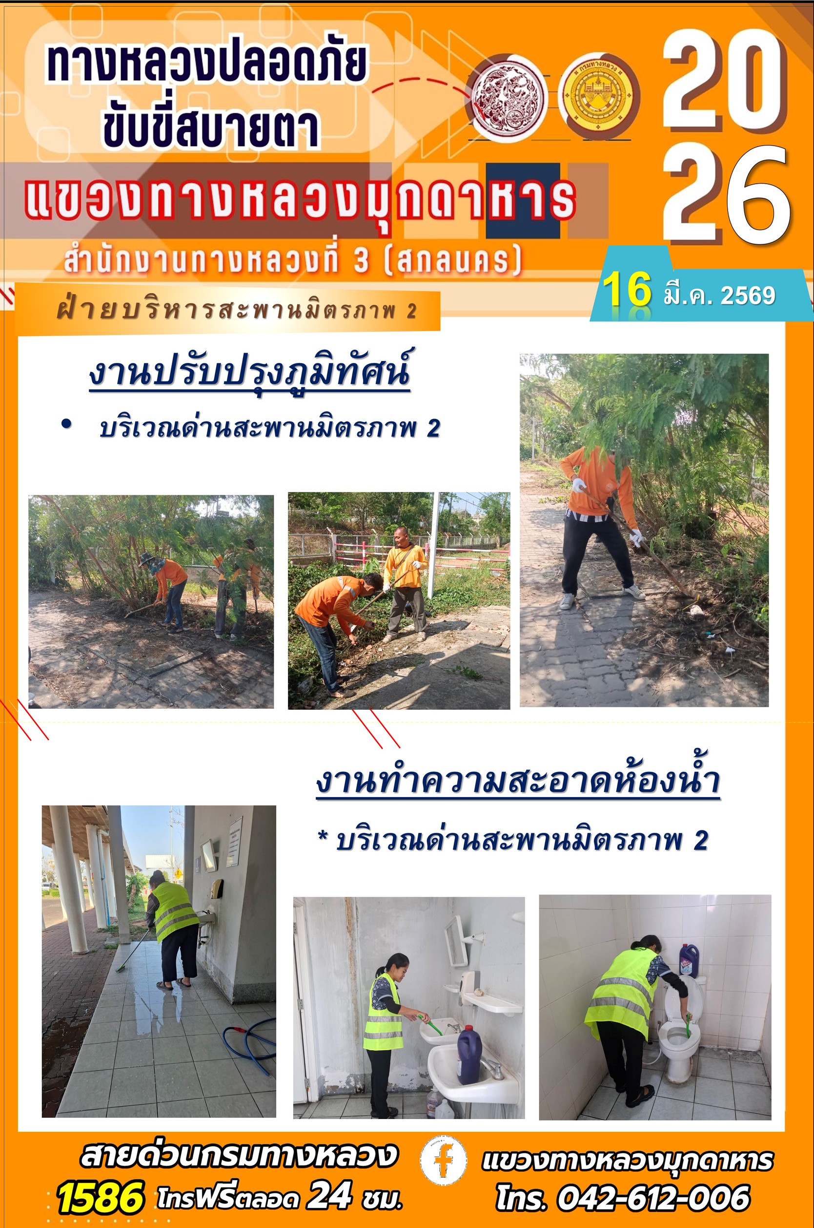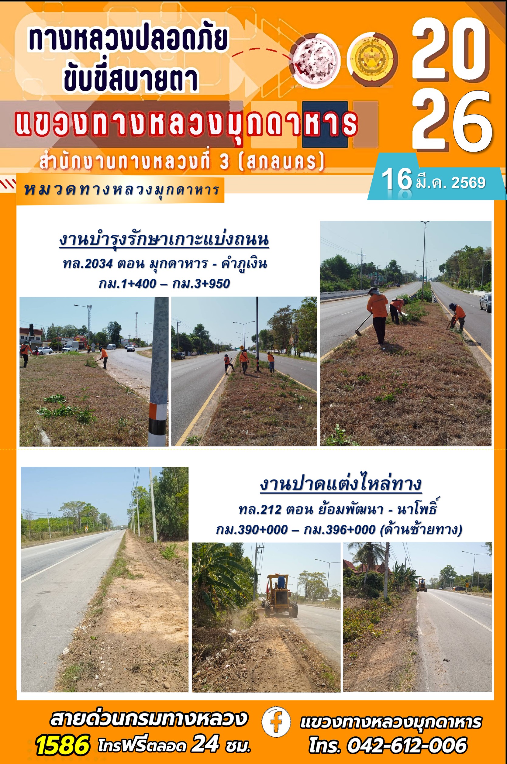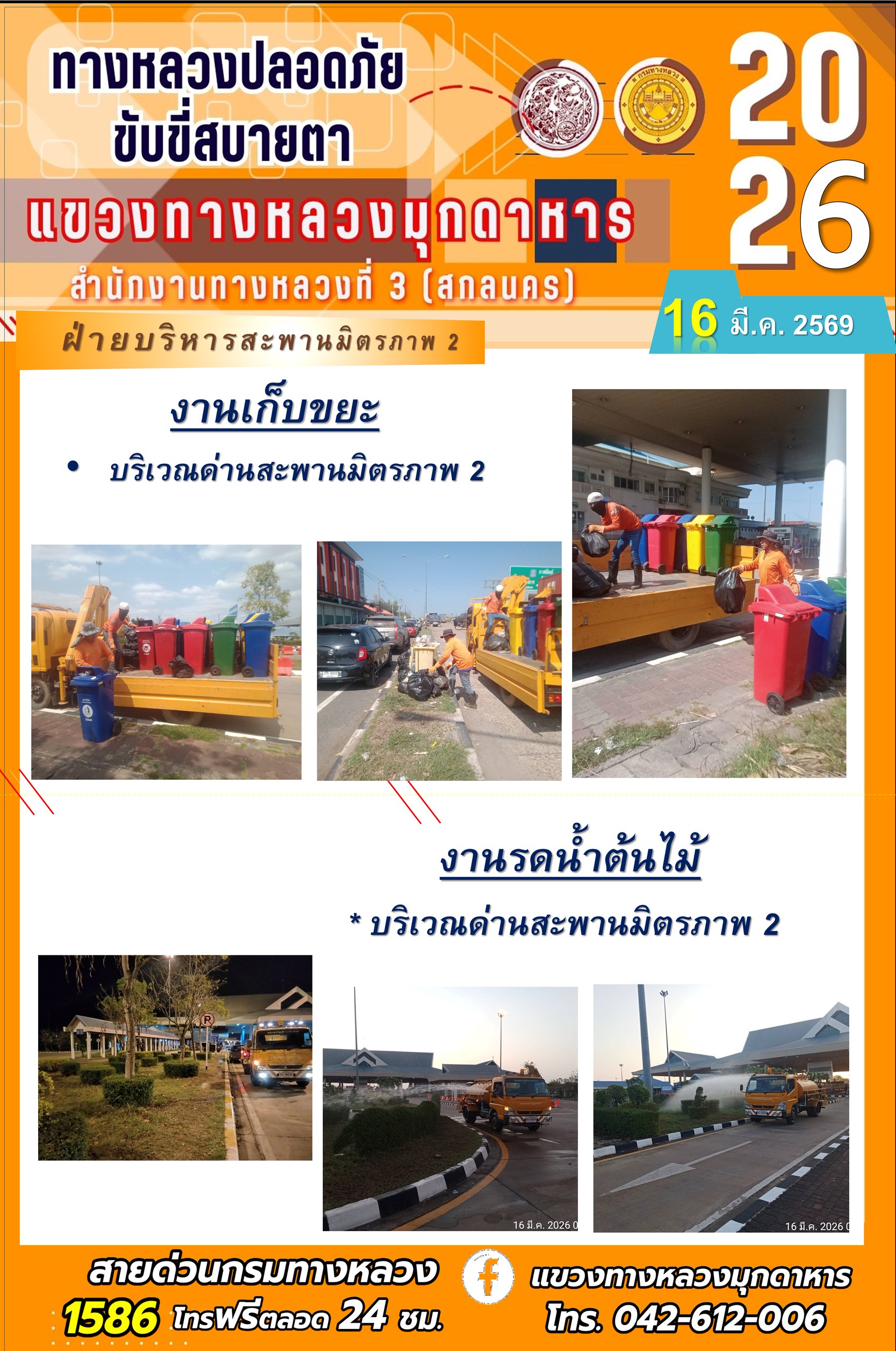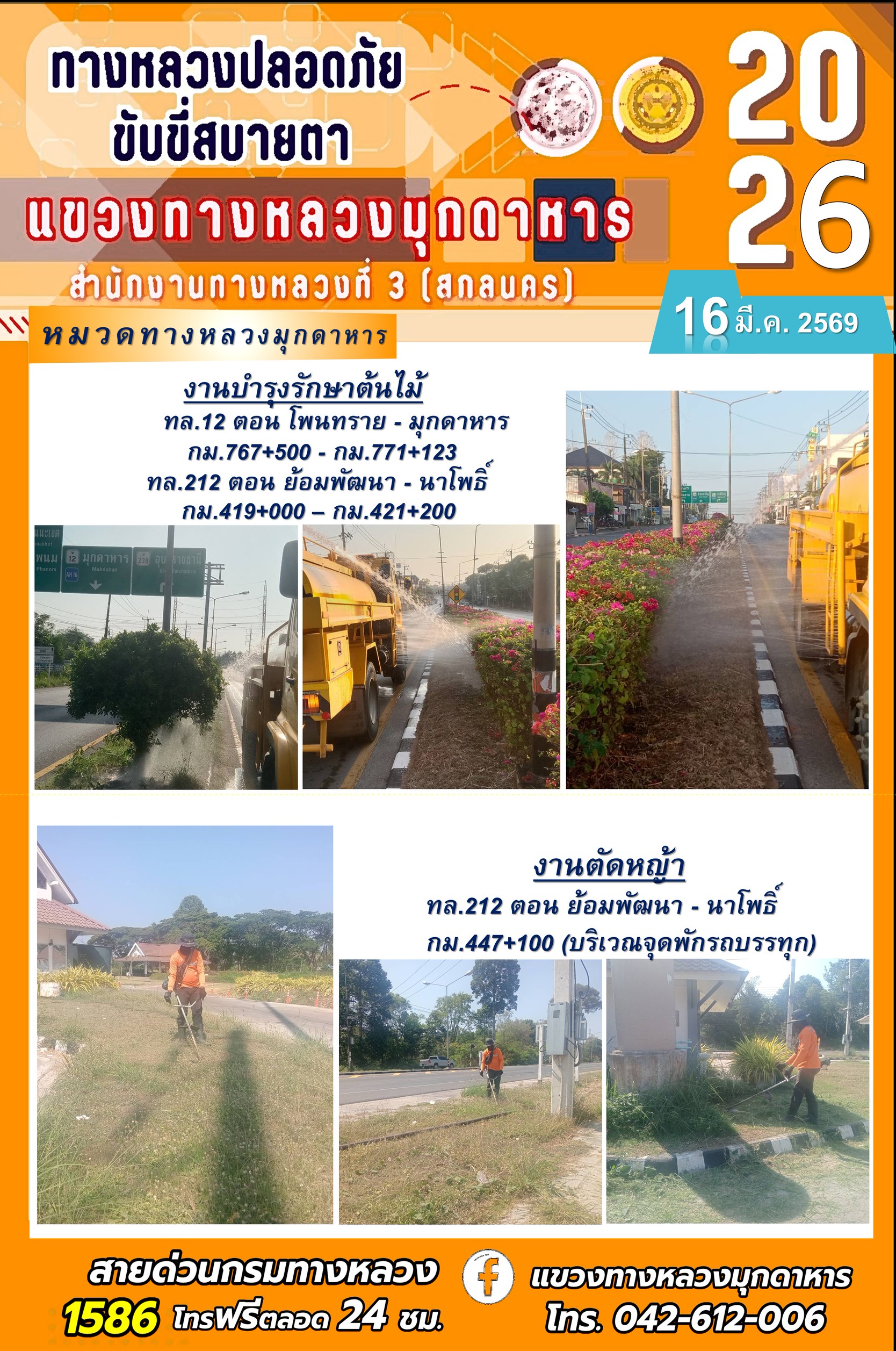 ประจำวันที่ 16 มีนาคม 2569 โครงการทางหลวงปลอดภัย ขับขี่สบายตา หน่วยงานในสังกัดแขวงทางหลวง