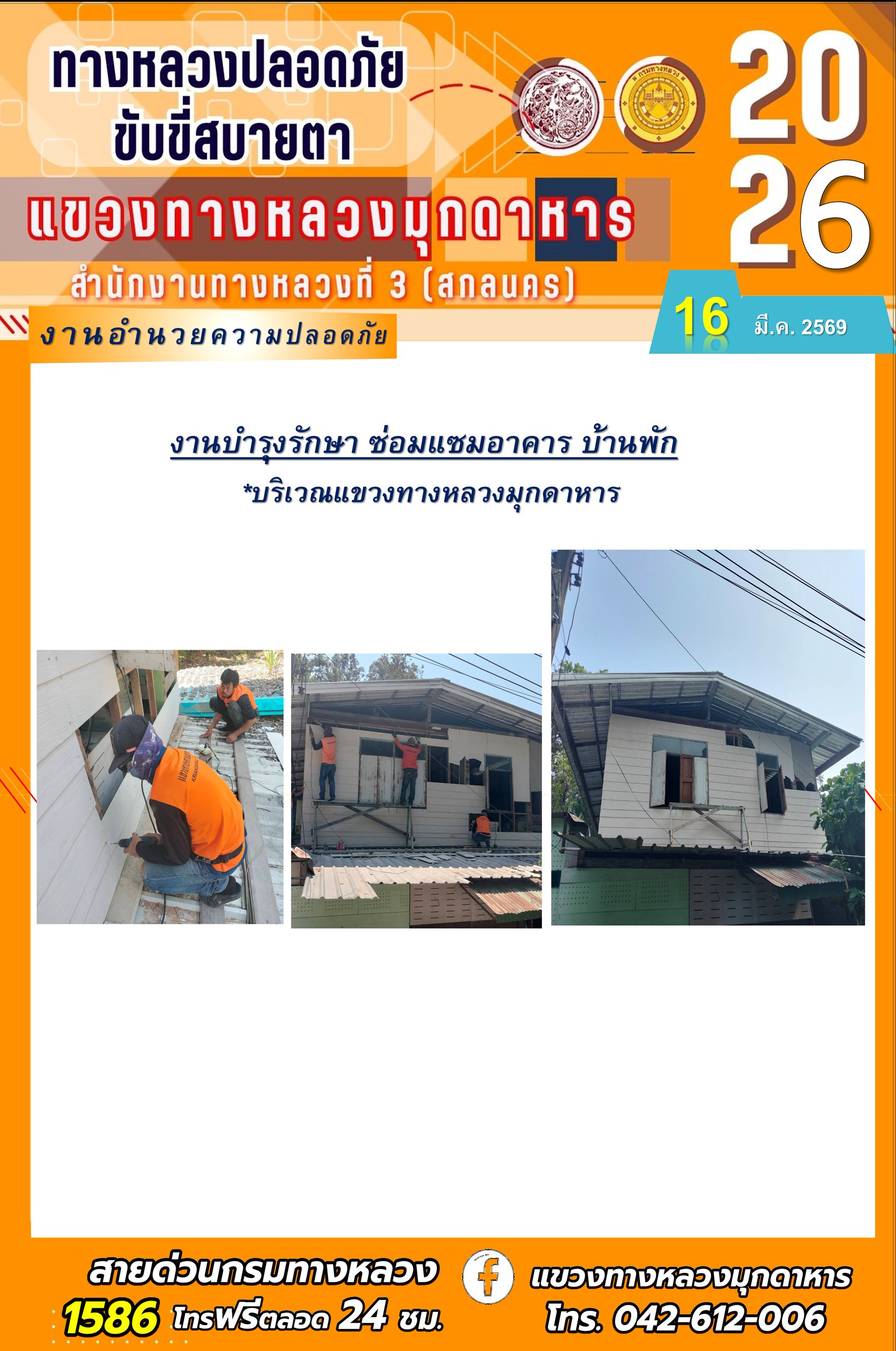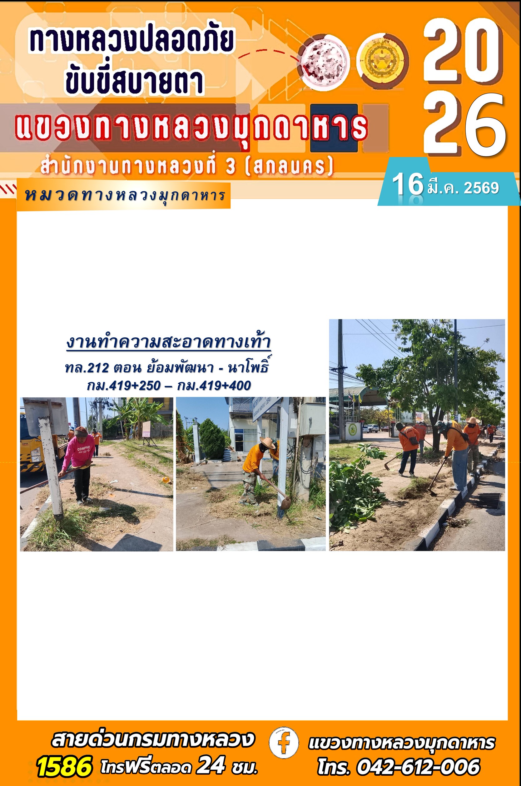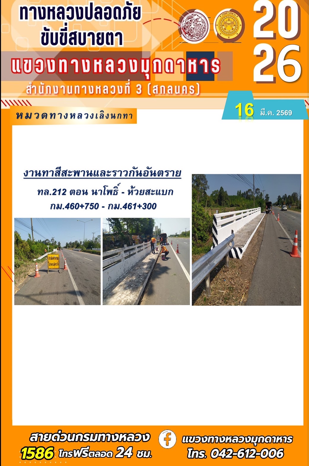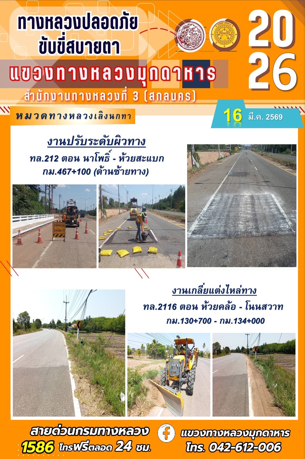 ประจำวันที่ 16 มีนาคม 2569 โครงการทางหลวงปลอดภัย ขับขี่สบายตา หน่วยงานในสังกัดแขวงทางหลวง