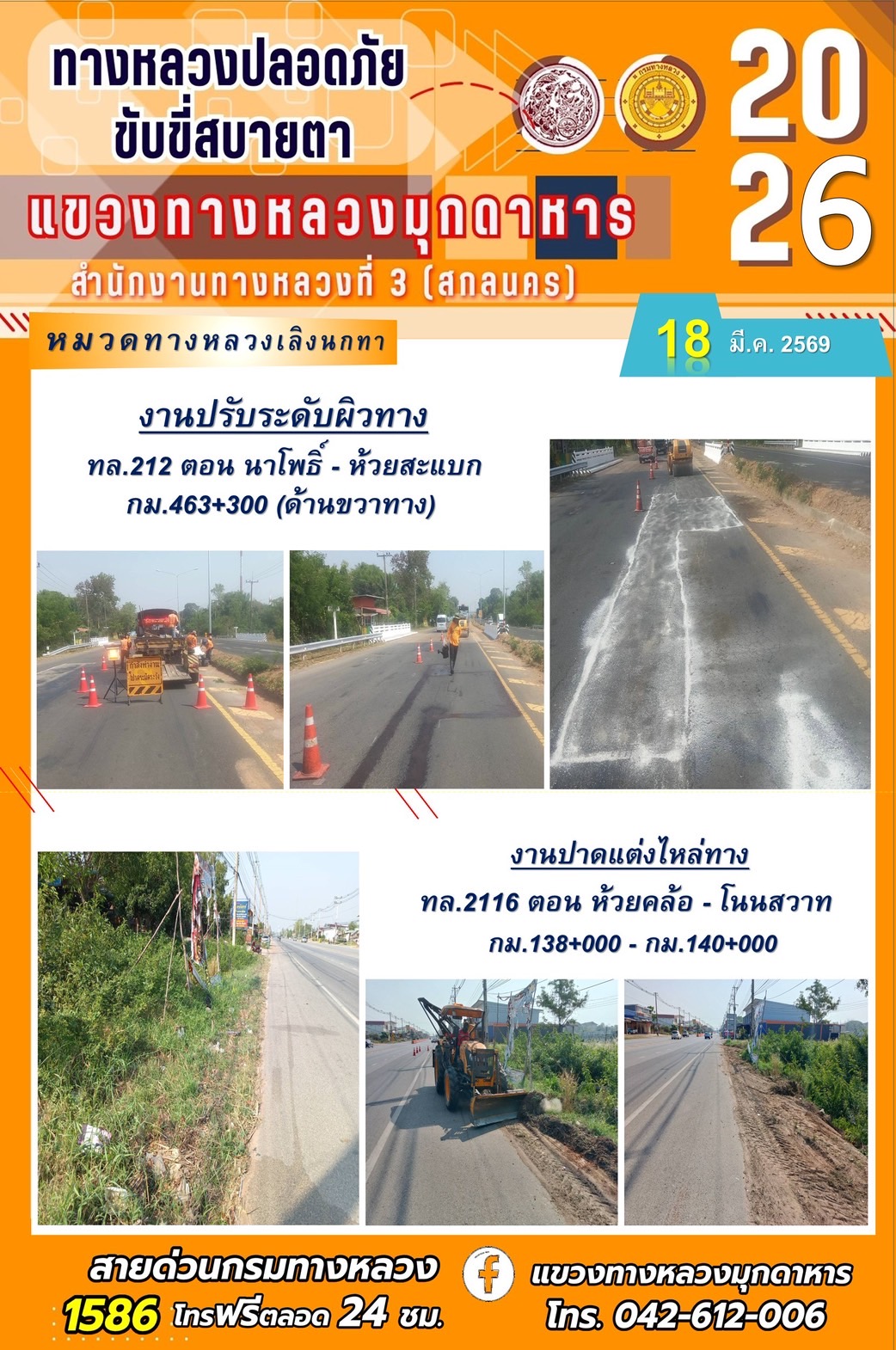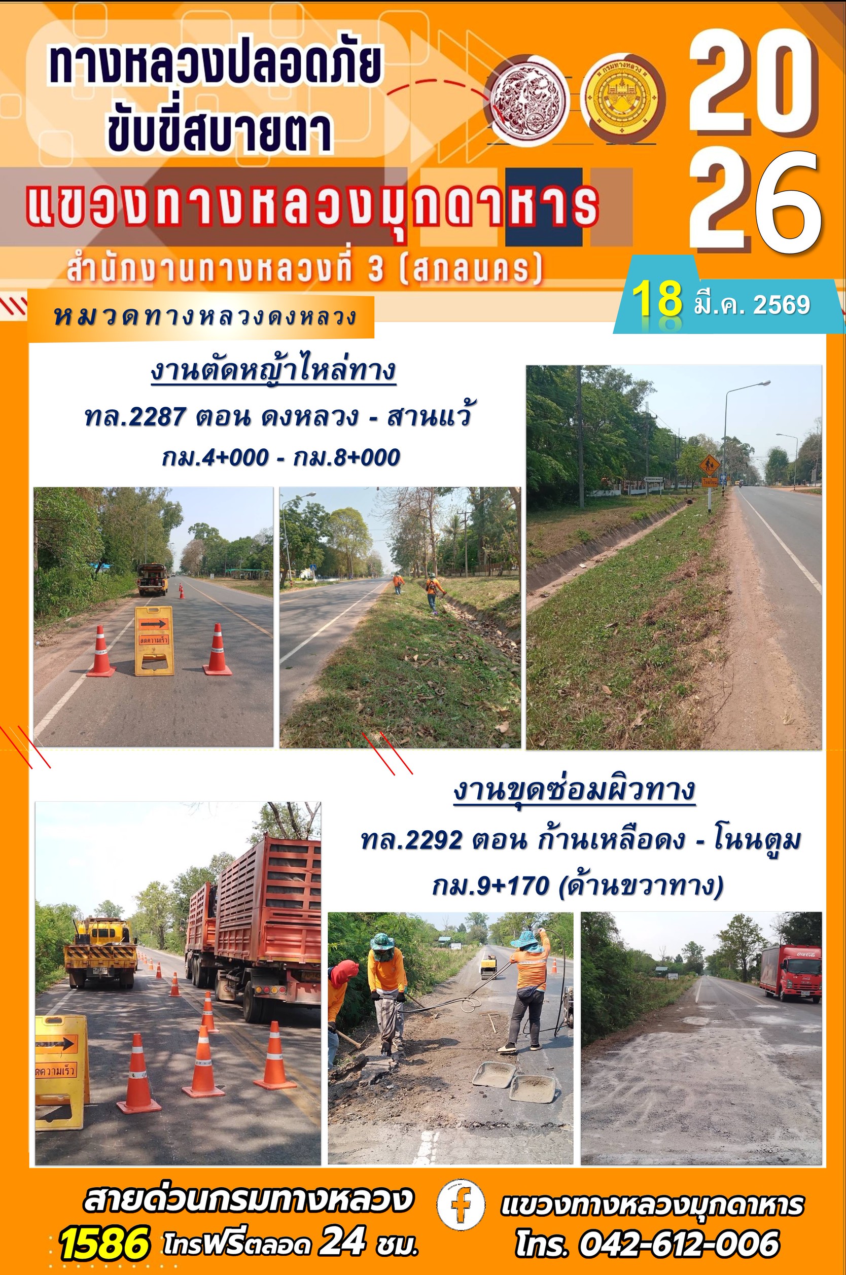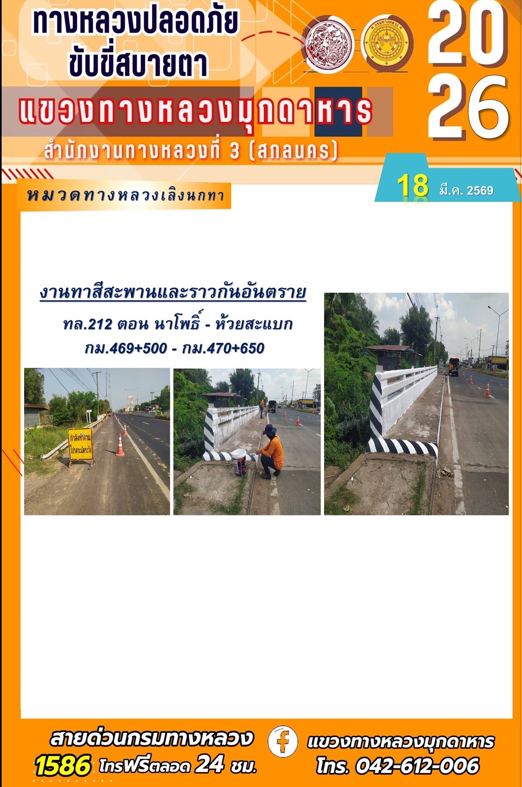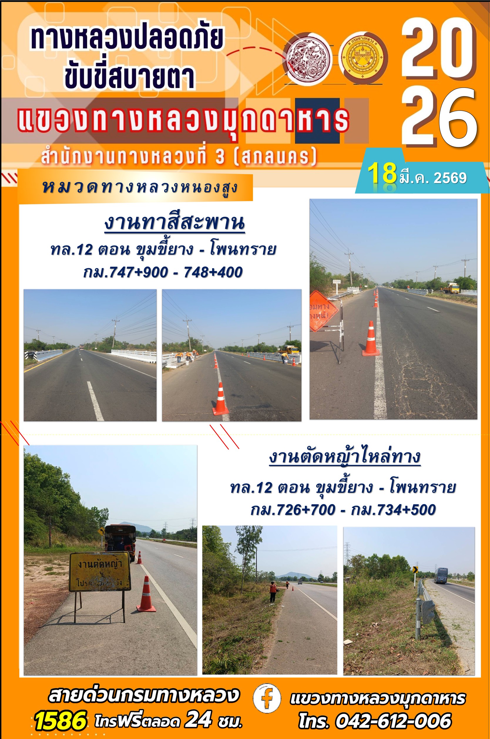 ประจำวันที่ 18 มีนาคม 2569 โครงการทางหลวงปลอดภัย ขับขี่สบายตา หน่วยงานในสังกัดแขวงทางหลวง