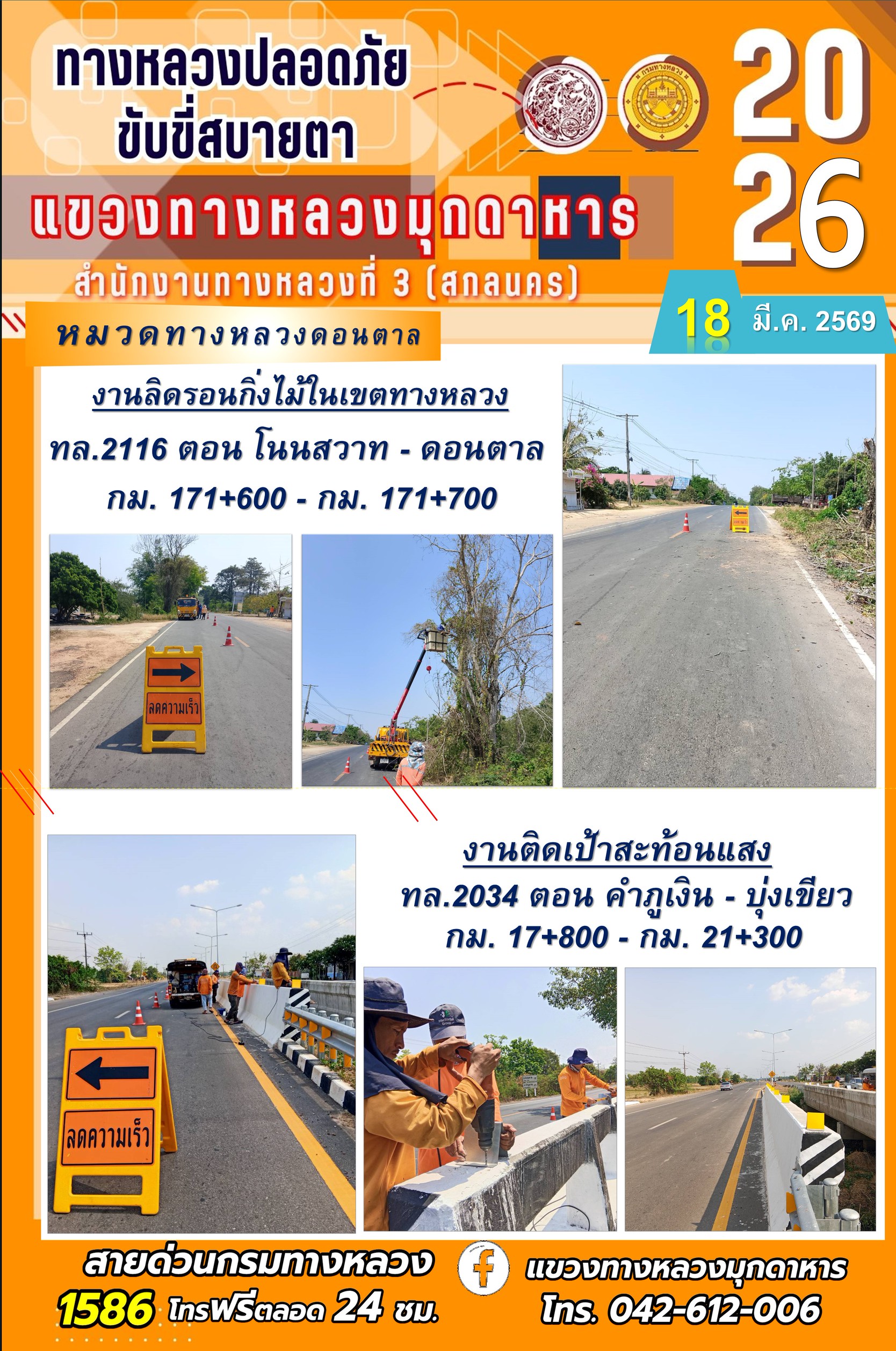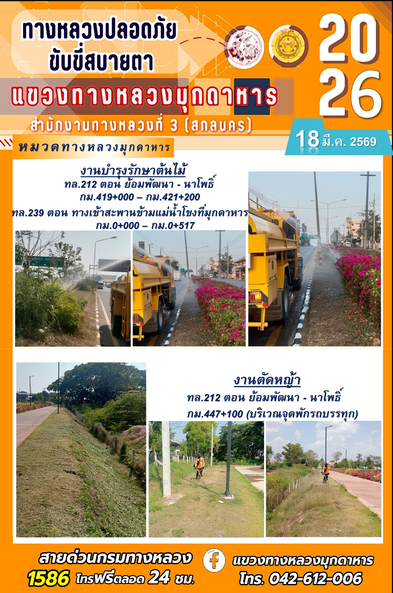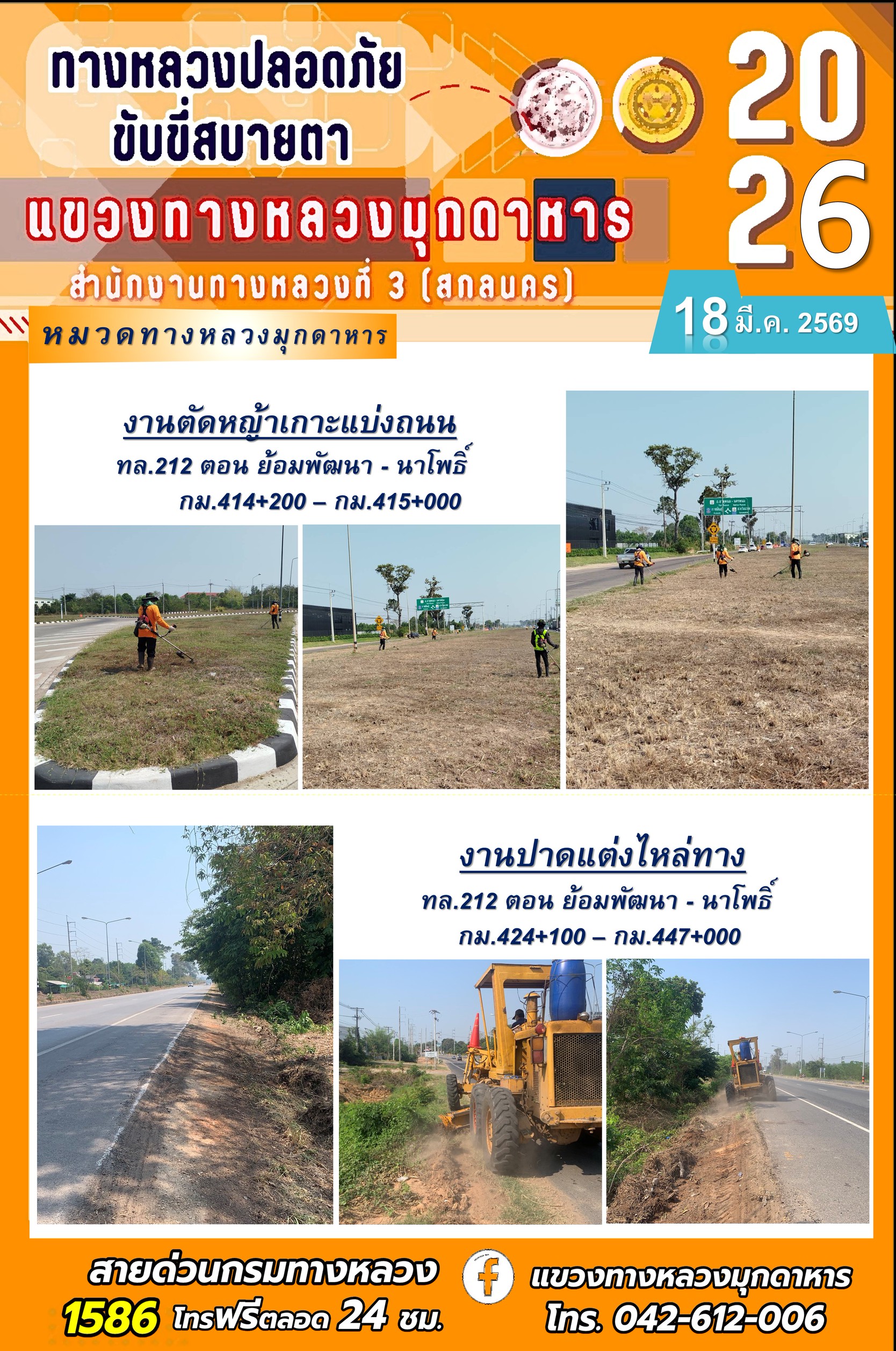 ประจำวันที่ 18 มีนาคม 2569 โครงการทางหลวงปลอดภัย ขับขี่สบายตา หน่วยงานในสังกัดแขวงทางหลวง