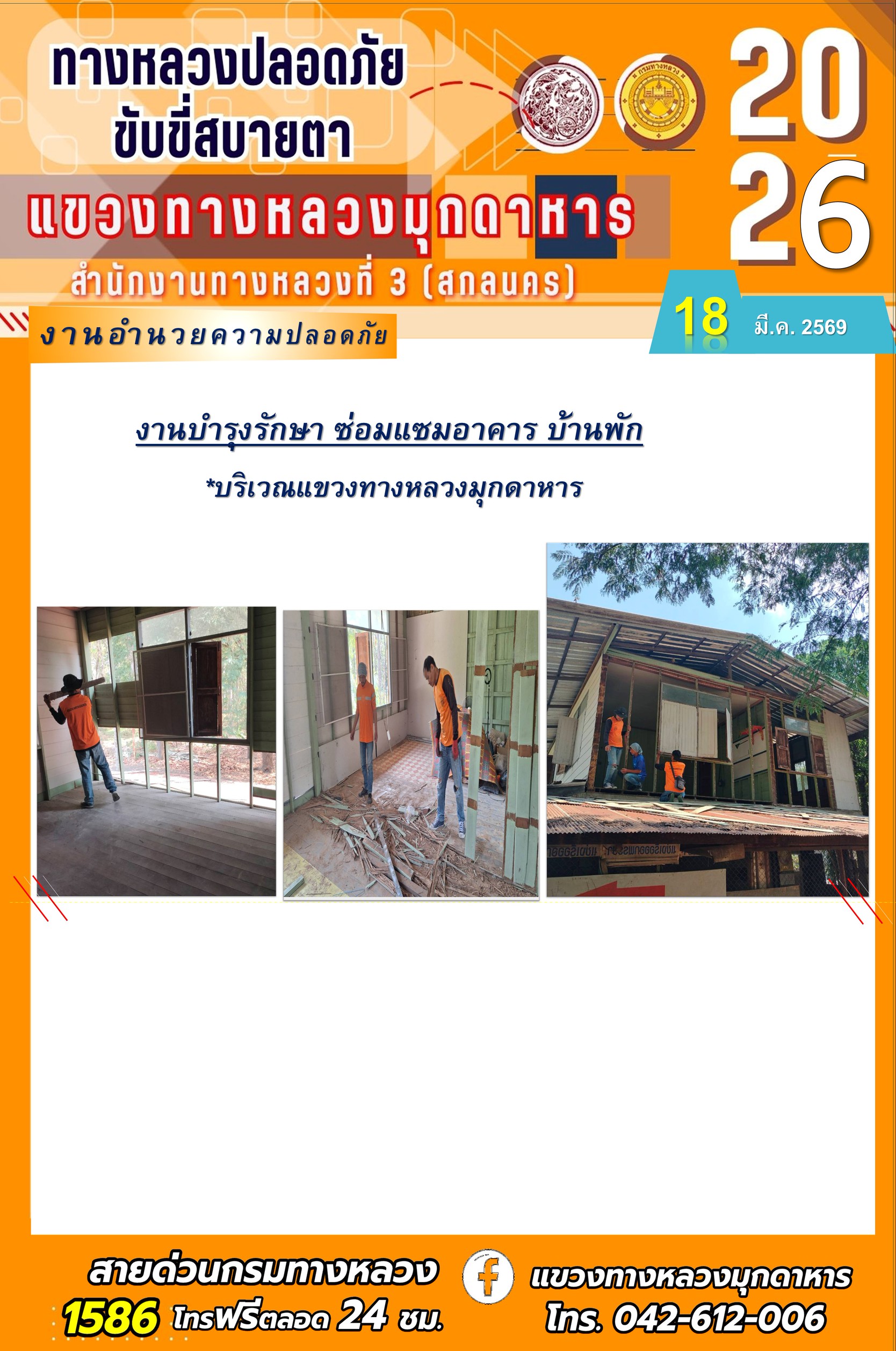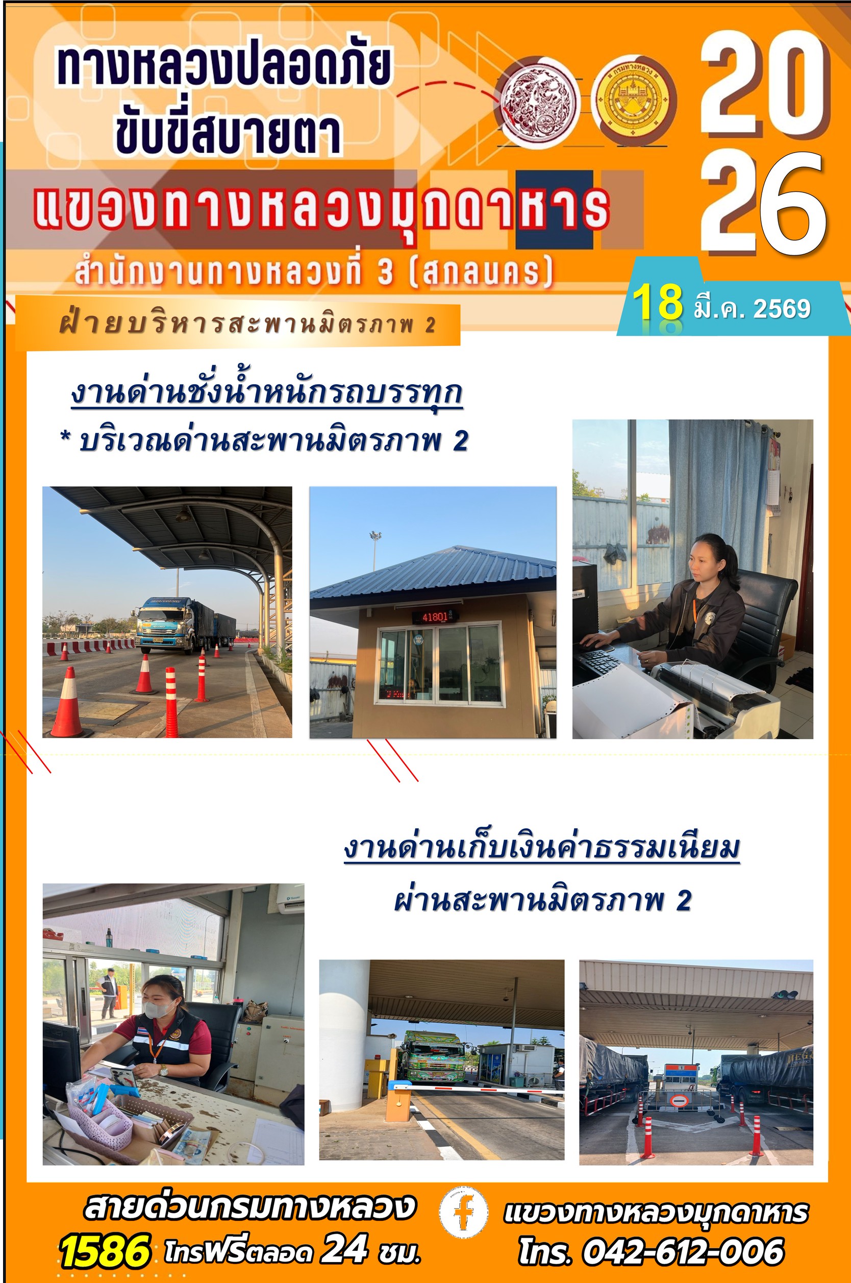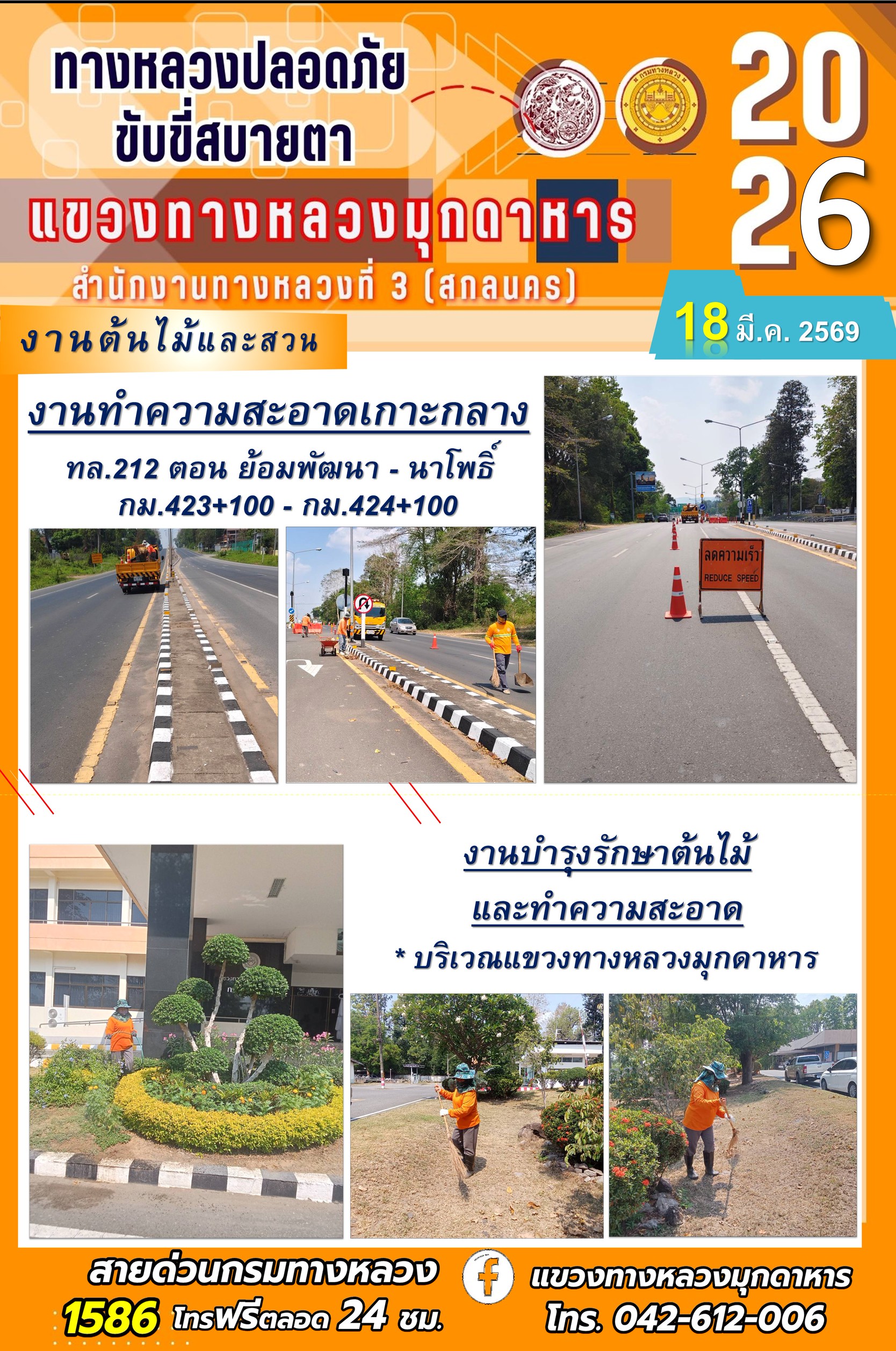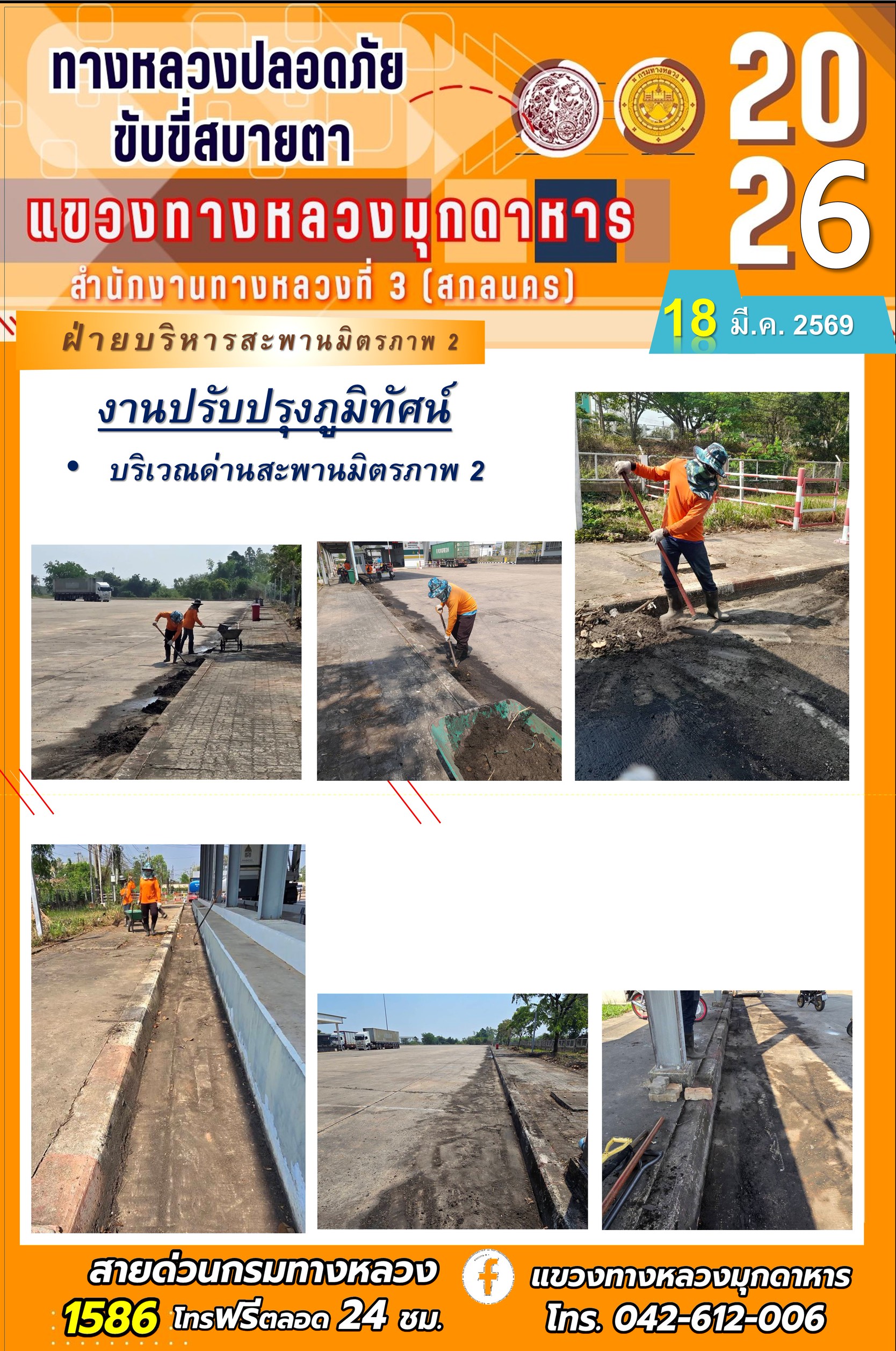 ประจำวันที่ 18 มีนาคม 2569 โครงการทางหลวงปลอดภัย ขับขี่สบายตา หน่วยงานในสังกัดแขวงทางหลวง