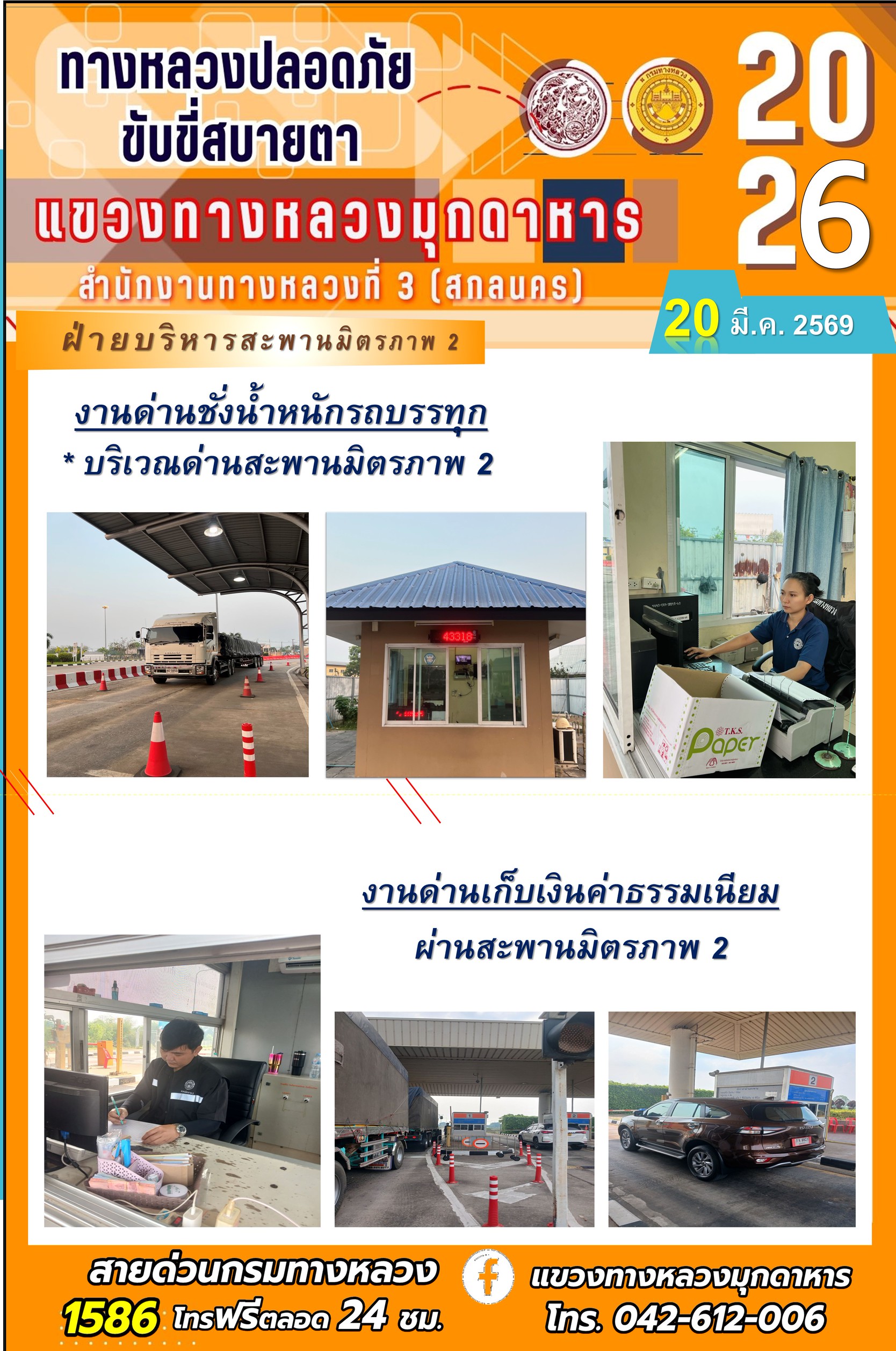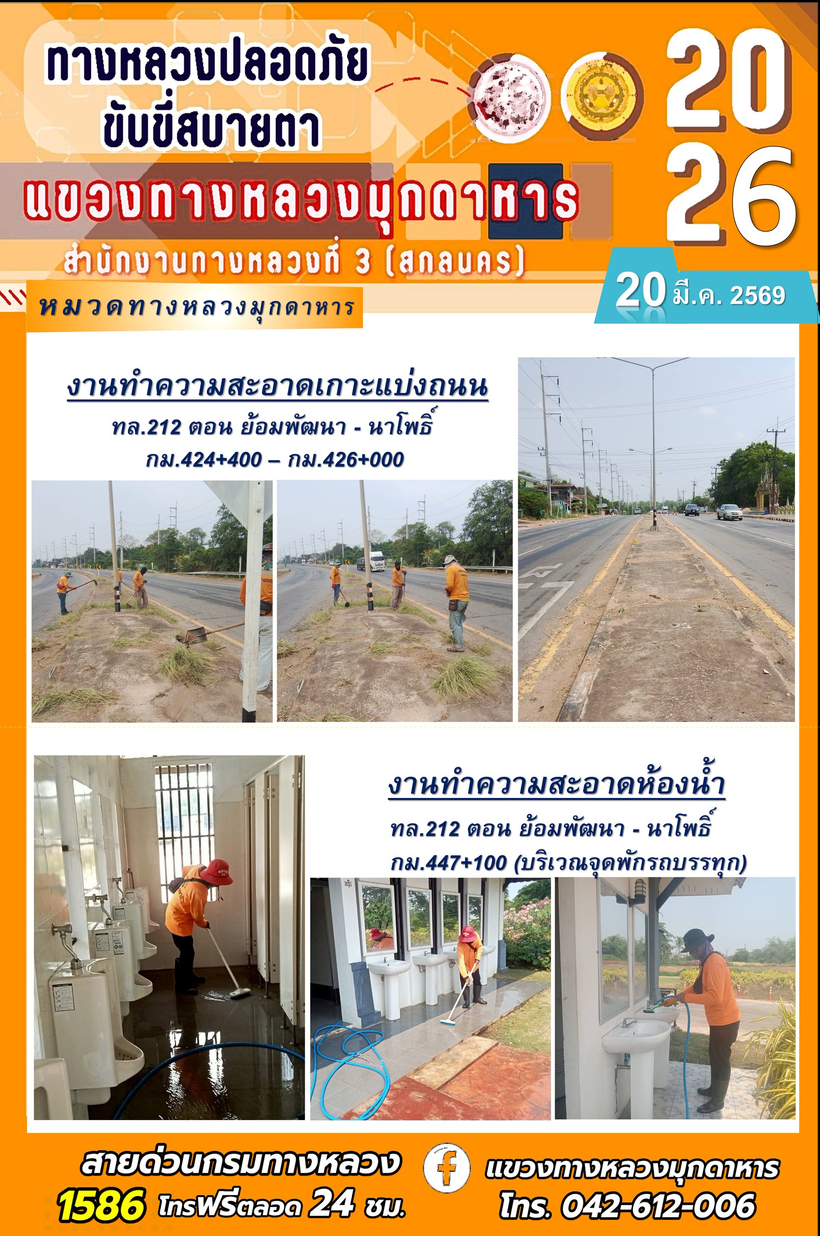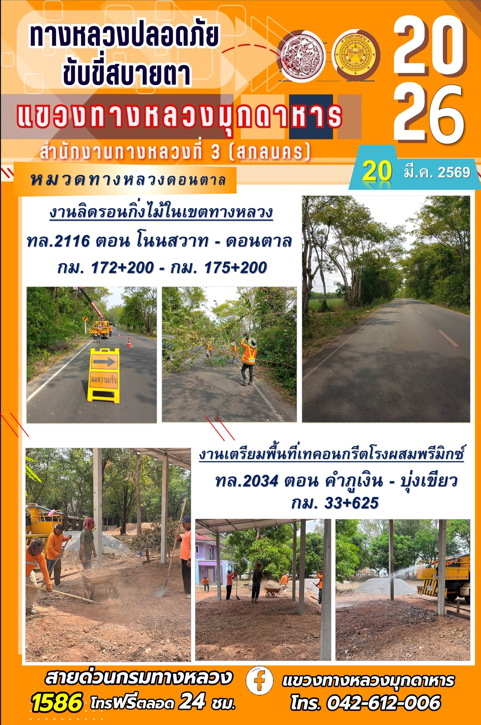ข้อมูลภาพกิจกรรม : ประจำวันที่ 20 มีนาคม 2569 โครงการทางหลวงปลอดภัย ขับขี่สบายตา หน่วยงานในสังกัดแขวงทางหลวง