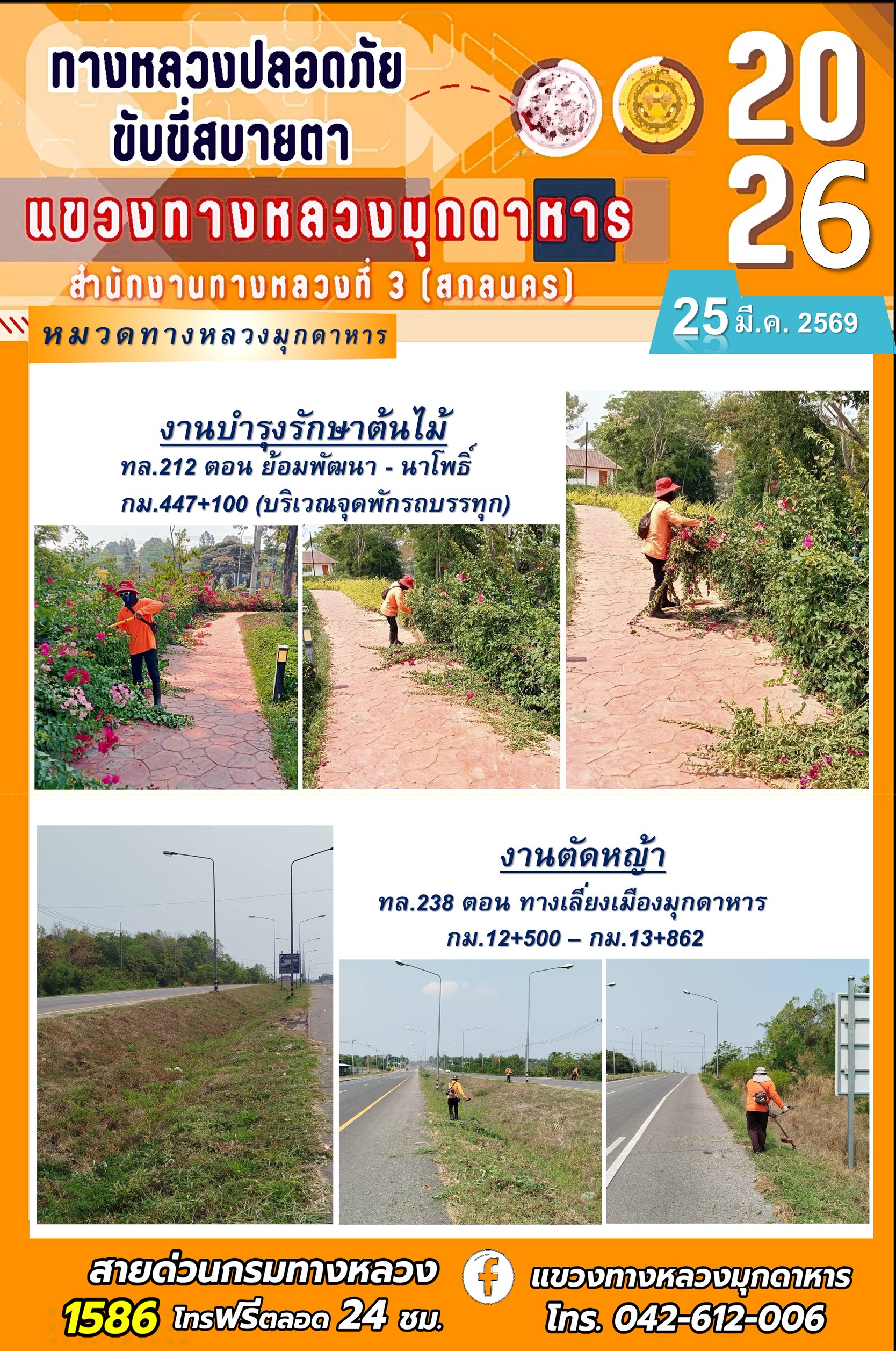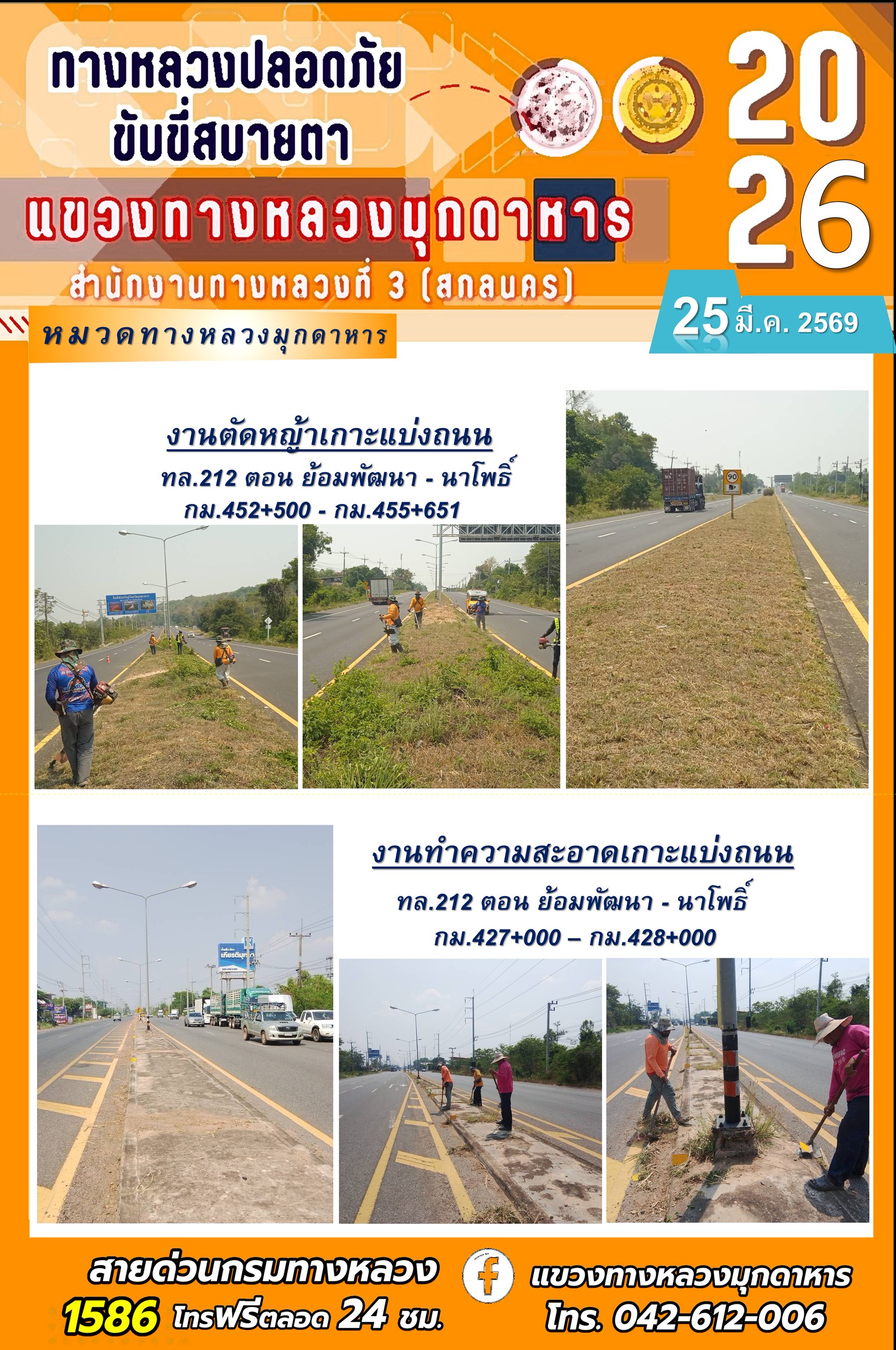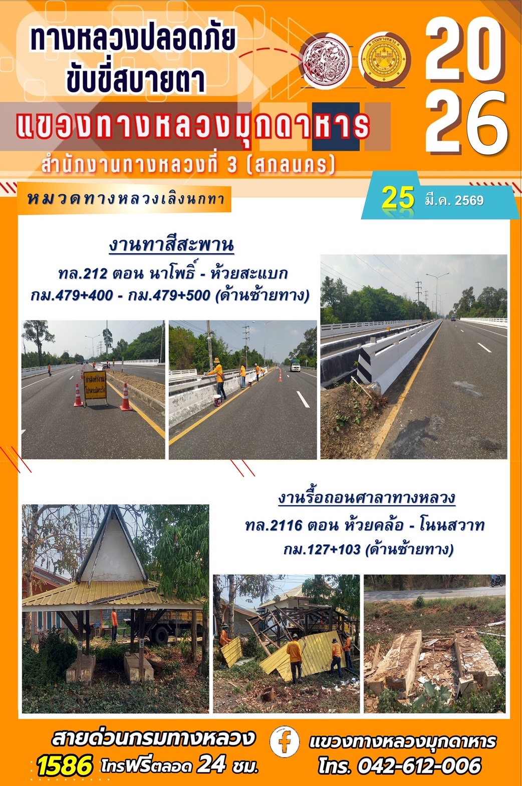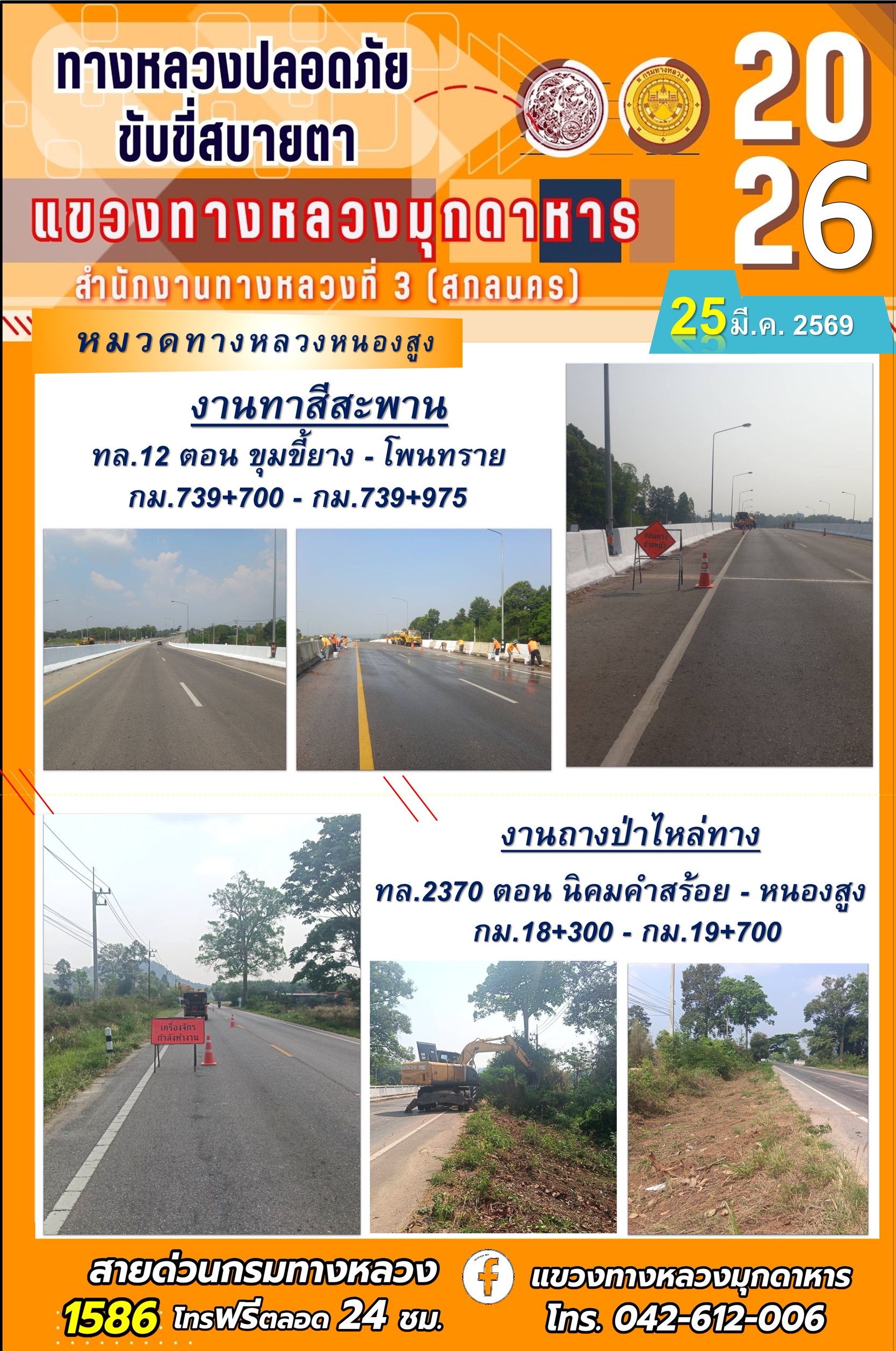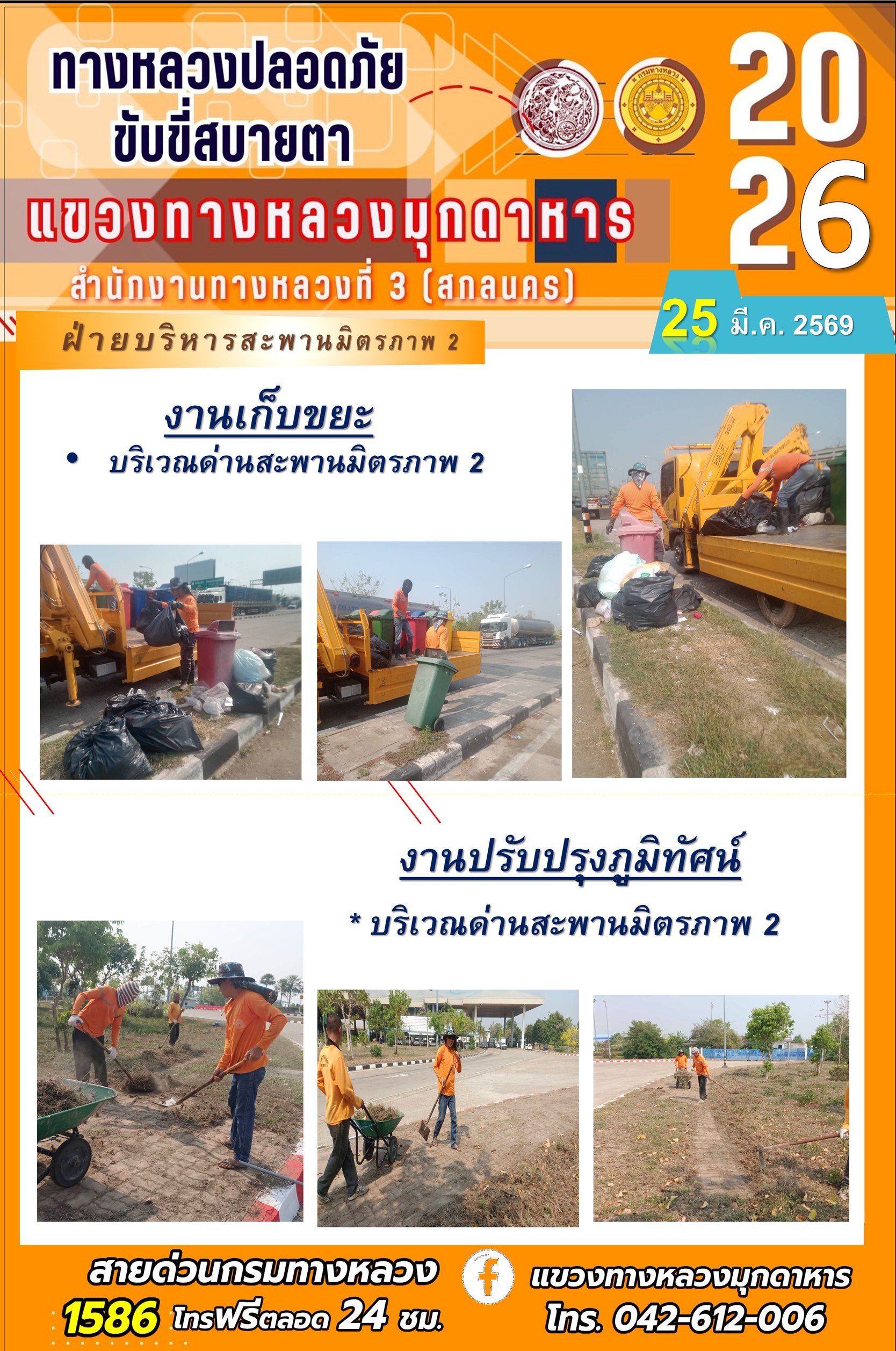 ข้อมูลภาพกิจกรรม : ประจำวันที่ 25 มีนาคม 2569 โครงการทางหลวงปลอดภัย ขับขี่สบายตา หน่วยงานในสังกัดแขวงทางหลวง
