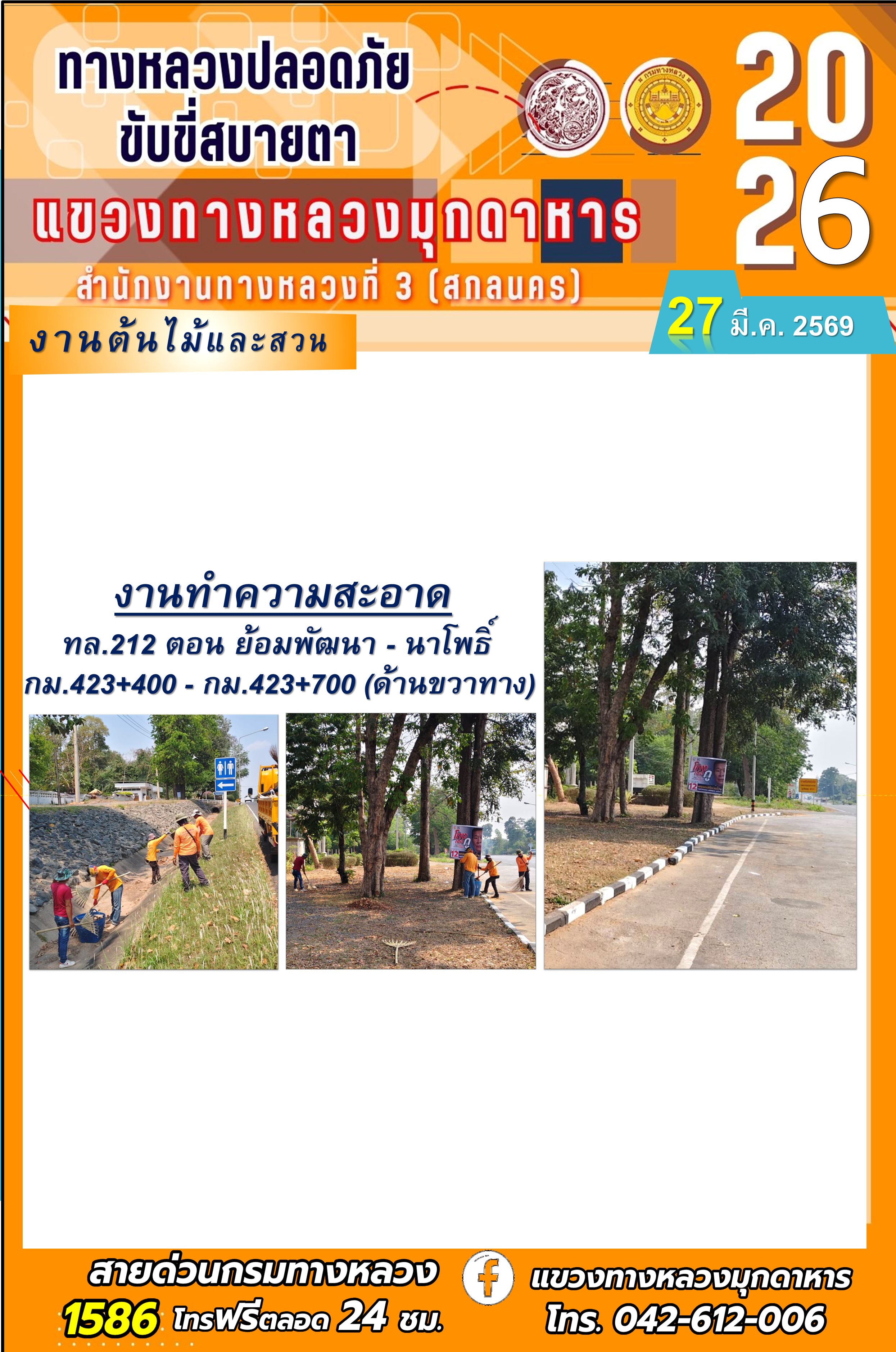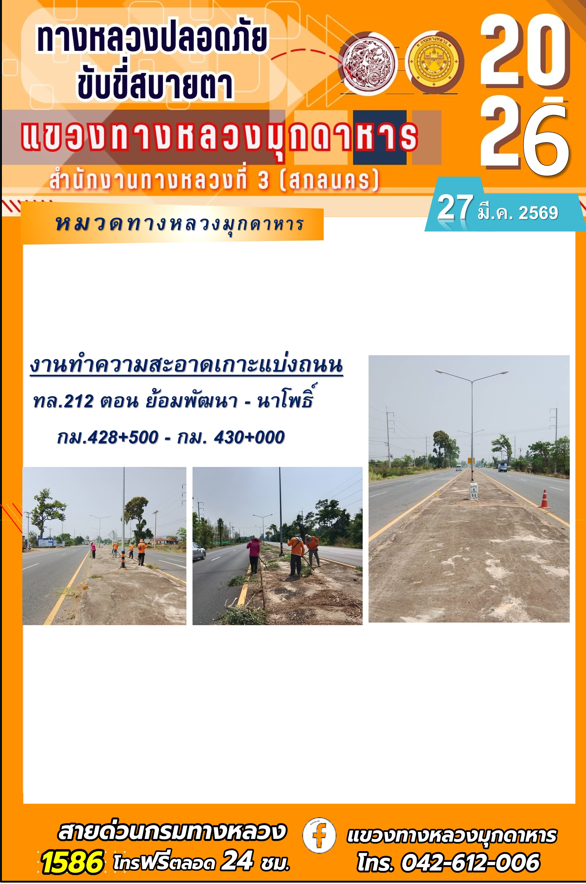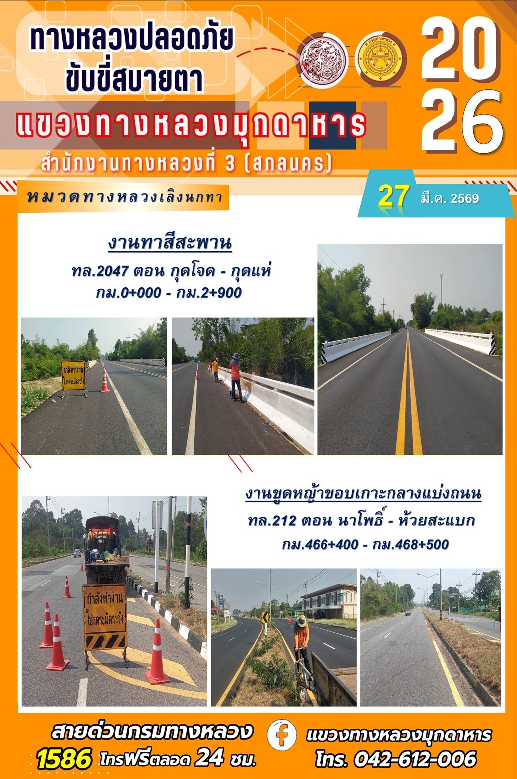 ประจำวันที่ 27 มีนาคม 2569 โครงการทางหลวงปลอดภัย ขับขี่สบายตา หน่วยงานในสังกัดแขวงทางหลวง