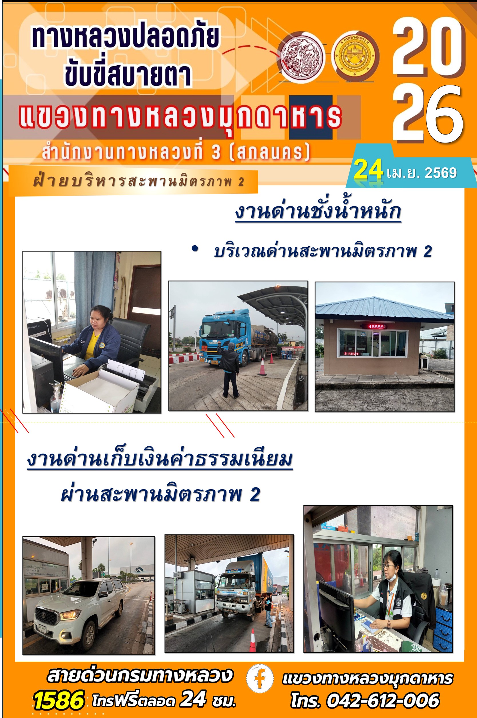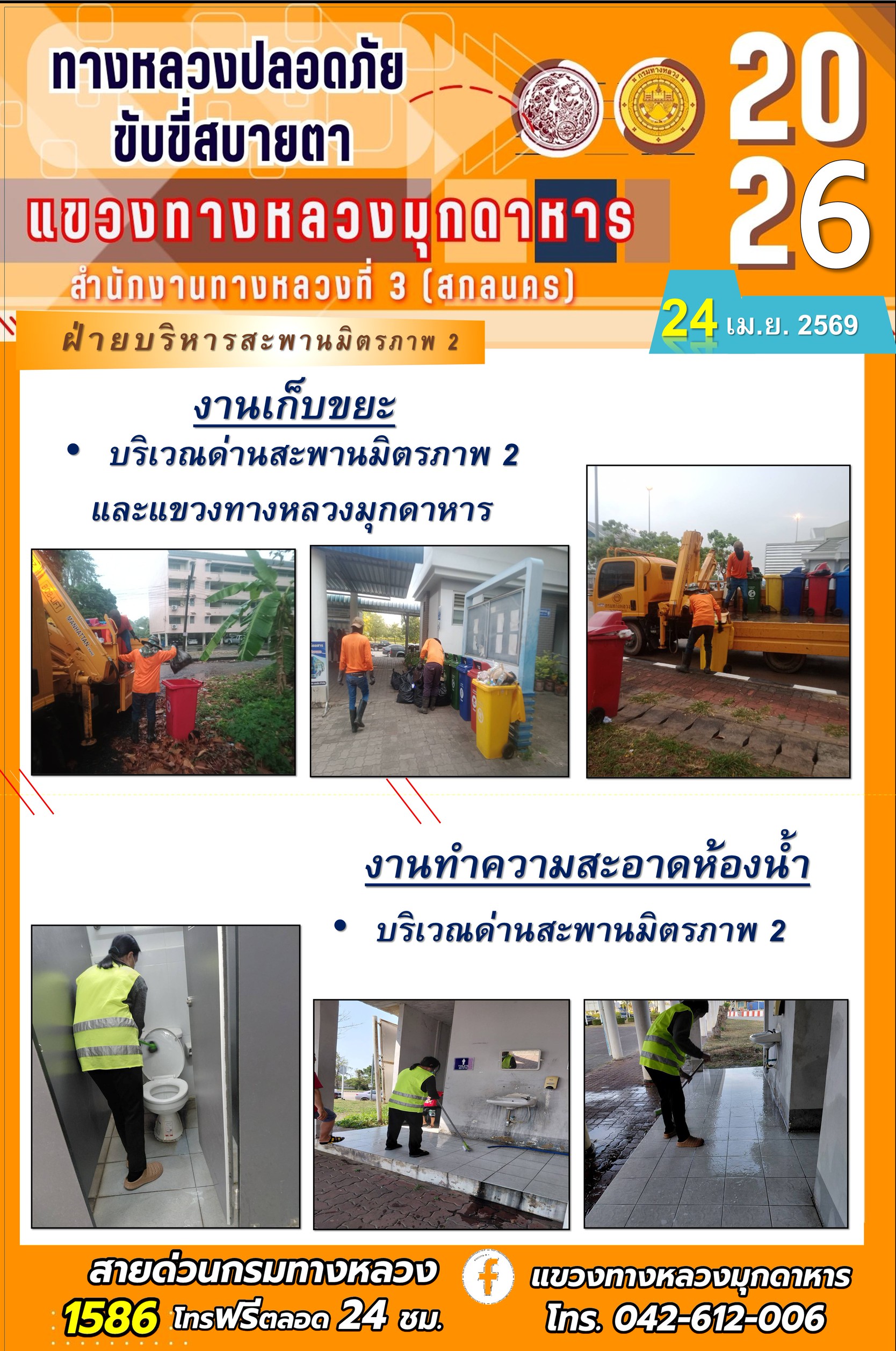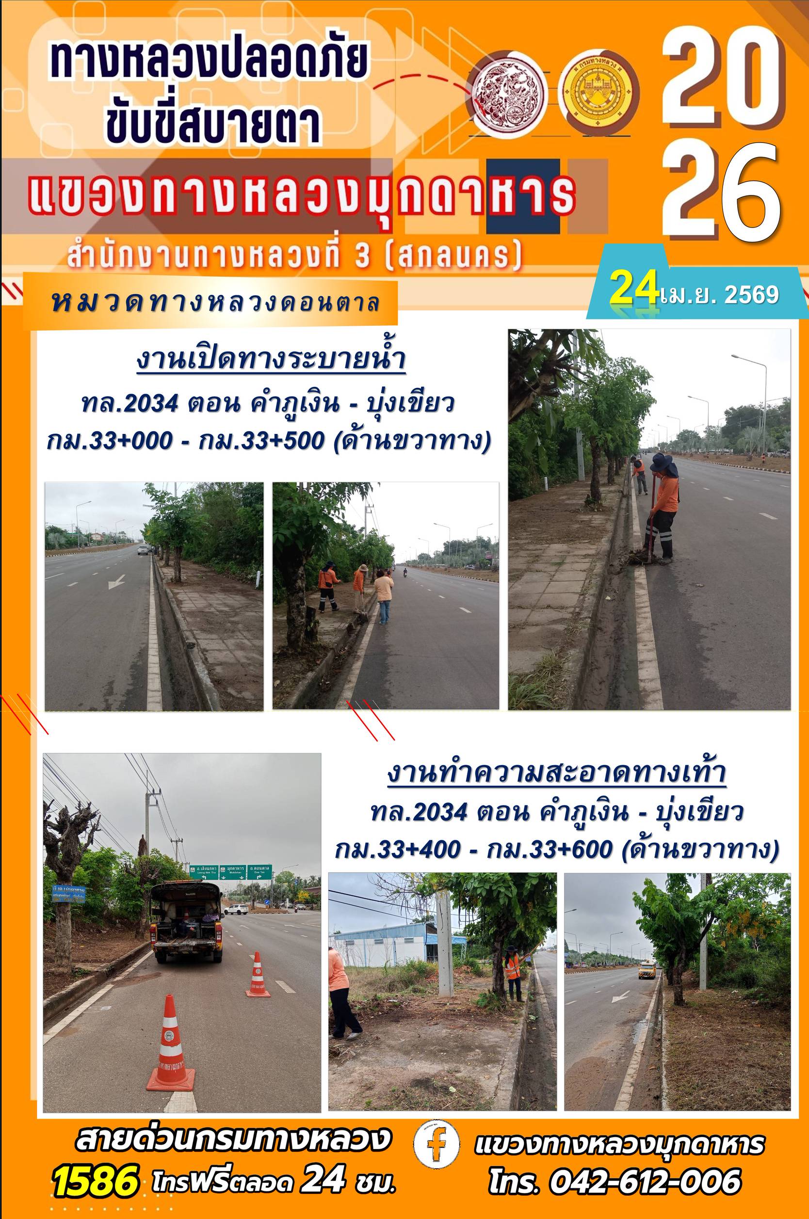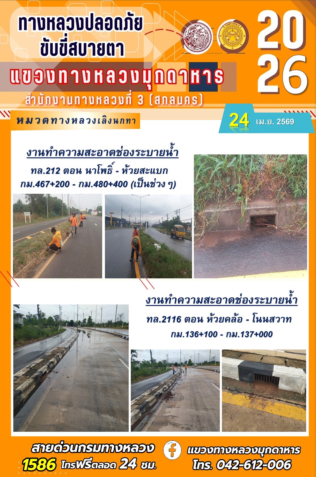 ประจำวันที่ 24 เมษายน 2569 โครงการทางหลวงปลอดภัย ขับขี่สบายตา หน่วยงานในสังกัดแขวงทางหลวง