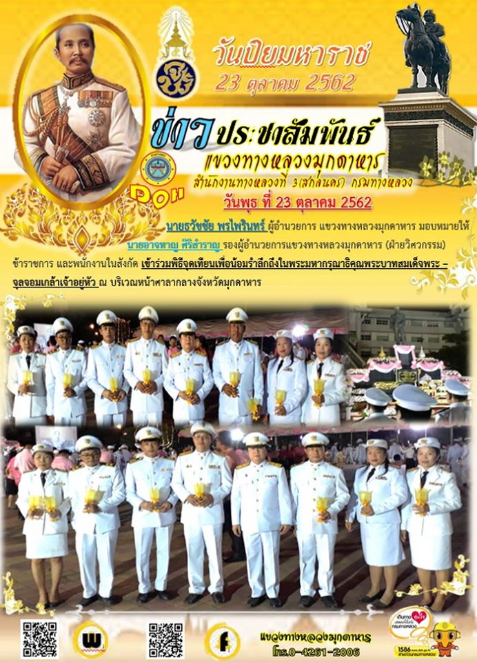 วันพุธ ที่23 ตุลาคม 2562 นายธวัชชัย พรไพรินทร์ ผู้อำนวยการแขวงทางหลวงมุกดาหาร มอบหมายให้ นายอาจหาญ ศิริสำราญ รองผู้อำนวยการแขวงทางหลวงมุกดาหาร (ฝ่ายวิศวกรรม) ข้าราชการ และพนักงานในสังกัด เข้าร่วมพิธีจุดเทียนเพื่อน้อมรำลึกในพระมหากรุณาธิคุณพระบาทสมเด็จพระจุลจอมเกล้าเจ้าอยู่หัว ณ บริเวณหน้าศาลากลางจังหวัดมุกดาหาร