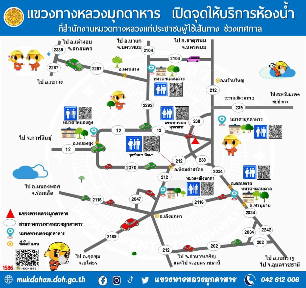 ***แขวงทางหลวงมุกดาหาร จึงเตรียมความพร้อมอำนวยความสะดวกปลอดภัยให้กับประชาชน จัดตั้งจุดให้บริการทั่วไทย และจุดบริการห้องน้ำสะอาด ระหว่าง วันที่ 11 - 17 เมษายน 2567 จำนวน 6 จุดบริการทั่วไทย และ 7 จุดห้องน้ำสะอาด