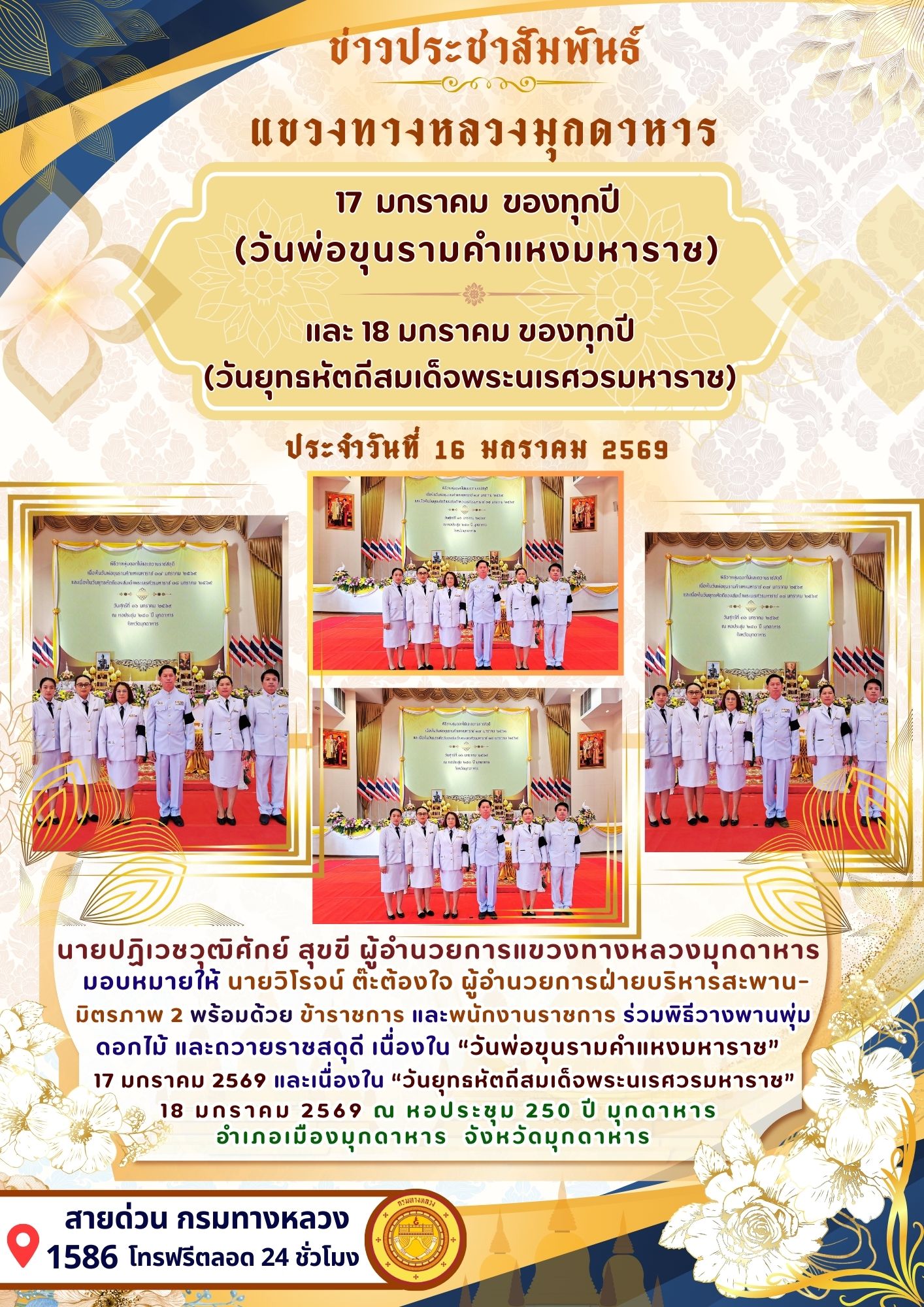 นายปฏิเวชวุฒิศักย์ สุขขี ผู้อำนวยการแขวงทางหลวงมุกดาหาร มอบหมายให้ นายวิโรจน์ ต๊ะต้องใจ ผู้อำนวยการฝ่ายบริหารสะพานมิตรภาพ 2 พร้อมด้วย ข้าราชการ และพนักงานราชการ ร่วมพิธีวางพานพุ่มดอกไม้ และถวายราชสดุดี เนื่องใน “วันพ่อขุนรามคำแหงมหาราช” 17 มกราคม 2569 และเนื่องใน “วันยุทธหัตถีสมเด็จพระนเรศวรมหาราช” 18 มกราคม 2569 ณ หอประชุม 250 ปี มุกดาหาร อำเภอเมืองมุกดาหาร จังหวัดมุกดาหาร