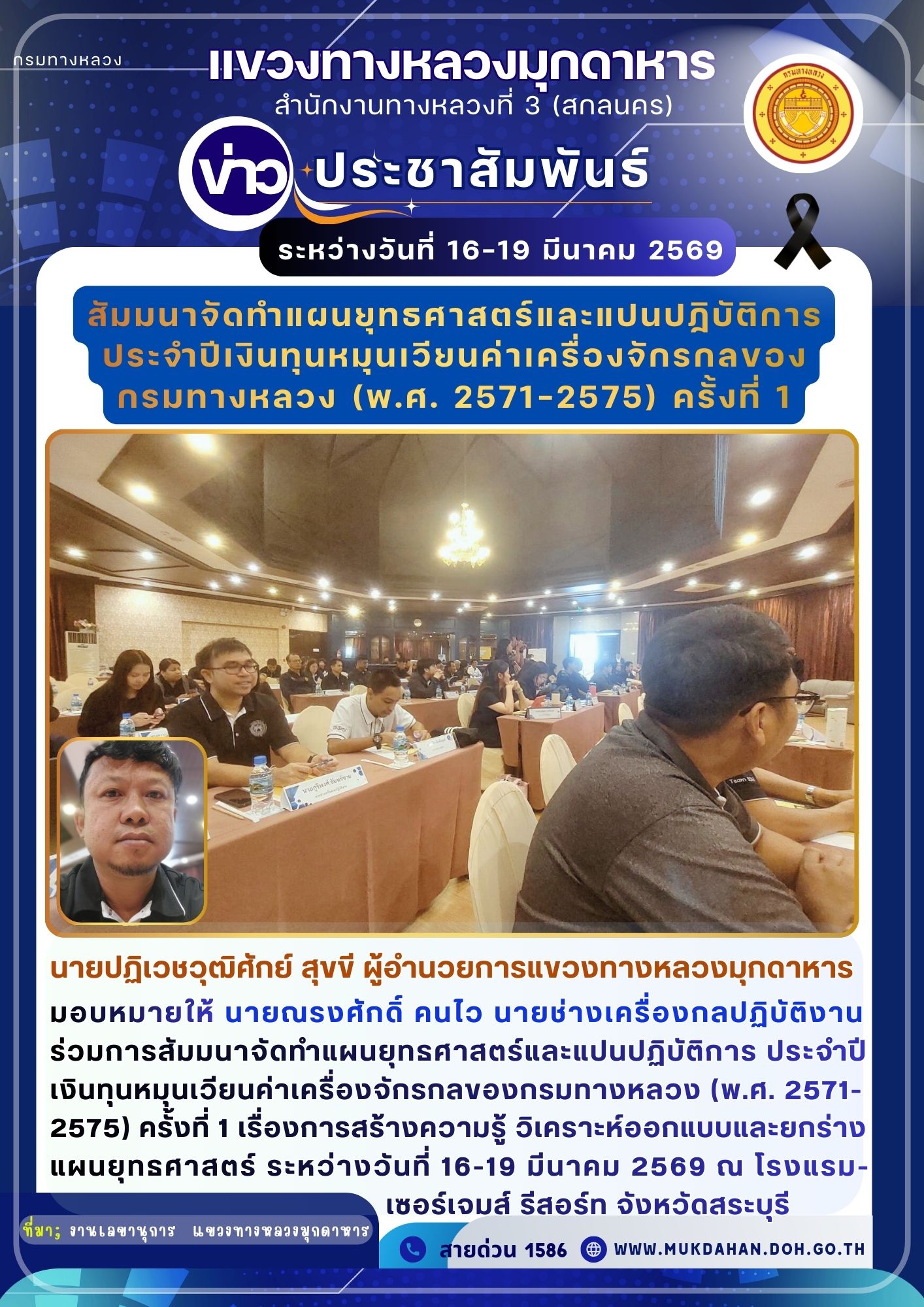 ประจำปีเงินทุนหมุนเวียนค่าเครื่องจักรกลของกรมทางหลวง (พ.ศ. 2571-2575) ครั้งที่ 1 เรื่องการสร้างความรู้ วิเคราะห์ออกแบบและยกร่างแผนยุทธศาสตร์ ระหว่างวันที่ 16-19 มีนาคม 2569 ณ โรงแรมเซอร์เจมส์ รีสอร์ท จังหวัดสระบุรี