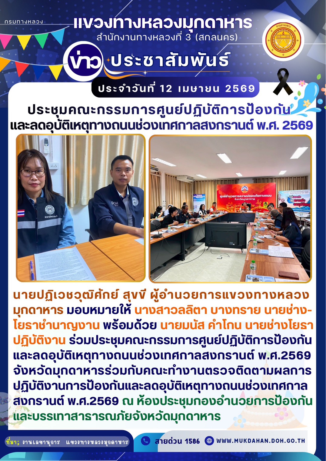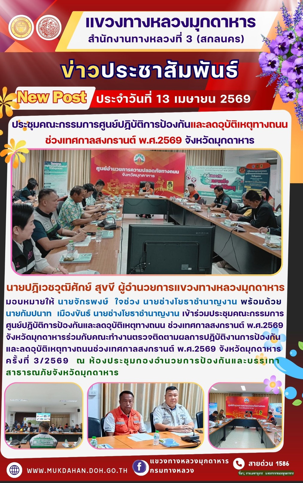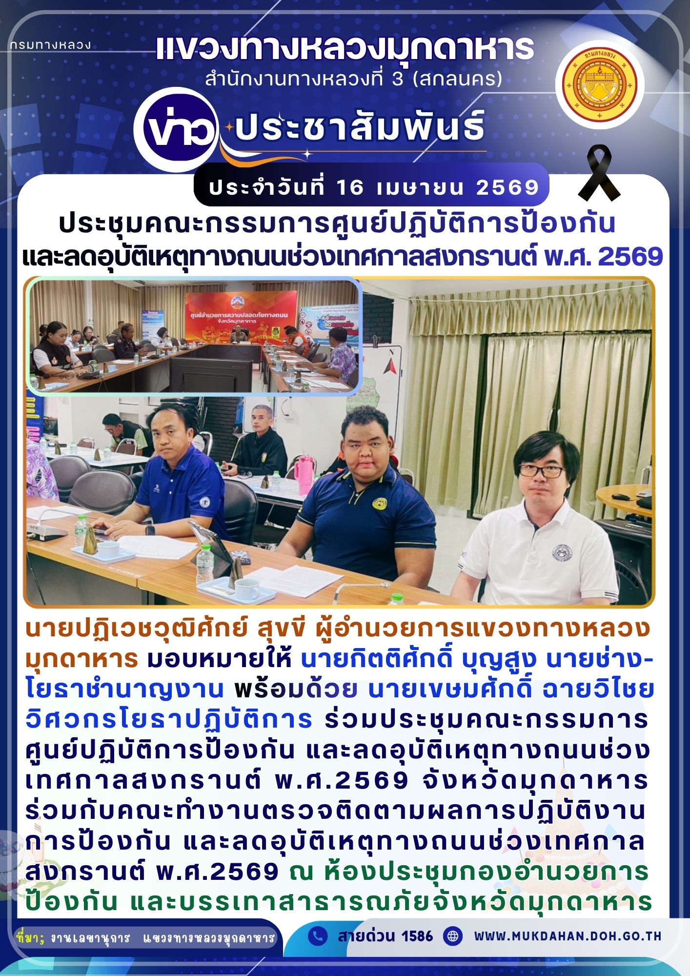 แขวงทางหลวงมุกดาหาร ร่วมประชุมคณะกรรมการศูนย์ปฏิบัติการป้องกัน และลดอุบัติเหตุทางถนนช่วงเทศกาลสงกรานต์ พ.ศ. 2569 จังหวัดมุกมุกดาหาร ร่วมกับคณะทำงานตรวจติดตามผลการปฏิบัติงานการป้องกัน และลดอุบัติเหตุทางถนนช่วงเทศกาลสงกรานต์ พ.ศ. 2569 จังหวัดมุกดาหารครั้งที่ 1/2569 ณ ห้องประชุมกองอำนวยการป้องกัน และบรรเทาสาธารณภัยจังหวัดมุกดาหาร
